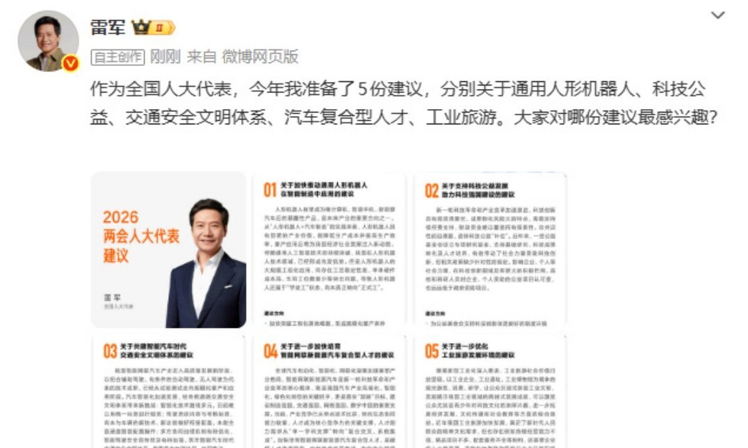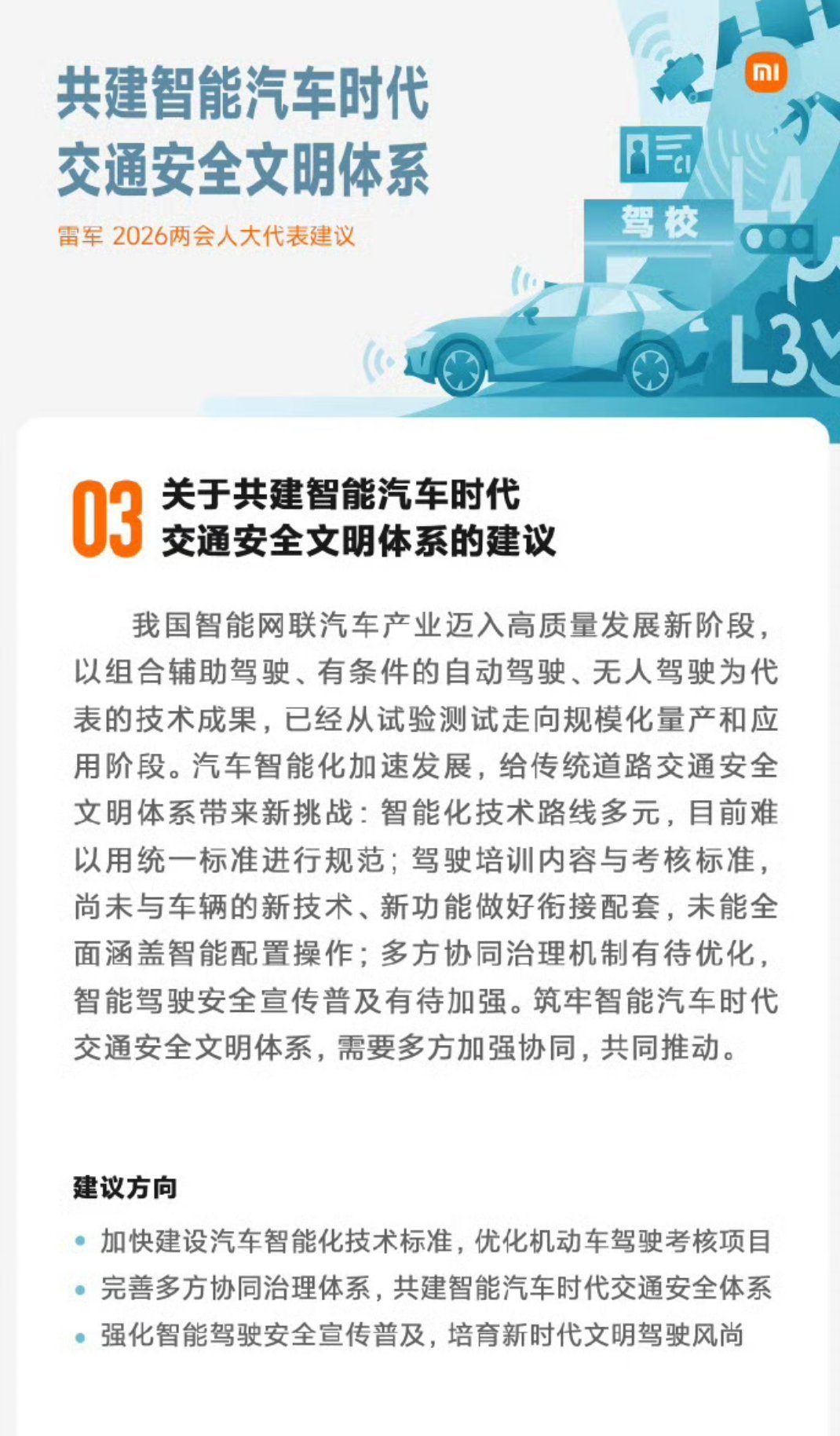 雷军建言把智驾内容纳入驾考全国人大代表、小米集团雷军在2026年全国两会提出推动