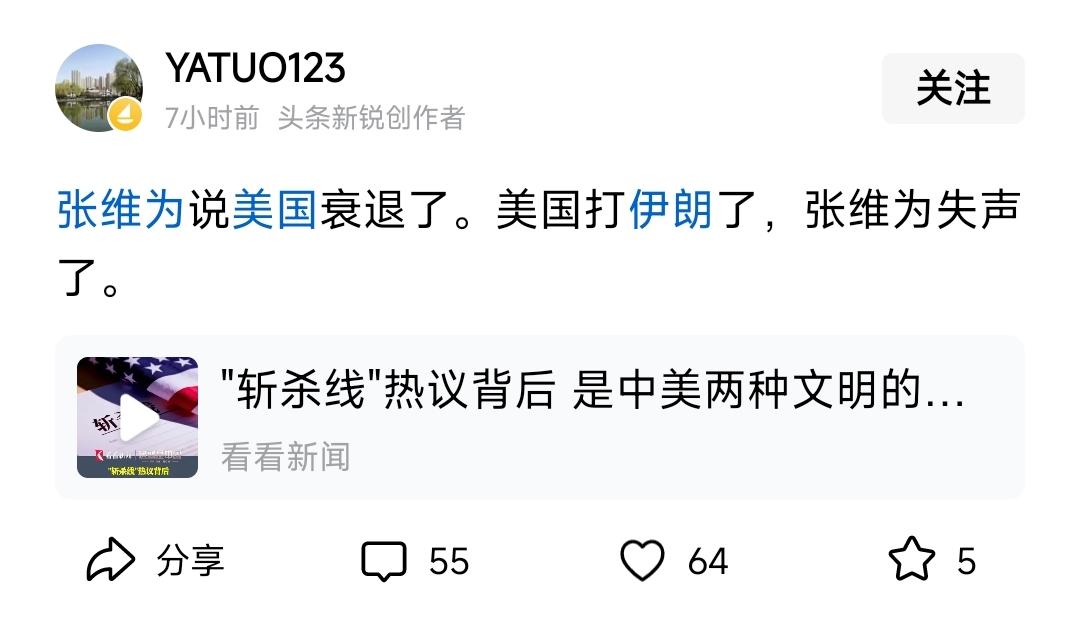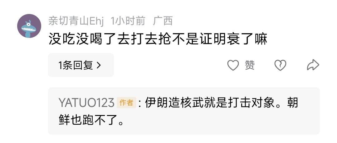 美国打伊朗,这些玩意兴奋的不行。挑着给他的拥趸评论点赞。还期待美国打朝鲜。期待战火烧到中国的,身份认同上绝对不是中国人。现在美国是到处搞暗杀,以前可以直接平推,还不能说明美国衰弱了么?衰弱是个趋势说明,是说美国力量比以前下滑了,可不是说美国现在没有力量了。
