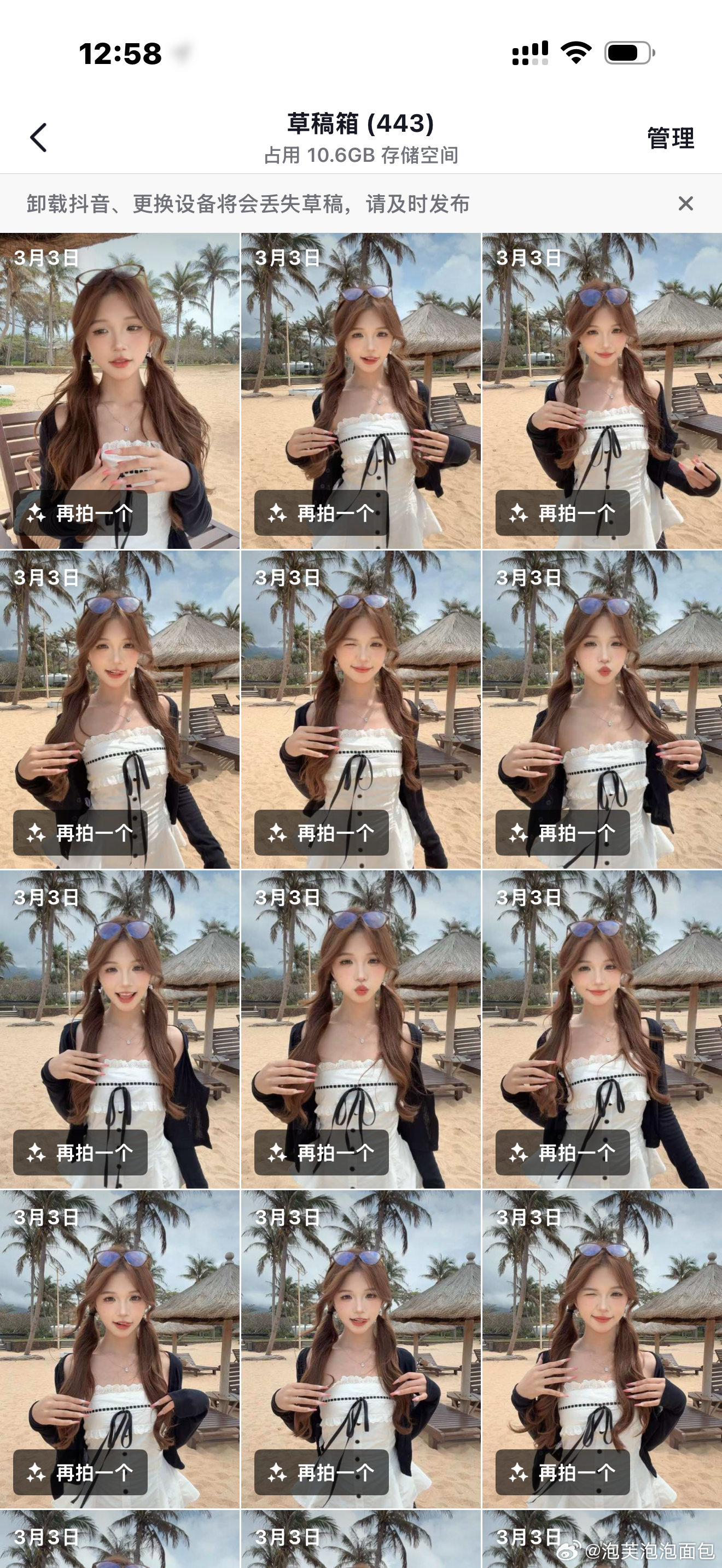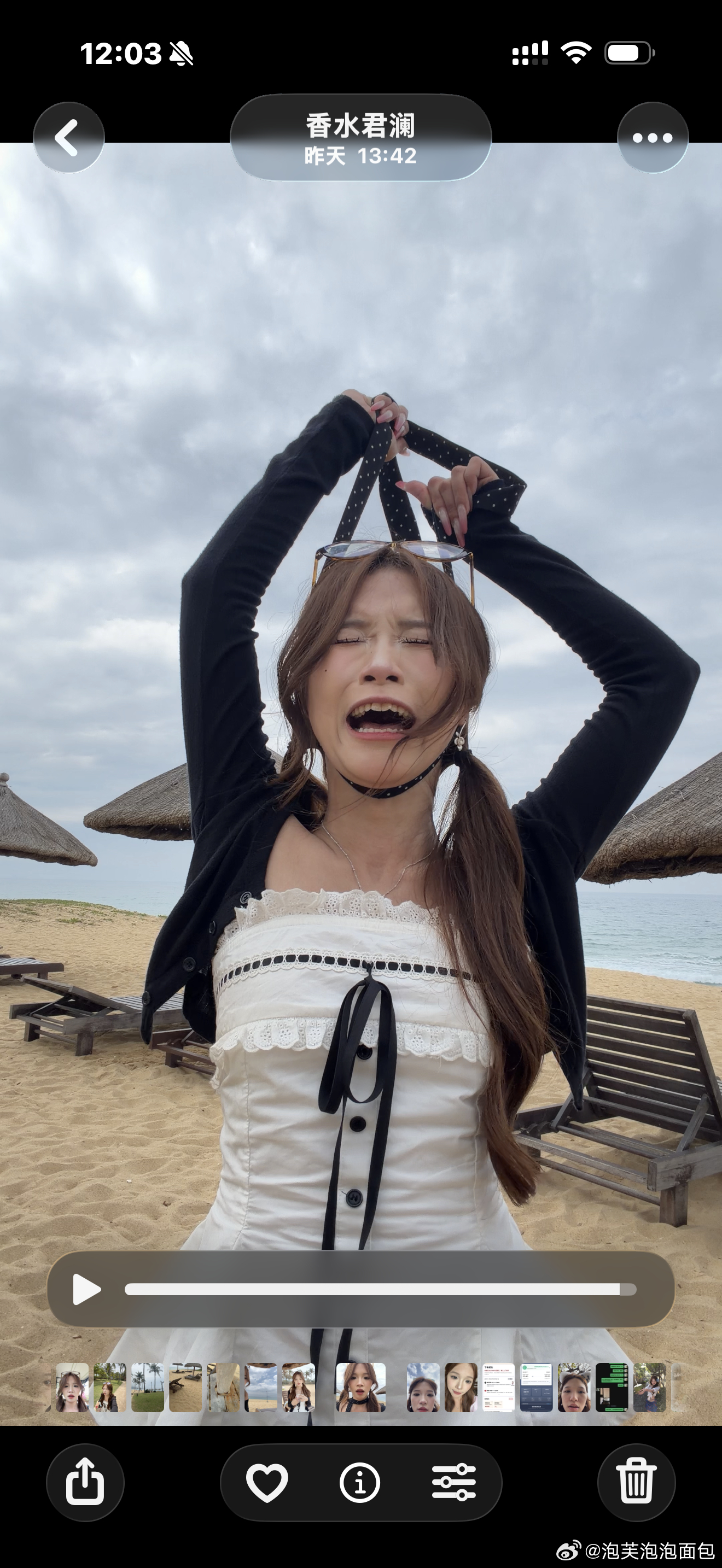 我靠我真的要崩溃了你们知道吗!因为前两天太阳下山了。一直都来不及拍这个衣服!但是第二天又要退房感觉时间来不及。于是我一直没卸妆!直接通宵到第二天早上。就是我们半夜直播跳呲牙舞那天。当时从十二点播到四点多。睡了一个小时直接去看日出。回去又睡了两个小时。他们还在睡觉我一个人爬起来跑到海边去拍视频。结果。。。天气特别不好。特别不好就算了!我想着来都来了拍了快一个小时。到最后才发现脖子上这带子忘记系了。。。全部白拍了!321我跳!米琪吵吵屋