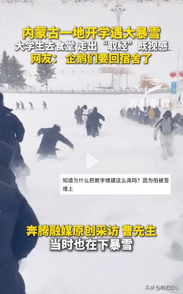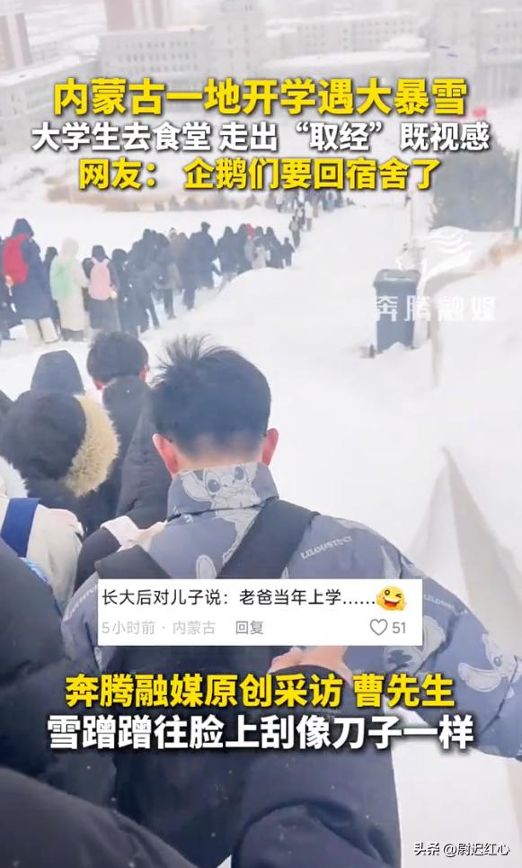 笑不活了!内蒙古呼伦贝尔,开学季遇到极端大暴雪,学生们为了去食堂吃口热饭,在积雪里艰难跋涉,愣是走出了“西天取经”的既视感,网友调侃:这哪是大学生啊,分明是一群小企鹅要回宿舍了。 3月3号,呼伦贝尔的风雪简直疯了,大风卷着雪片子连续下了一天一夜,能见度低得吓人,连不远处的教学楼都快看不清了。亲历者曹先生说,那雪蹭蹭地往脸上刮,就像刀子割肉一样生疼,地上的积雪基本都在半米以上,有些低洼处甚至能直接没到大腿根儿。 为了填饱肚子,学生们也是拼了,大家全副武装,黑羽绒服裹得严严实实,尤其那个穿蓝色史迪仔外套的小哥在雪里特别明显。因为雪实在太深,大家根本没法各走各的,只能踩着前面人的脚印,一个拽着一个,在雪坡上拖出一道长长的、蜿蜒的“人龙”,路边的垃圾桶都被埋了一大半,只剩个顶盖。 看着这群“小企鹅”艰难前行的样子,南方网友觉得这画面又萌又可爱,心疼这些孩子不容易。 但有些网友坐不住了,觉得现在的大学生太“娇嫩”,直言要是放在八十年代,大家伙儿第一件事肯定是组织起来扫雪,至少得先把路清出来,哪能就这么心安理得地在雪里硬蹚呢? 说几句掏心窝子的话,这真不是学生懒,更不是学校不作为。 这可不是一般的落雪,是半米深的极端大暴雪,在这种规模的积雪面前,靠扫帚和铁锹纯属杯水车薪,这种强度的清雪工作,必须得等大型机械进场,否则人进去就是被雪埋。 当时的暴雪还在持续,风大得能把脸刮得直疼,这种天气下组织学生大规模出门扫雪,极易发生冻伤或者失温,作为校方,安全绝对是第一位的。 再说人总得先吃饱肚子才有力气干活,学生们艰难跋涉去食堂,本身也是一种拼搏。 “老一辈更吃苦”的论调真过时了,没必要非得让孩子们在风雪里吃点没意义的苦,才叫“有作为”。 在这白茫茫的荒凉里,那串长长的脚印,就是这群年轻人最热腾腾的生活气。