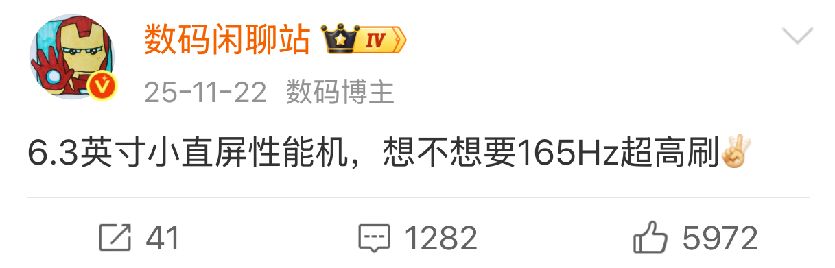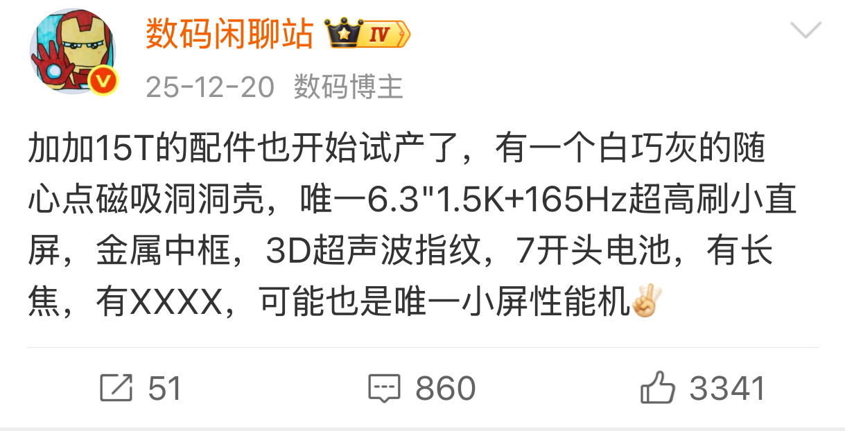 6.32"1.5K+165Hz超高刷小直屏✓行业最窄物理四等边✓3D超声波指纹✓50Mp 85mm潜望小长焦✓百瓦快充头✓无线充✓IP66/IP68/IP69/IP69K✓加加15T现阶段已确定的核心配置