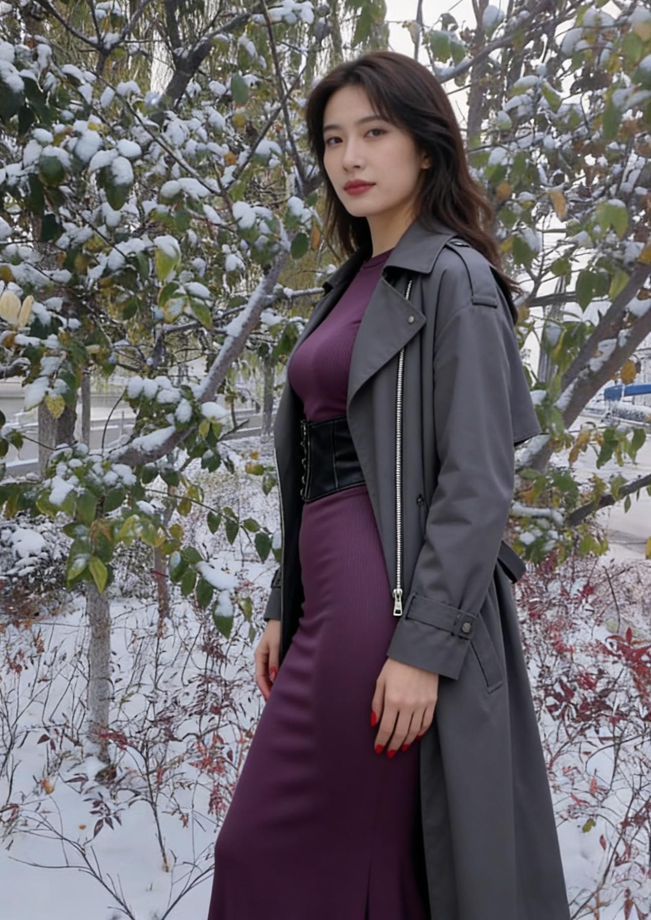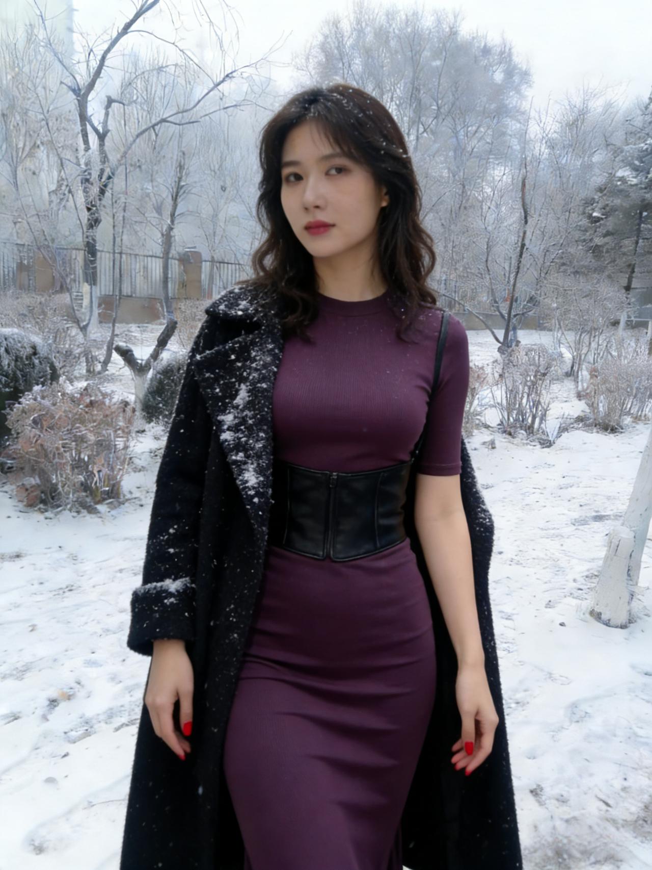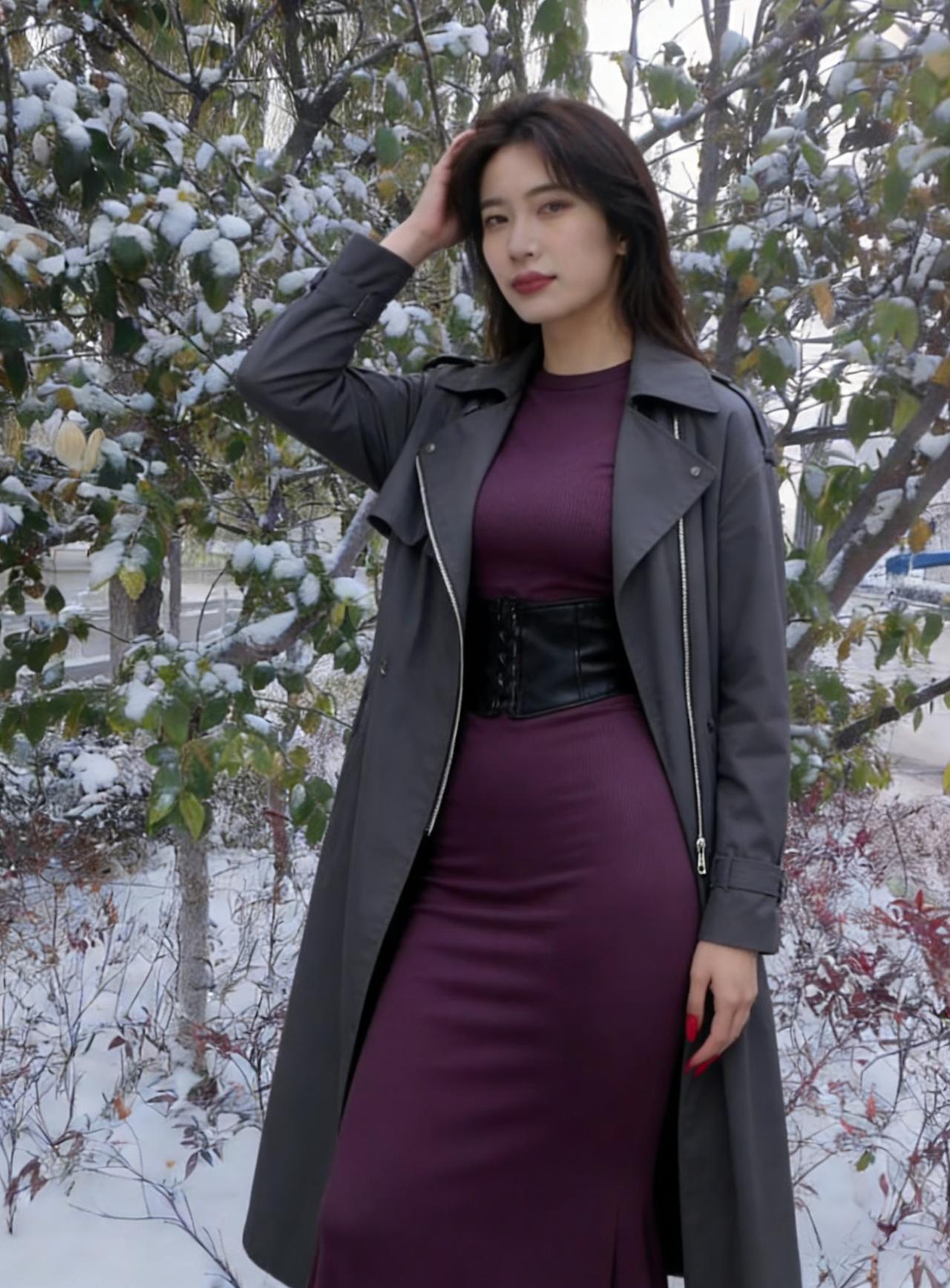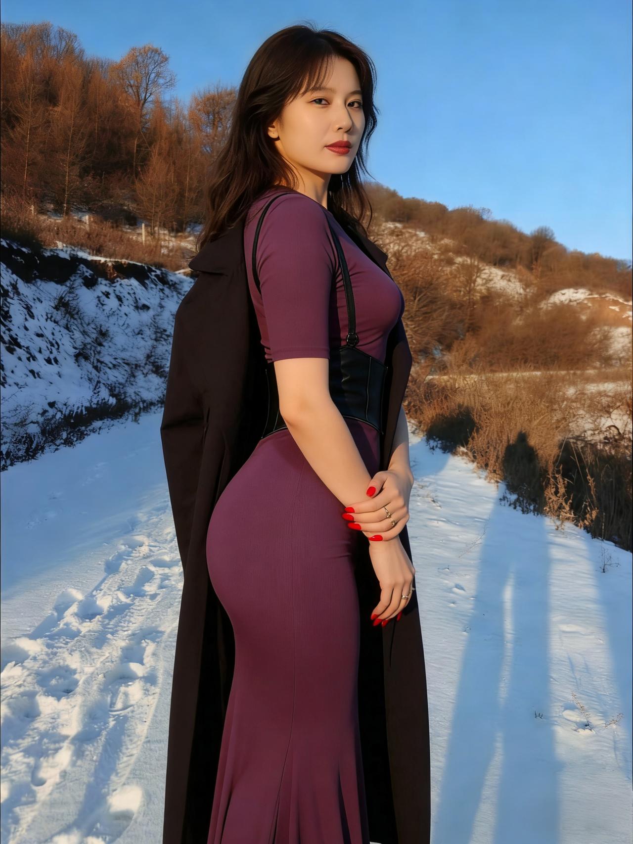 我偏要在雪天,穿紫色的裙, 让白雪做背景,衬我的热烈。 露出来的腰,是向寒冬的挑衅, 腰封勒出的曲线,是自我的宣言。 ~ 管它雪有多冷,风有多尖, 我要让色彩,盛开在荒原, 让自己,成为冬日里, 最炽烈的美艳。 ~ 红指甲是跳动的火焰, 紫裙是彩霞约舒展, 在这片素白里, 我只做我自己。