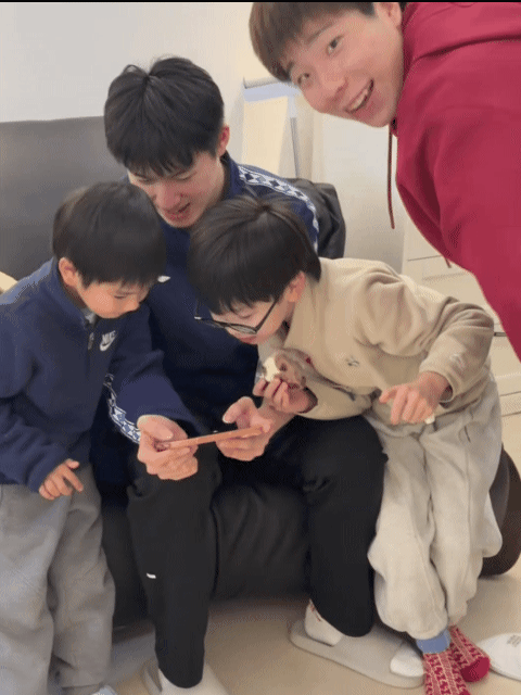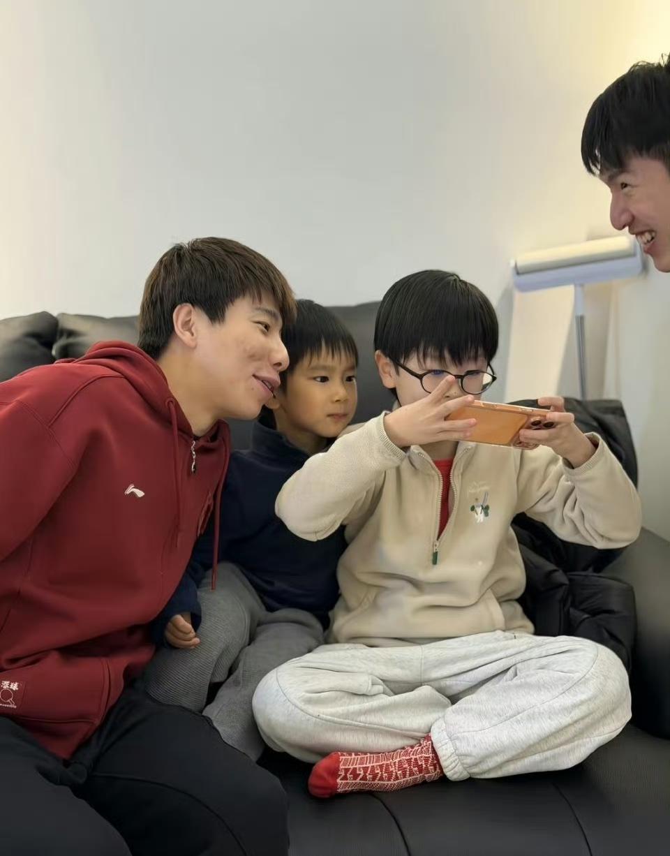 国乒队员温瑞博和徐瑛彬在国乒主力梁靖崑家里和梁靖崑两个儿子互动! 小叔叔们来家里,估计没少给两个孩子过年的压岁钱!两个儿子围在小叔叔们身边,挺兴奋! 而且梁靖崑的两个儿子都越长越精神,老大长相随他漂亮演员妈妈,老二长的更像梁靖崑! 前两天的视频里,两个儿子还在兄弟干仗,现在就又好成一团!果然谁家的兄弟姐妹关系都一样!亦敌亦友!