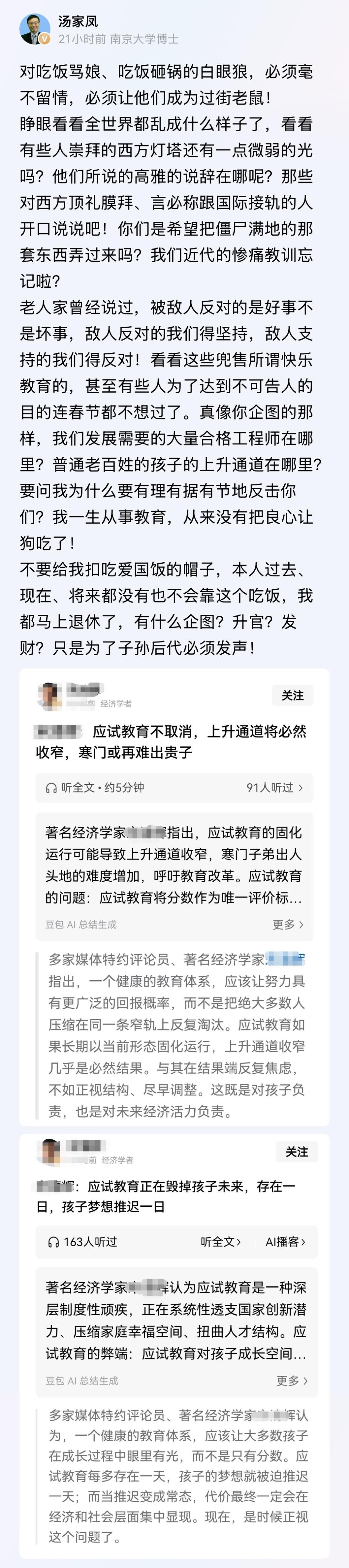 南京大学博士,著名教育专家汤家凤再怼经济学家宋清辉! 白眼狼,吃饭砸锅,必须让他成为过街老鼠,人人喊打。 汤博士说,世界都乱成啥样了,还看得到灯塔国奄奄一息的光芒么? 惨痛教训忘记的挺快,言必称什么国际接轨; 难道还想把僵尸满地的东西弄回来顶礼膜拜吗? 有些人,现在连春节也不想过了,兜售什么快乐教育? 他们是想达到不可告人的目的。 汤博士还怒怼了那些说他是爱国饭的网友; 自己一生从事教育,马上要退休了,从来良心没有被狗吃; 不要扣帽子,自己也不会吃爱国饭,他必须为子孙后代发声。 如果真是快乐教育,宋老师孩子不会出事了么? 宋老师每天出来怼教育制度,说他孩子就是因为应试教育才走了极端,永远离开了。 如果是快乐教育,他的孩子没准能成为一名伟大的画家。 都是教育制度和社会的责任,家长难道没有一点责任么,你有何看法呢?
