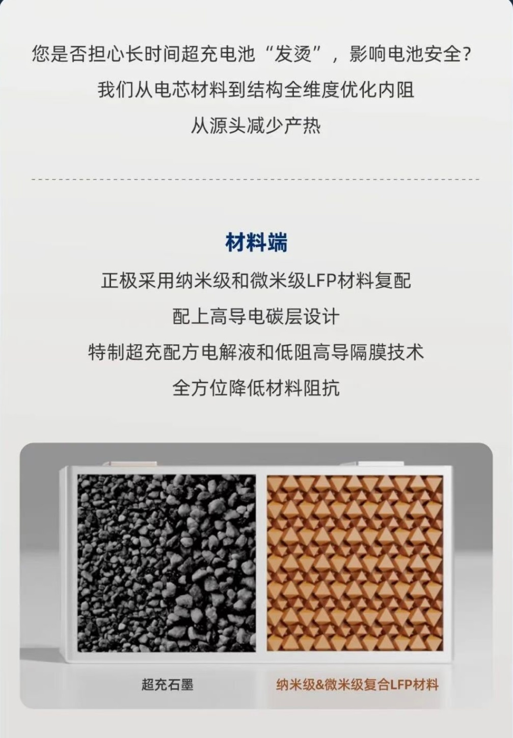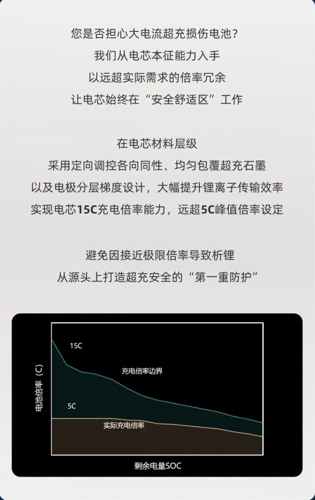 电芯采用叠片工艺,用了纳米级、微米级FLP正极材料,内阻仅为0.36mΩ,从而降低超充发热。具备15C超充能力,安全冗余做到5C~