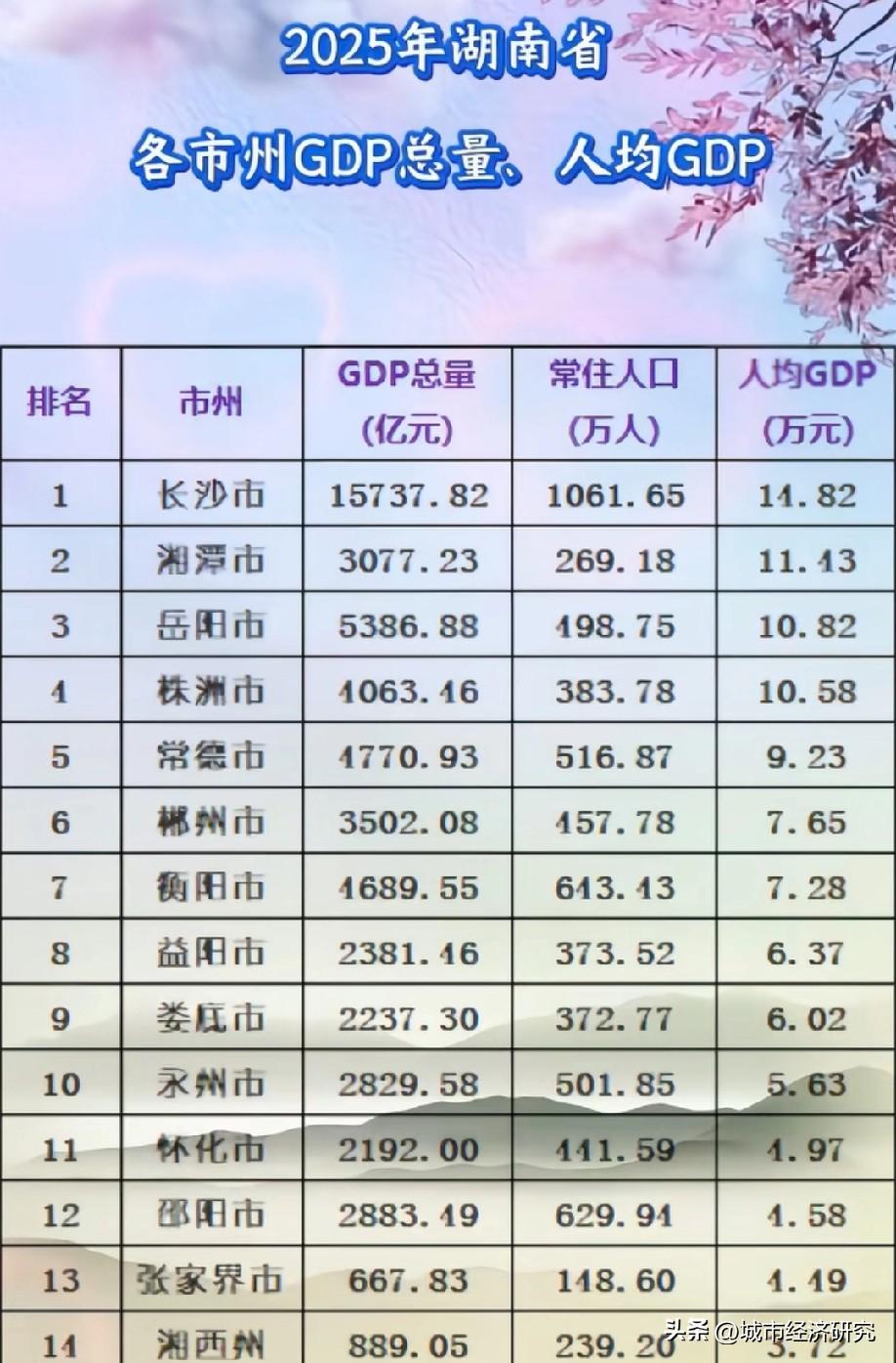 2025年湖南省各城市GDP总量以及人均GDP数据水平情况,湖南省会城市长沙不仅GDP总量高居榜一,并且长沙人均GDP也是湖南各大城市里排名最高的,可见长沙无论经济总量还是人均经济质量水平都挺不错的,湖南的网友们可以看看自己家乡城市2025年的GDP以及人均GDP数据水平情况怎么样。