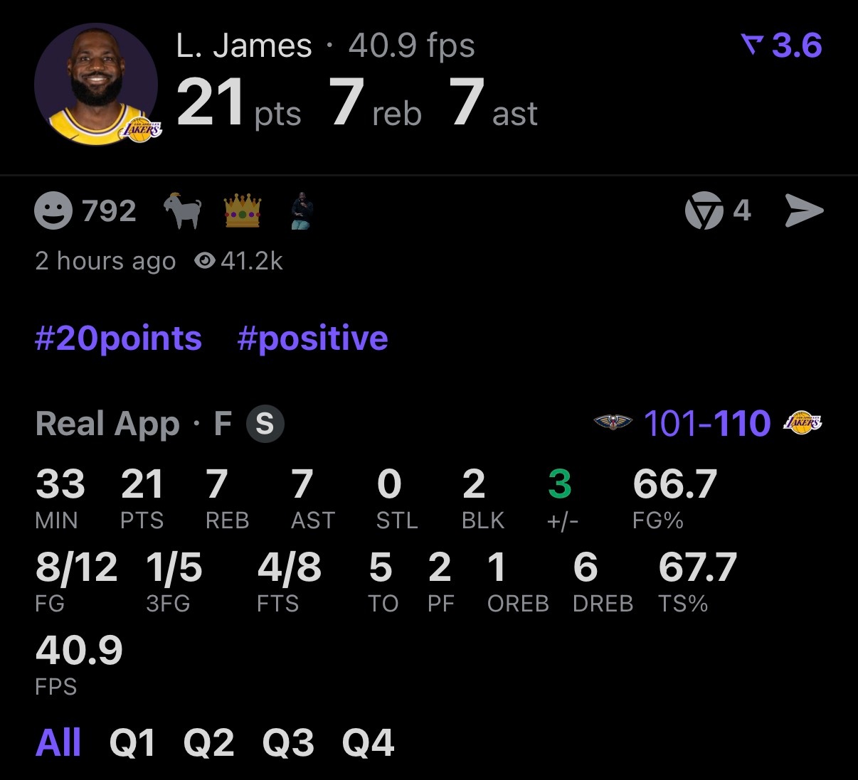 出场33分钟拿下21分7篮板7助攻2封盖,命中率67%,简单高效!
