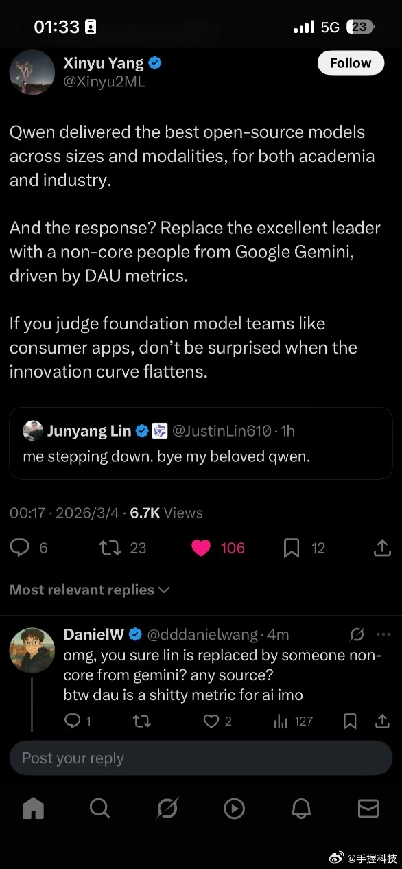阿里千问地震或因Gemini成员空降我看有说是跟内部上线不和。以马老师当年的说法,离职一般就是两个原因,激励没给到位,干的实在不开心,这大概率就是后一种。反正qwen3.5是今年最好的qwen了,它后面大概率出个龙虾,然后基模这一块可能要停一段时间?
