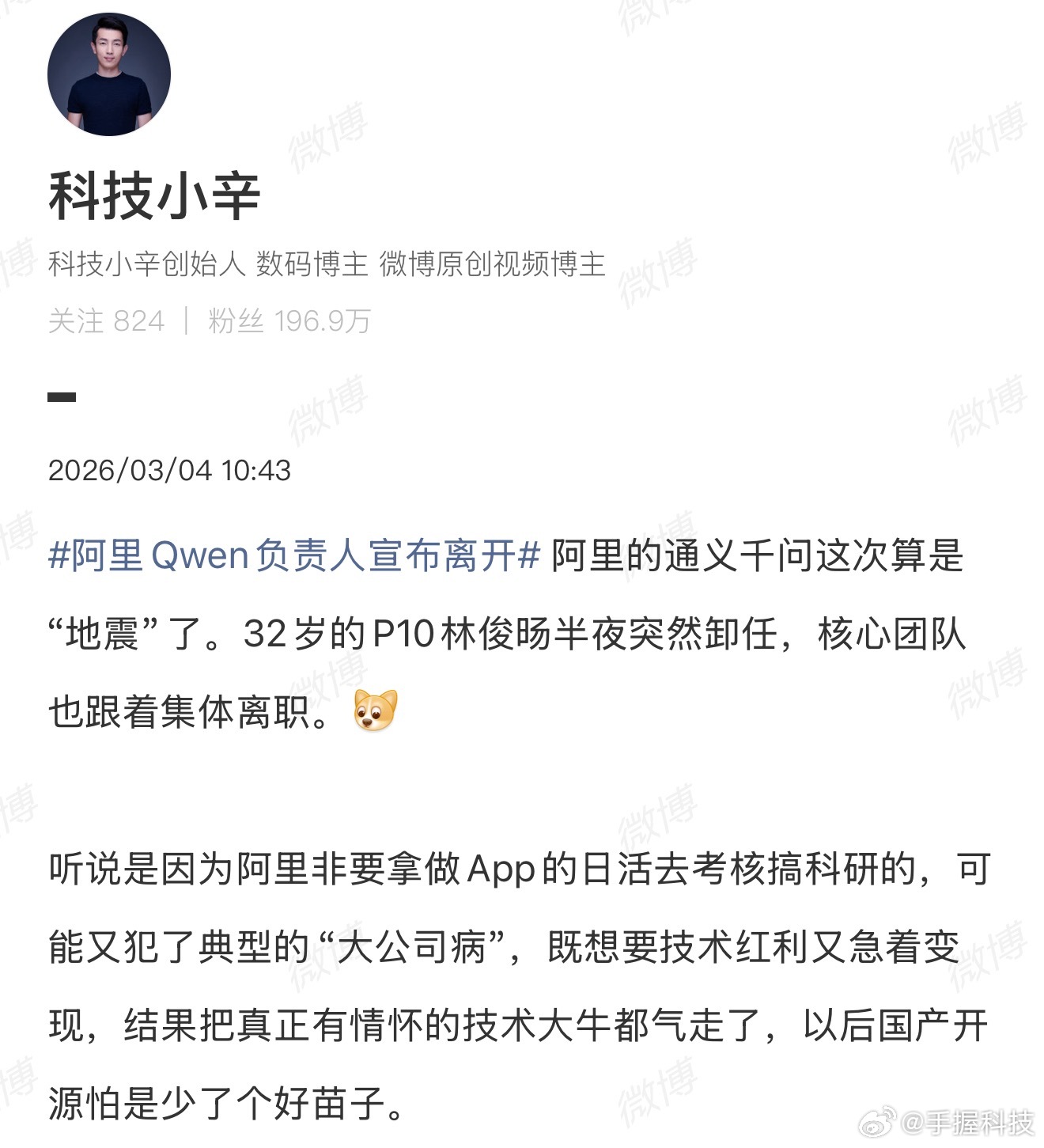 这篇短文分析有一定道理。核心事实是:3月4日,千问技术负责人林俊旸等多名核心成员宣布离职。行业普遍认为,这与阿里AI战略转向商业化考核(如DAU),以及引入前Google Gemini成员导致技术路线分歧有关。这确实反映了技术理想与商业现实的碰撞。