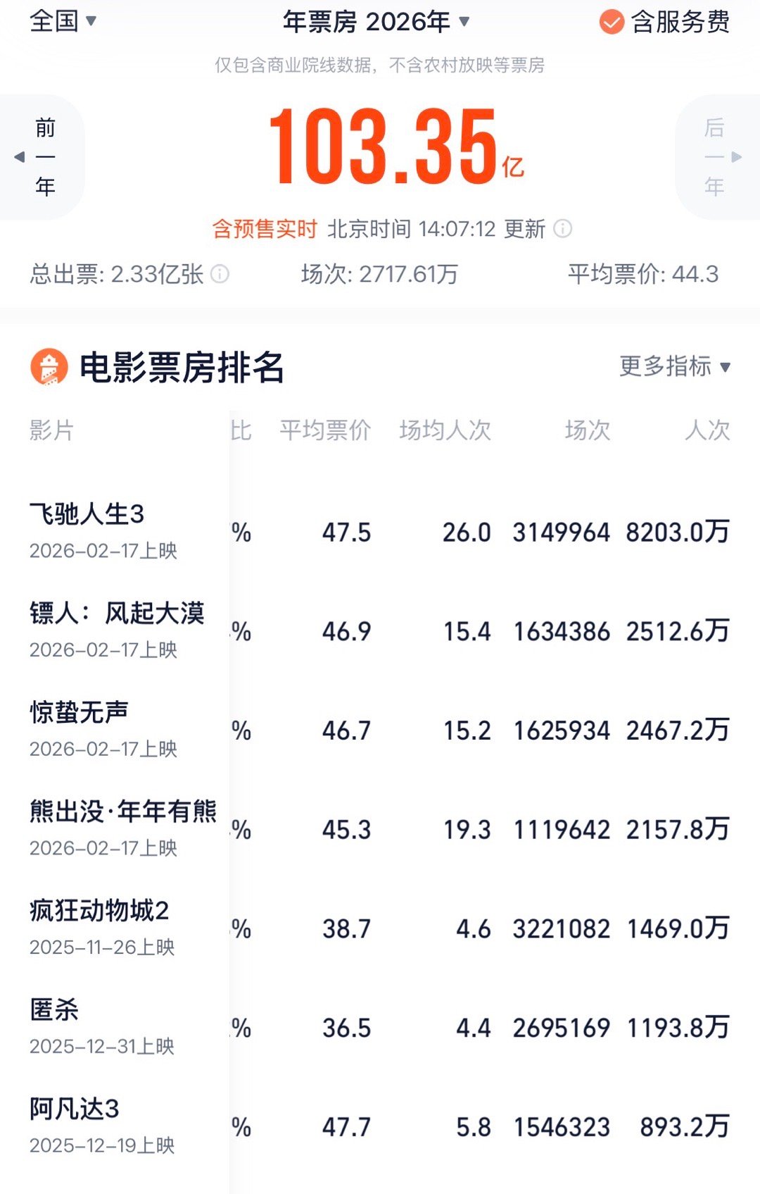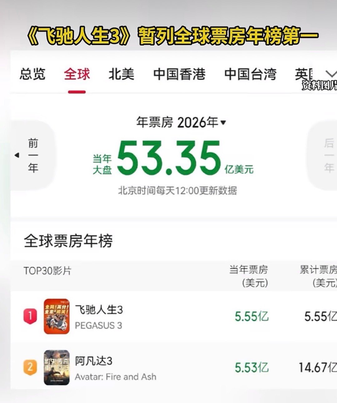 飞驰人生3暂列全球票房年榜第一飞驰人生3冲击中国票房影史前10 据猫眼专业版数据,截至3月3日,电影《飞驰人生3》2026年全球票房突破5.55亿美元,超越《阿凡达3》的5.53亿美元,暂列全球票房年榜第一。该片国内票房超38.93亿,预测总票房44.45亿元,有望冲击中国影史票房前十。