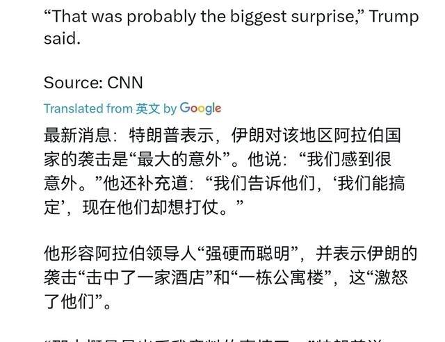 特朗普亲口表示,对于伊朗的反击力度,感到意外!3月2日,特朗普表示,“最大的意外”是伊朗对该地区阿拉伯国家发动的袭击。我们感到意外,我们跟他们说过‘有我们在’,可现在他们偏偏要挑起冲突。阿拉伯各国领导人“强硬且精明”,伊朗的袭击“击中了一家酒店”和“一栋居民楼”,这彻底激怒了他们。 特朗普在2026年3月2日接受CNN电话采访时,直接把伊朗的反击叫作整个冲突里最大的意外点。他当时说,美方原本以为伊朗挨了重击后会低头,或者至少把报复控制在以色列和美军基地范围内,结果伊朗直接把导弹和无人机打向了巴林、约旦、科威特、卡塔尔、阿联酋这些海湾阿拉伯国家。这完全出乎美方预料。特朗普特别提到,美方之前跟这些国家打包票,说有美国在,不会让战火烧到他们头上,可伊朗偏偏就把火引过去了。阿拉伯国家领导人被他形容为“强硬且精明”,本来想保持中立,现在被伊朗导弹打中民用目标后彻底火了,尤其是袭击落在一栋酒店和一栋居民楼上,直接把当地民众情绪点燃,也让这些国家领导人坐不住了。 这件事暴露出来的核心问题是,美国对伊朗反制力度的判断出现了明显失误。美以联合空袭伊朗的时候,目标是导弹基地、指挥所和部分核设施,行动中伊朗最高领袖哈梅内伊丧生,多名高级将领也被清除。华盛顿和特拉维夫当时算的账是,伊朗失去这么多关键人物后,内部会乱,外部会怂,顶多象征性还几下手,然后坐下来谈。可现实完全不是这么回事。伊朗不但没退,反而把报复范围扩大到整个海湾地区,用弹道导弹和无人机群打出了跨国打击。这让美国事先画好的保护圈直接破了个大洞。 特朗普嘴上喊意外,其实等于承认美方低估了伊朗的决心和能力。伊朗这次反击不是简单泄愤,而是有明确战略意图:把战火外溢,让海湾阿拉伯国家也尝到代价,逼他们不敢完全站到美国一边。阿拉伯国家最怕的就是自家地盘被卷进去,经济、油气、旅游全受影响。现在导弹真的落下来了,这些国家表面上谴责伊朗,私下里却开始重新盘算跟美国的距离。特朗普想拉他们一起对付伊朗,可阿拉伯国家算的账很现实:跟伊朗硬碰硬,损失只会更大,还不如两边都不得罪,保住自家安全和生意最要紧。 从更广的层面看,这件事说明美国在中东的保护伞已经没以前那么牢靠了。过去几十年,海湾国家愿意掏钱买美国武器、驻军基地,很大程度上就是相信美国能挡住伊朗。现在伊朗导弹能打到他们境内民用目标,美国的防空承诺瞬间成了空话。沙特、阿联酋这些国家开始加速发展自己的导弹防御系统,也在跟中国、俄罗斯谈更多军售和技术合作。特朗普想通过强硬姿态重新立威,结果反而让地区国家看到,美国的军事优势在局部冲突里没想象中那么压倒性。 伊朗的反击力度之所以让特朗普意外,还有一个原因是情报和战略评估的偏差。美方以为伊朗的导弹库存和指挥链在首轮打击后会大幅削弱,实际伊朗保留了足够的机动发射平台和地下设施,能在短时间内组织多波次饱和攻击。这波操作不光打疼了以色列和美军,还把阿拉伯国家拖下水,等于把冲突从双边对抗变成了地区性危机。油价因此大幅波动,霍尔木兹海峡航运风险上升,全球能源市场跟着紧张。 特朗普现在面对的局面很被动。一边是国内要求尽快结束行动的声音,一边是盟友施压要加大力度,阿拉伯国家又不完全配合。他公开说行动还会持续几周,目标是彻底削弱伊朗军事能力,可伊朗还在持续发射导弹,针对美军基地和沙特境内目标的攻击也没停。冲突已经造成伊朗数百平民和军方人员伤亡,美军也有士兵阵亡。特朗普多次表态要为阵亡士兵报仇,但地区局势越拖越复杂,停火谈判短期内看不到明显进展。 说白了,特朗普这次“意外”喊出来,其实是给美国误判找了个台阶,也是在提醒自己和团队,中东这盘棋远比表面看起来难下。伊朗没按剧本走,阿拉伯国家也没按预期站队,美国想单方面掌控节奏已经不太现实了。整个事件让外界看到,美国在中东的影响力正在被现实一点点蚕食,而伊朗通过这次反击,至少在短期内把战略主动权抢回了一部分。