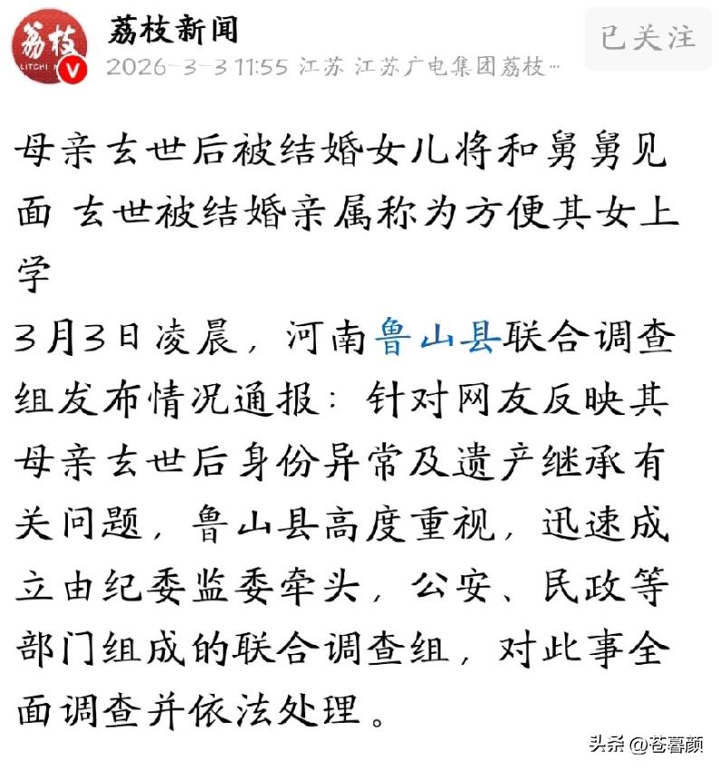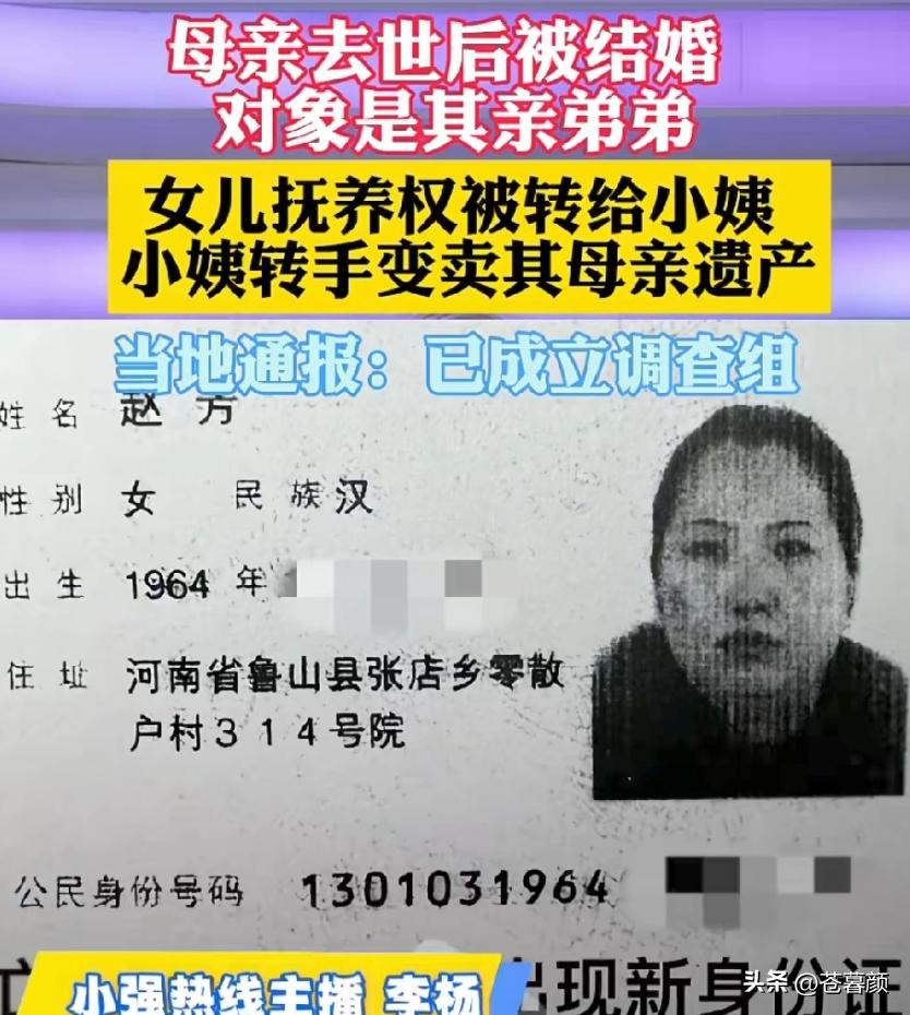 这是要吃绝户!河南平顶山,母亲去世后,9岁女儿的抚养权被转给小姨。10年后,女子得知母亲有房产和商户等,希望继承母亲遗产。谁知,办理手续时竟发现,母亲去世第二年,竟然被结婚,结婚对象是自己的亲舅舅,户口也没有被注销,变成了舅妈的脸。更可恶的是,母亲去世才14天,小姨就顺手变卖了母亲留下的房产。网友惊呼:这是真正的吃绝户呀! 2018年的一个下午,公证处的电脑屏幕发出刺眼的白光,19岁的孙艺菲站在玻璃窗外,紧紧盯着办事员递过来的档案文件,她看清楚上面的字后,全身僵住了。 文件上写着:她母亲赵芳在2009年12月办理了再婚登记,这完全不可能,赵芳在2008年12月3日去世,骨灰已经放了一年,一个死人怎么可能跑去民政局领结婚证? 更荒谬的是,结婚证上的新郎不是别人,正是孙艺菲的亲舅舅赵功品,旁边的女方照片则赫然是她的大舅妈,这张伪造的结婚证像一记重击,直接打破了孙艺菲十年来依赖的温情假象。 时间要倒回十年前,2008年冬天平顶山医院的病房里弥漫着刺鼻的药味,赵芳因败血症抢救无效,最后一口气断绝,当时孙艺菲只有9岁,连母亲的葬礼都没被允许参加,就被小姨匆匆带走。 小姨手里握着提前准备好的公证文件,把抚养权死死控制在自己手里,随后形成了一套完整的隔离操作:切断孙艺菲与父亲的所有联系,为什么要这么做? 答案在赵芳留下的一套石家庄房产里,赵芳去世仅14天,也就是2008年12月17日,一份凭空捏造的委托书被堂而皇之地走完了全部手续。 石家庄的房子很快挂牌出售,房款直接转入了小姨的个人账户,这笔钱虽然到手,但始终不踏实,只要赵芳的死亡证明仍在系统中,这出移花接木的把戏迟早会被揭穿。 于是,一场荒诞的“户口大挪移”开始了,一个死人的户口居然被跨省平移,从河北石家庄直接转到了河南鲁山,不仅如此,户口本、身份证,甚至死亡注销证明上,大舅妈的照片都替换了进去。 能把公安户籍系统和民政婚姻登记系统同时改造成自家后花园,一般人根本不可能做到,而幕后主使之一正是孙艺菲的舅舅赵功品,当时担任鲁山县政法委副书记。 手握公权力的舅舅,配合精打细算的小姨,一个在体制内控制信息,一个在体制外操作财产,形成了完美的掠夺组合,这已经不是普通的家庭纠纷,而是一场针对孤女的系统性掠夺。 十年来,孙艺菲在小姨和舅舅家轮流寄宿,每当她问起母亲遗物,得到的回应永远是:“等你长大再说”,如果不是2018年孙艺菲去办理继承手续,这场长达十年的侵占可能永远不会被揭露。 漫长的拉锯战耗尽了她的童年和青春,但纸永远包不住真相,今年3月3日,孙艺菲提交实名举报,这桩案件终于被揭开,舆论迅速发酵,24小时内平顶山鲁山县发布了官方通报,多部门联合调查组立即成立。 法律条文清楚明白,《刑法》第二百八十条规定,伪造身份证和户口信息足以判三到七年有期徒刑,那些通过造假手段骗来的房款和首饰,在法律面前都是非法侵占和不当得利。 历史上,类似上海傅女士被丈夫卷走动迁款的案例都留下了血泪教训,不管时代如何变化,打着亲情幌子的掠夺总是最残酷,小姨和舅舅不仅践踏了监护制度,更将法治尊严踩在脚下。 联合调查组的案卷已经展开,孙艺菲等了整整十八年才迎来彻查的开端,原本保护弱者的审核机制,当年失职,如今必须彻底补救。 被算计走的黑钱还有可能追回,但那个9岁女孩被剥夺的十年时光,没有人能替她夺回,这群穿着体面衣服的成年人,用权力和贪婪毁掉了一个孩子的童年。