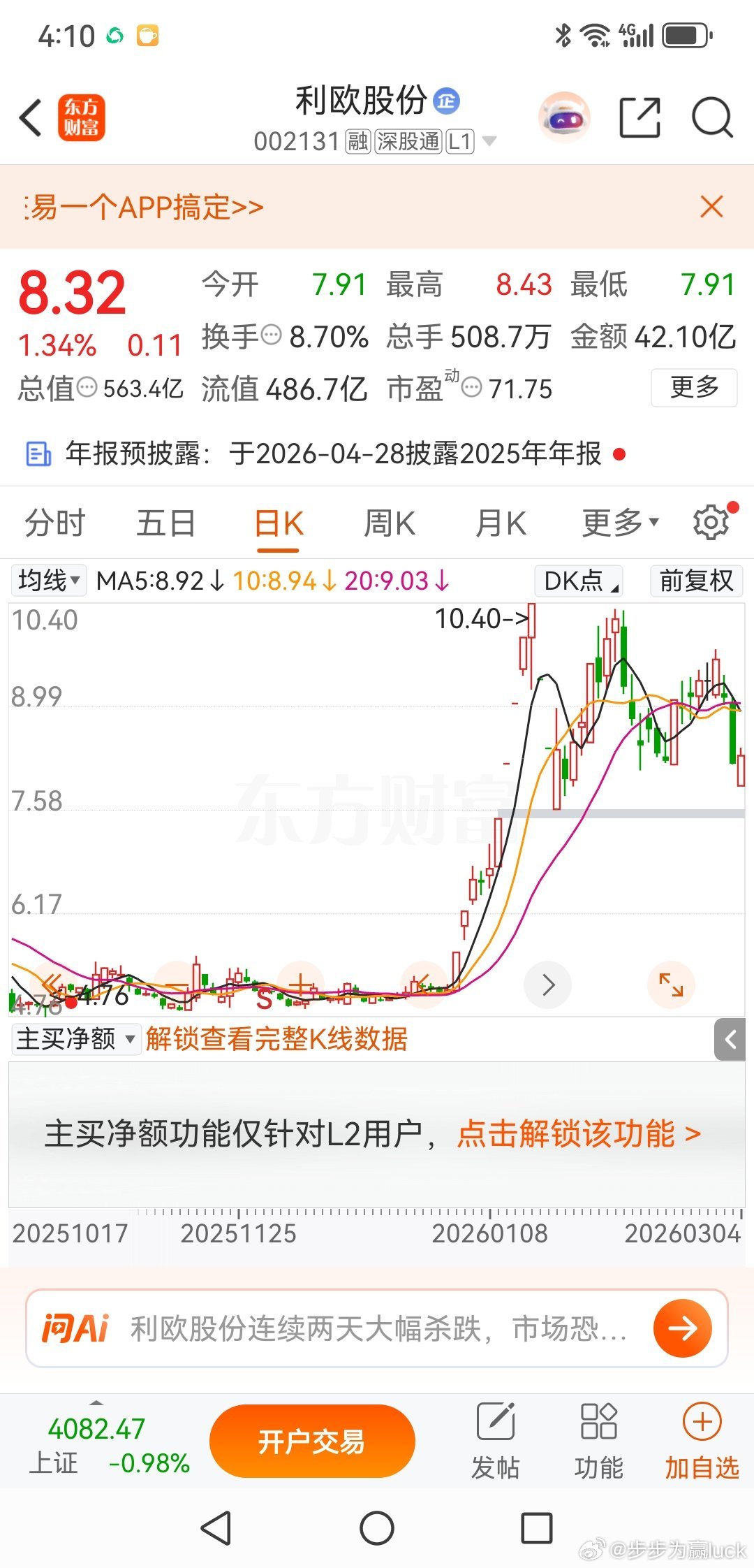 利欧股份,叫停预期计划利欧股份,2月12日涨停然后沿着5日均线震荡上行,每天成交百亿级别,我是认为他有上攻10.4元的潜力的。我是有想法上车的,但是由于我不喜欢追高,我想等他挖坑在介入,但现在一看必须叫停了。本来3月2日,有群友见到有调整,问是否介入?我的回答,是虽有操作计划,但是跌幅超过规定的,暂不介入。因为我们有规定,股票的买点应该限制在正负3个点之内,而利欧股份开盘一小时的跌幅就达到6个点,显然超出了范畴。昨天大盘跌了60个点,他老人家来了个跌停,今天盘中一度三千家上涨,但是他的反应也是平平。结合当下的大盘情况,我决定叫停预期买入计划,买入点需要在正负3个点之内的交易制度再度保护了我。目前大盘到底是中期走弱还是利空砸了个坑,在我这了尚未有定论,本着不买不亏钱的原则,我叫停除银行外的所有买入计划。欢迎加入我们的免费交流群财经股票