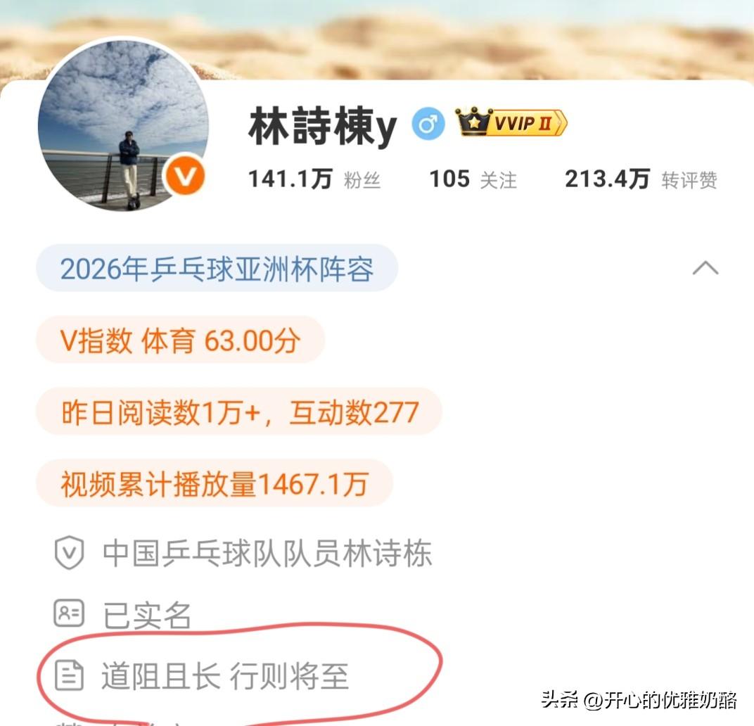林诗栋换头像和签名,鼓励自己重新出发。 头像是站在蓝天白云大海边, 签名是“道阻且长,行则将至”。 从头像和签名看,林诗栋长大成熟了。 一年的失败和并没有击垮他,而是让他看到自己当前的不足,知道想要再次登顶需要时间和勇气。 林诗栋终于敢面对现在的自己,知道不是一句加油就可以,必须要改变和提高技战术。 都说外协在涨球,看看大满贯陈垣宇拿下雨果,王楚钦轻松拿下小勒布伦,就知道要想赢,就必须你强我更强。 林诗栋从去年大满贯三冠王,到今年的男单八强,男双亚军,确实是道阻且长,加油林诗栋,只要你够努力加油,一定会逆风翻盘的。 图片来自网络侵权可删。
