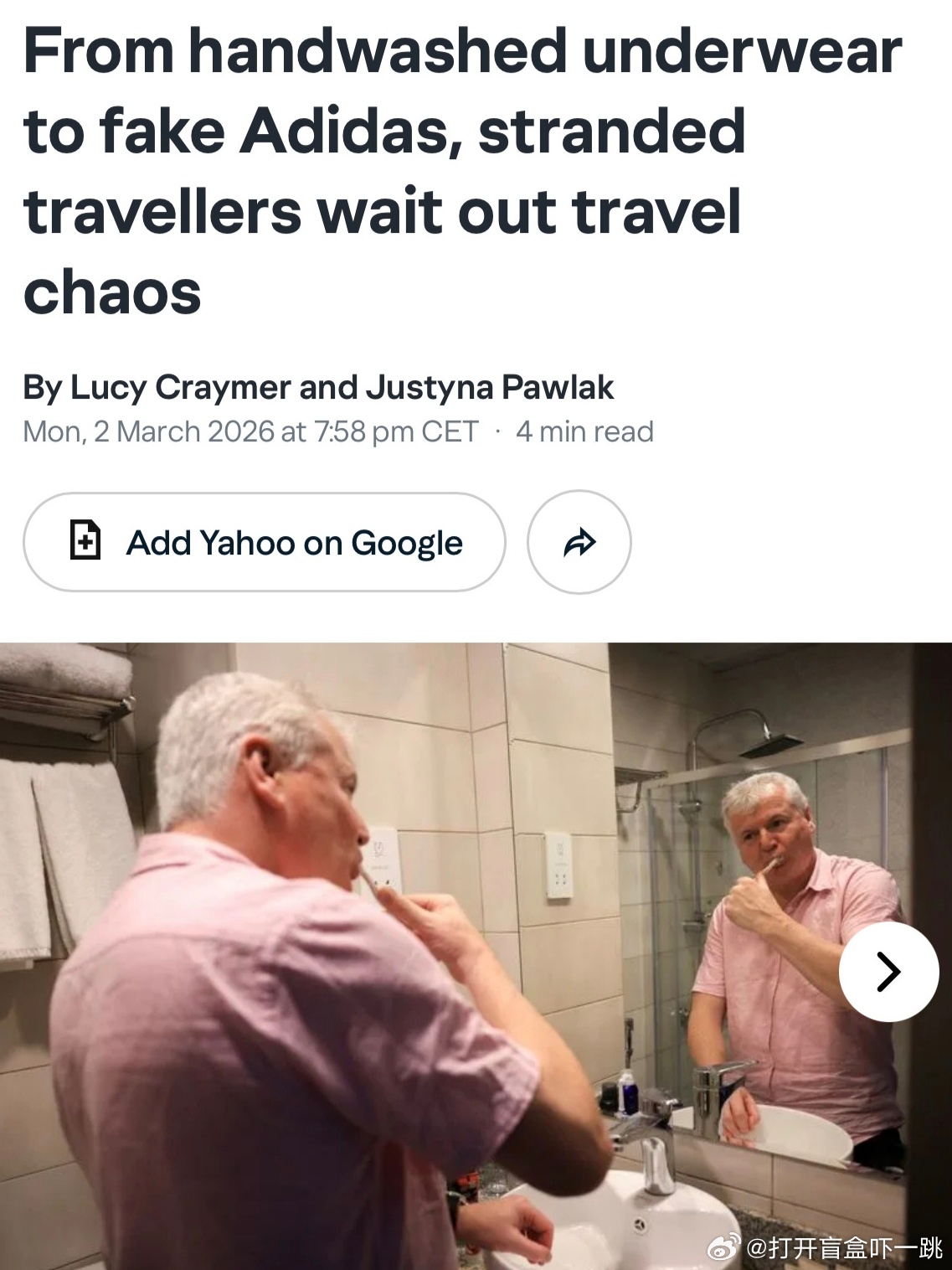 路透社这期中东机场滞留旅客新闻特写实在太典了,说是各国旅客都因为被困在机场周边酒店缺少替换衣袜与换洗内衣而表达出了不同程度的焦虑。多哈机场甚至出现了滞留旅客清一色全穿假冒阿迪达斯T恤的情况,因为酒店旁边的服装店只能买到这种衣服,以至于现在假冒阿迪达斯T恤被称为“滞留制服”。唯有印度游客心情不错,他们因为航班取消而被困在迪拜机场,最初也挺焦虑,但得知迪拜机场提供免费食宿后立时大悦,纷纷表示:迪拜机场大义,这波滞留对于自己不构成任何问题。离谱事件新星闪光计划魔金石科技