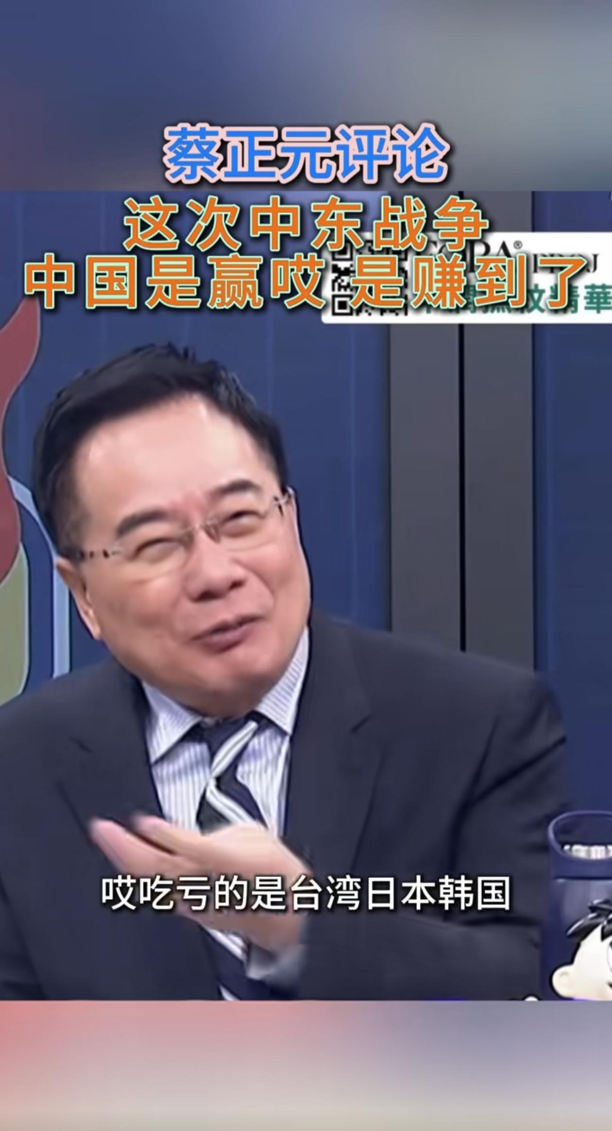 蔡正元说伊朗和美以的战争中国赚了赢了,吃亏的是韩国日本。伊朗封锁了霍尔木兹海峡,而韩国和日本90%的石油运输要从这里经过,确实影响很大,日本甚至又说到了生死存亡的事态,但中国怎么赚了赢了呢?中国没有向伊朗卖武器啊!而且对我们的油轮也有影响,要说赢,我们赢得的是一种尊重和地位,德高望重,富有正义。