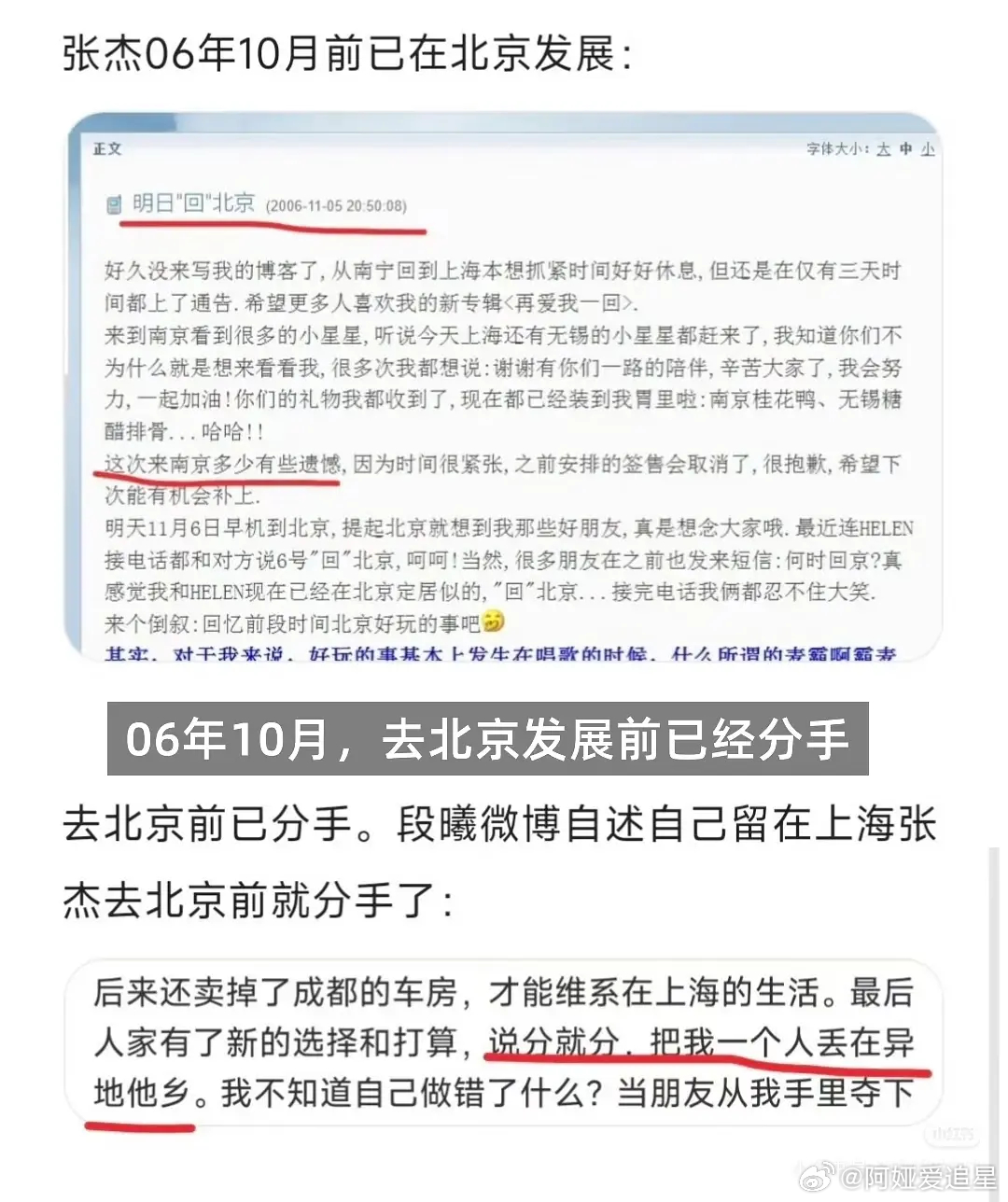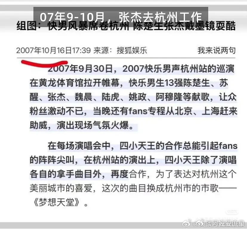 06年10月,张杰去北京发展前已经分手(P1)06年10月底,张杰在北京通过何炅沈凌认识谢娜(P2)06年11月,张杰曾表示自己是单身(P3)07年1月,谢娜倾诉正在暗恋张杰(P4)07年7月,快男四进三,两人还没在一起(P5)07年9-10月,张杰去杭州工作,两人正式决定交往(P6和P7)