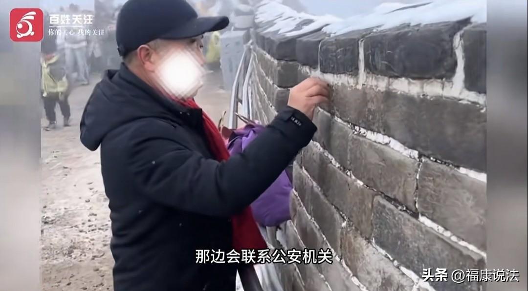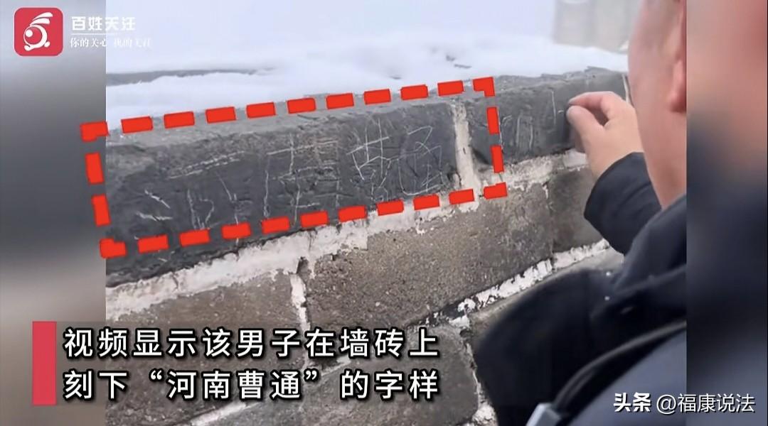 “河南曹通”你火了!北京,一老年男子在八达岭长城墙砖上刻字:河南曹通,等字样,被其他游客偷拍下视频,男子却毫不在意。景区工作人员对此作出回应。网友:一把年纪还做这么不着调的事! 八达岭长城上,一穿黑色羽绒服,脖子上挂着红色围巾,戴着鸭舌帽的老年男子,手里拿着石头在城墙砖上用力的刻着字…… 有游客好奇,上前一看,男子在墙砖上刻的:“河南曹通”等字样。 男子旁若无人的一笔一划的写着,根本没在意周围游客异样的的目光。 游客也不敢上前劝,更不敢吱声,万一这人不讲道理呢?正常谁也不愿意因为这事与其纠缠。 这位老人穿的人模人样的,可做的事情实在不光彩,他一笔一划在城墙,看着黑色光滑的墙砖,被划上一些没必要的字,不仅影响美观,也遭到了一定破坏,真的让人心疼。 有的游客看不下去,因为怕惹麻烦,并不敢上前理论,只是拿手机偷偷把这一幕拍了下来…… 事后,这段视频被传到网上,获得许多网友关注,纷纷表示为什么要毁坏文物? 有人说,长城是文物,乱刻乱画,等于损毁文物,要重罚,罚到倾家荡产。 也有人说,有些人就是想不明白,既便允许你把自己的名字刻上去,刻完了,人走了,后来者,有谁认识你是谁呢。如果有如,李白,苏东坡等那些大家诗人,留与世上诗一首,还算值得,有名无内容,何用之有。 还有人说,“好汉”垂暮,没一点文物保护意识。最好把户籍所在地也写下来,方便查找。 也有人提问,游客都已经发现,为何不立即制止呢?是真心为保护长城,还是静等形成罚款事实? 有人回答,谁敢劝,上去制止可能会被骂,拍视频就是先取证,也警示那些行为不端的人。 3月3日,记者联系八达岭长城景区,工作人员称。会对这种行为进行处罚。 而且,工作人员表示,在进安检的时候都会有广播提示,不允许乱刻乱画,而且,保安也会巡查。 他们会将此事上报给长城管理处,也会报警,对该男子进行处罚。 因为男子在城墙砖上刻下了他的名字,现在都是实名制,找人很容易的。 目前,八达岭长城管理处表示,正介入处理此事。 八达岭长城那可是咱们国家珍贵的文物和名胜古迹,承载着悠久的历史和文化。在长城城墙上刻字,这可不是小事,这是对国家保护文物的故意损坏行为。 《治安管理处罚法》第63条规定:刻划、涂污或者以其他方式故意损坏国家保护的文物、名胜古迹的,处警告或者二百元以下罚款;情节较重的,处五日以上十日以下拘留,并处二百元以上五百元以下罚款。 法律明确规定了这种行为要受到相应的处罚,就是为了保护这些珍贵的遗产,让它们能完好地传承下去。 要是大家都随意在文物上刻字,那这些文物很快就面目全非,咱们后代可就看不到它们原本的样子了。 从情理上讲,这位老人穿得挺体面,却在长城上干这种不文明的事儿,留个名字又能证明什么?他将城砖破坏实在让人觉得惋惜又气愤。 长城是中华民族的象征,是历史的见证,不是某个人可以随意破坏的。 游客们不敢上前劝阻,也是怕惹麻烦,这种心情能理解,但这也反映出大家面对不文明行为时的无奈。 其实,遇到这种情况,咱们可以更勇敢一些,用温和的方式提醒对方,说不定老人只是一时糊涂。 要是大家都沉默,这种不文明行为就会越来越多。 咱们每个人都应该爱护文物,从自己做起,遇到不文明行为也敢于制止,这样才能让这些珍贵的遗产一直传承下去。 你对男子在长城刻字怎么看呢?欢迎留言
