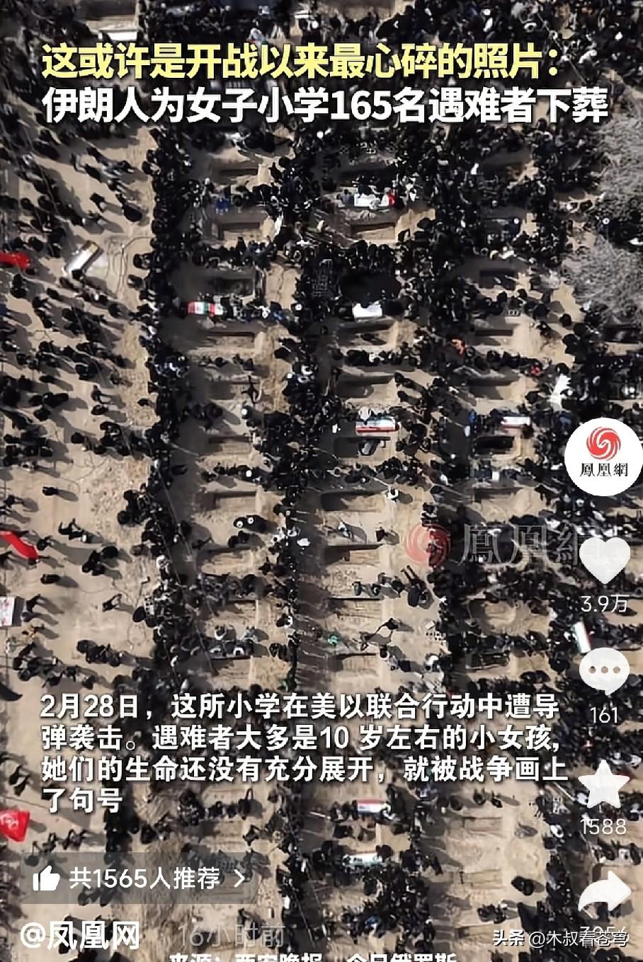 伊朗人为165名在学校中死亡的人下葬! 这是开战以来最心碎的画面,伊朗为女子小学死亡的165名遇难者下葬了,如果特朗普看到这一幕会不会流泪? 4月4日,有媒体发布了伊朗人为女子小学死亡的165遇难者下葬的视频,画面配以哀伤的音乐,视频留言里热泪纷纷,无辜的孩子,无辜的生命,就因为这场该死的战争丧失了,他们还这么小,甚至还没来得及看看这个世界的美好,却被邪恶多去了宝贵的生命。 毫不掩饰,我也流泪了,我只想振臂高呼:任何理由的战争都是邪恶,停止吧战争! 我想说的是,不要以为发动一场战争就能让他“伟大起来”,相反,任何发动战争的国家都是无能的国家,因为当一个国家只有在没有了竞争能力和智慧的时候,才会气急败坏声竭力斯地以暴力解决问题。 当然,特朗普不会懂得这句话的含义,因为他或许依旧在为自己的无能而做的事沾沾自喜。 就这一点,美国和我们东方大国相比,就已经差距千里万里,一个智慧见底而不得不发动战争的国家,又能走多远? 所有一切,都是一笔早晚会清算的账。 请珍惜我们今天的幸福,请爱我们的祖国!