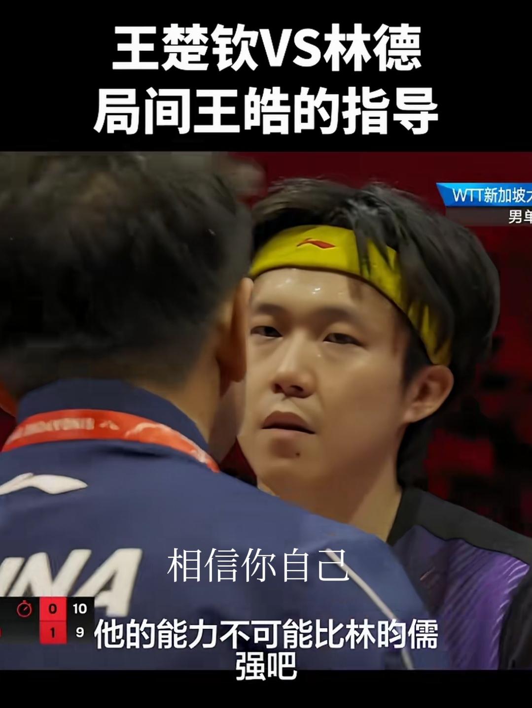 一名合格的场外指导可以给予运动员扭转乾坤的信心。 新加坡大满贯王楚钦对阵林德,不仅仅考验王楚钦的技战术,更考验他的内心,第一局被林德以11:5拿下,第二局王楚钦拿到局点后又连续被追分,第二局的胜负比第一局更加重要,扳回一局就是1:1,再丢一局就是王楚钦0:2落后,林德又不是正常打法,非常考验王楚钦的内心抗压能力。 所以,第二局10:9这个暂停就是为了让王楚钦有一个冷静的机会,王皓指导抓住机会,首先肯定王楚钦这一局打得很好。 至于后面怎么打,要坚定,该出手就出手,想摆就摆,想捅就捅,不能怕被对手猜中,猜中了也不要紧,注意后续的衔接就好,说白了林德既没有厚度,也没有速度,无非就是变化,他的能力不可能比林昀儒强吧! 自己一定要心定,想好接发球,摆也好,拧也好,搓也好大不了打相持,出手一定不能犹豫。 有了暂停王皓指导的一顿点拨,王楚钦上场后快速拿下一分,以11:9扳回一局,大比分1:1。 有了一分在手,第三局虽然比分依然胶灼王楚钦还是以13:11再拿一局,第四局王楚钦11:8拿下,王楚钦在先丢一局后连赢三局,王皓指导的场外也功不可没。 当王楚钦再遇巴黎奥运后曾经输过的对手,或多或少王楚钦的内心是有不坚定的因素存在的。 王皓指导非常理解王楚钦的内心状态,首先肯定他的优势,拿王楚钦非常熟悉的林昀儒做对比,首先我不惧怕你的变化,大不了打相持,因为王楚钦相持的耐力是远远超过林德的,只要王楚钦足够坚定,林德也无可奈何。 男单决赛王楚钦对阵林昀儒真的非常轻松,11:3、11:8、11:8、11:9,王楚钦重庆冠军赛继续加油!