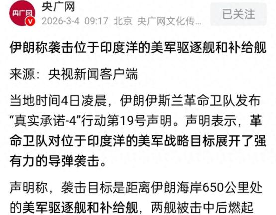 牛!伊媒称伊朗导弹成功打击美军驱逐舰和补给舰,两舰已燃起大火 两舰被击中后燃起大火。滚滚浓烟在印度洋上持续扩散,夜色中清晰可见的火光,成为伊朗 “真实承诺 - 4” 行动最直接的战果证明。 这次被击中的美军舰艇并非处于随机巡航状态。伊朗革命卫队的声明间接透露关键信息,美军驱逐舰当时正与补给舰进行海上加油作业。这种情况下,两舰必须保持低速并行,机动性被降到最低,恰好给了伊朗导弹可乘之机。 伊朗此次动用的核心武器是 “卡德尔 - 380” 超远程反舰巡航导弹。这款 2025 年才亮相的新型装备,射程直接突破 1000 公里,750 公斤的半穿甲爆破战斗部威力惊人。导弹采用掠海低空突防模式,能有效规避常规雷达探测,再加上地下发射的隐蔽性,让美军预警系统形同虚设。 更值得关注的是伊朗的目标锁定能力。要在 650 公里外击中移动舰艇,精准侦察是前提。伊朗见证者 - 149 远程侦察无人机发挥了关键作用,这款航程 5000 公里的无人机对美军舰队实施了长时间监控。民用卫星提供的大致方位,配合印度洋上隐蔽的情报船实时追踪,最终形成了完整的目标数据链。 美军的疏忽也为这次打击创造了条件。部署在阿拉伯海的阿利・伯克级驱逐舰,原本主打对空警戒和远程打击。当时舰艇的雷达系统大概率未开启全功率低空探测模式,电子战装备也未处于最高戒备状态。美军或许低估了伊朗的远程打击能力,毕竟 650 公里曾被视为伊朗岸基武器的 “攻击盲区”。 这波操作直接打破了美军在中东的海上威慑神话。此前美军中央司令部刚宣布,已摧毁 17 艘伊朗舰船并打击近 2000 个伊朗目标。B-2 隐身轰炸机、双航母战斗群的高强度空袭,一度让外界认为伊朗难以组织有效反击。但伊朗用实际战果证明,其分布式作战体系仍具备致命打击能力。 此次打击是 “真实承诺 - 4” 行动的延续。自 3 月 1 日行动启动以来,伊朗已连续袭击 27 个美军基地,包括巴林第五舰队司令部、卡塔尔乌代德空军基地等关键节点。封锁霍尔木兹海峡的举措,更是直接卡住了全球 20% 的石油运输通道,布伦特原油价格应声跳涨 8%。 美军的反应同样值得警惕。目前美军在中东部署了超过 5 万名士兵、200 架战斗机和六艘阿利・伯克级驱逐舰。这些驱逐舰携带的 “战斧” 导弹射程超 1400 公里,可对伊朗内陆目标实施纵深打击。双方的相互报复已形成恶性循环,冲突升级风险持续攀升。 国际社会最担心的局面正在出现。战场边界早已突破两国范围,阿联酋、科威特、沙特等国均已卷入战火。欧洲天然气价格盘中暴涨 50%,全球能源供应链遭受剧烈冲击。联合国秘书长古特雷斯明确谴责冲突中的平民伤亡,呼吁双方立即停火。 美国国内的反对声音也在发酵。路透社民调显示,仅 27% 的美国民众支持对伊朗的军事行动,56% 的受访者认为行动决策过于草率。民主党人正推动战争权力决议案,质疑行动的合法性,国会最快可能在 3 月 4 日进行表决。 伊朗的底气来自其成熟的导弹工业体系。除了 “卡德尔 - 380”,射程 1500 公里的法塔赫 - 2 高超音速导弹、2000 公里射程的克赫巴尔导弹,共同构成了多层次打击网络。这些导弹大多采用公路机动部署,发射准备时间仅需 15-20 分钟,很难被精准定位摧毁。 后续局势的走向将围绕三个关键点展开。霍尔木兹海峡的封锁持续时间,直接决定全球油价的上涨幅度。伊朗导弹库存的消耗速度,会影响其持续反击的能力。美国国内的政治博弈,可能改变军事行动的规模和时长。 这场冲突已远超 “代理人战争” 的范畴。美伊双方的直接交战,让中东棋盘彻底失控。没有一方能轻易宣布胜利,也没有一方能单方面掌控停火节奏。军事手段解决不了根本矛盾,持续的对抗只会让更多无辜者付出代价。 伊朗此次导弹打击的意义,不仅在于击沉两艘美军舰艇。它更向世界证明,在现代战争中,技术差距并非不可逾越。弱小国家通过精准的战略布局、不对称作战手段,依然能对军事强国形成有效威慑。这一结果,或将重塑中东地区的力量平衡。
