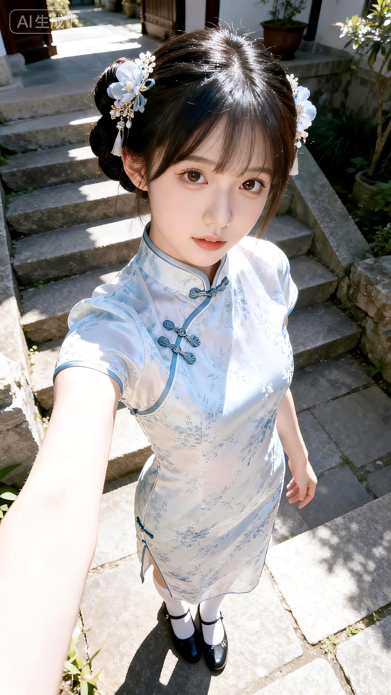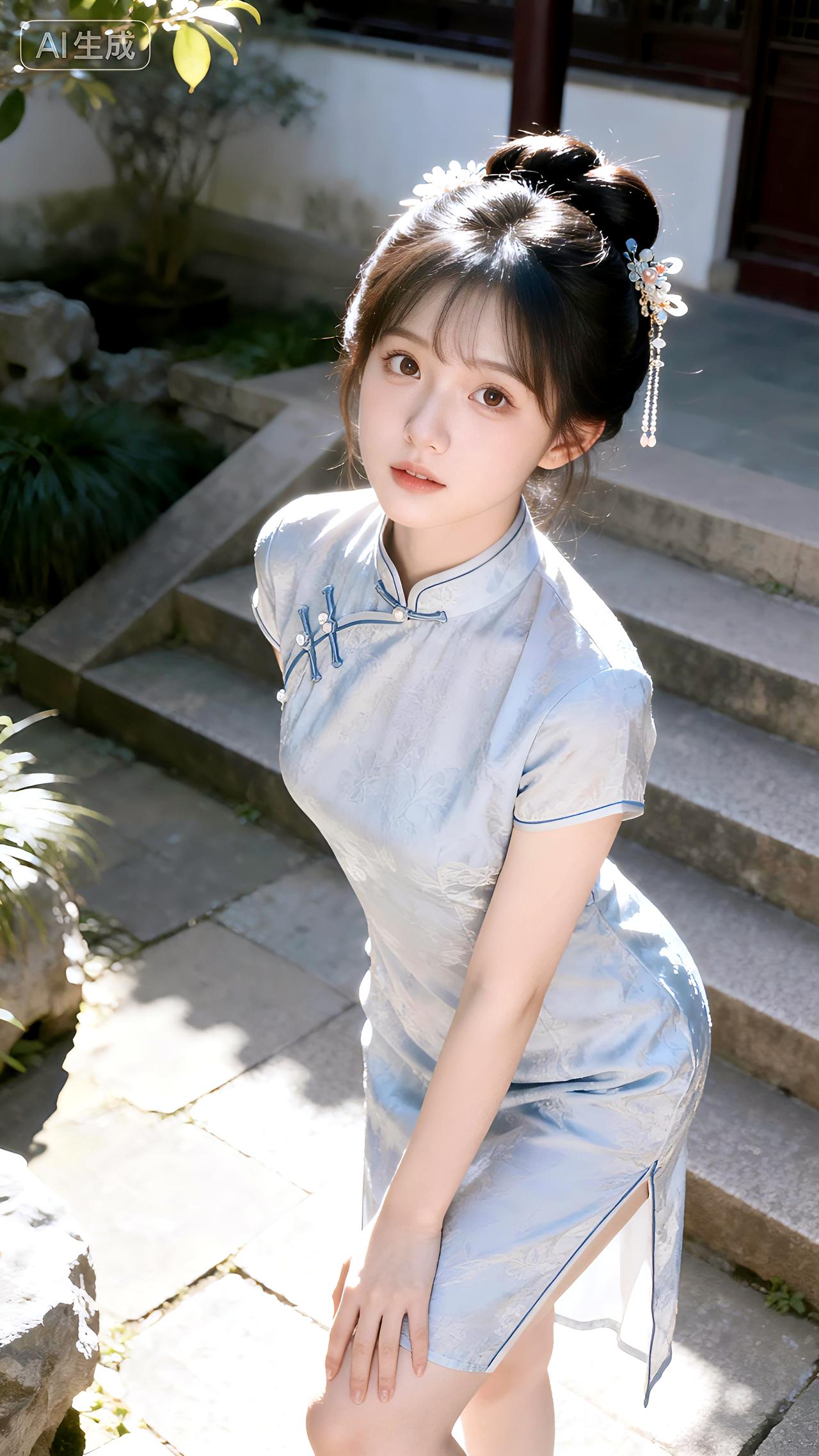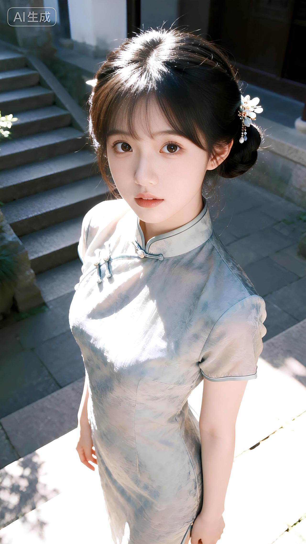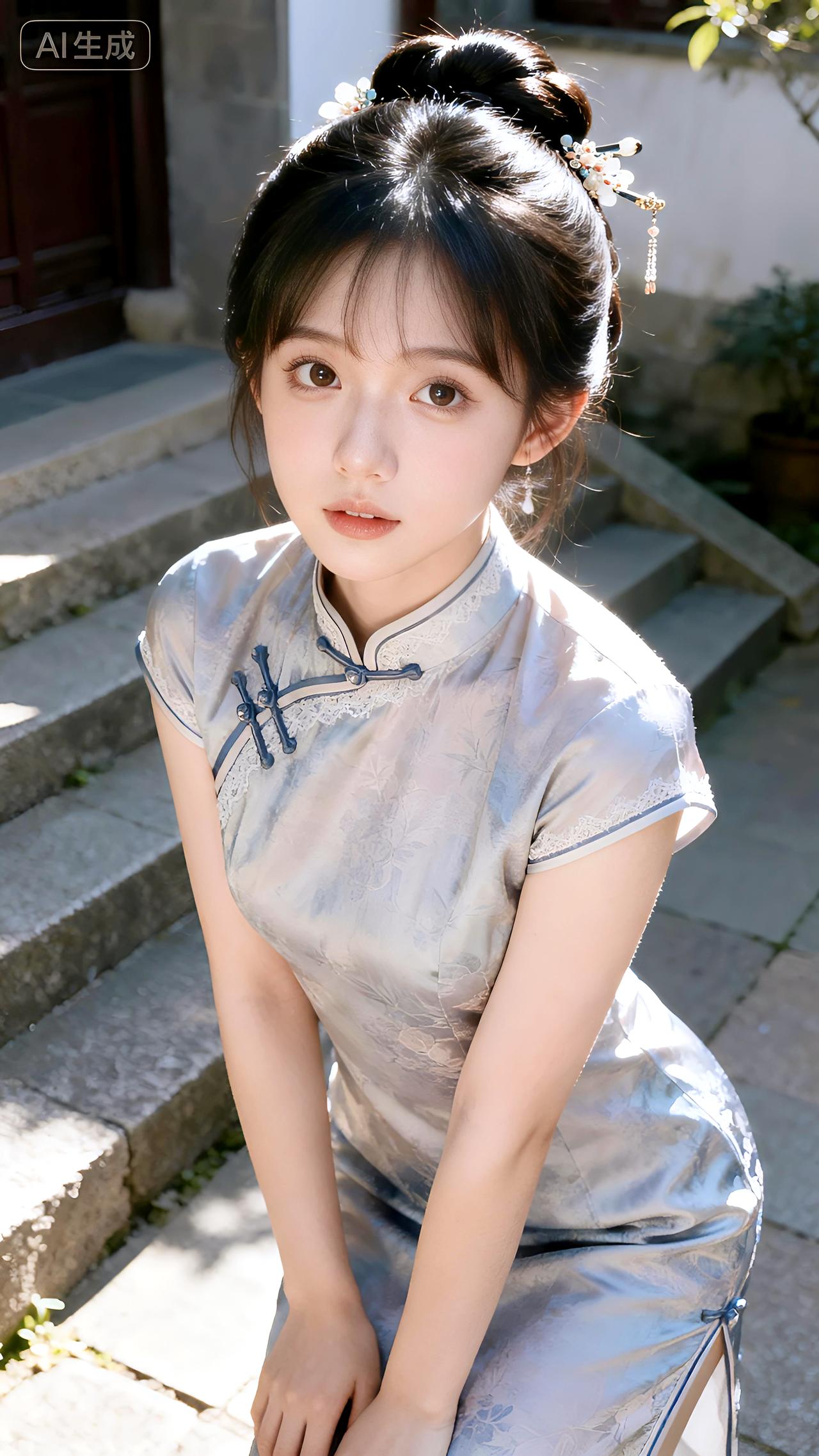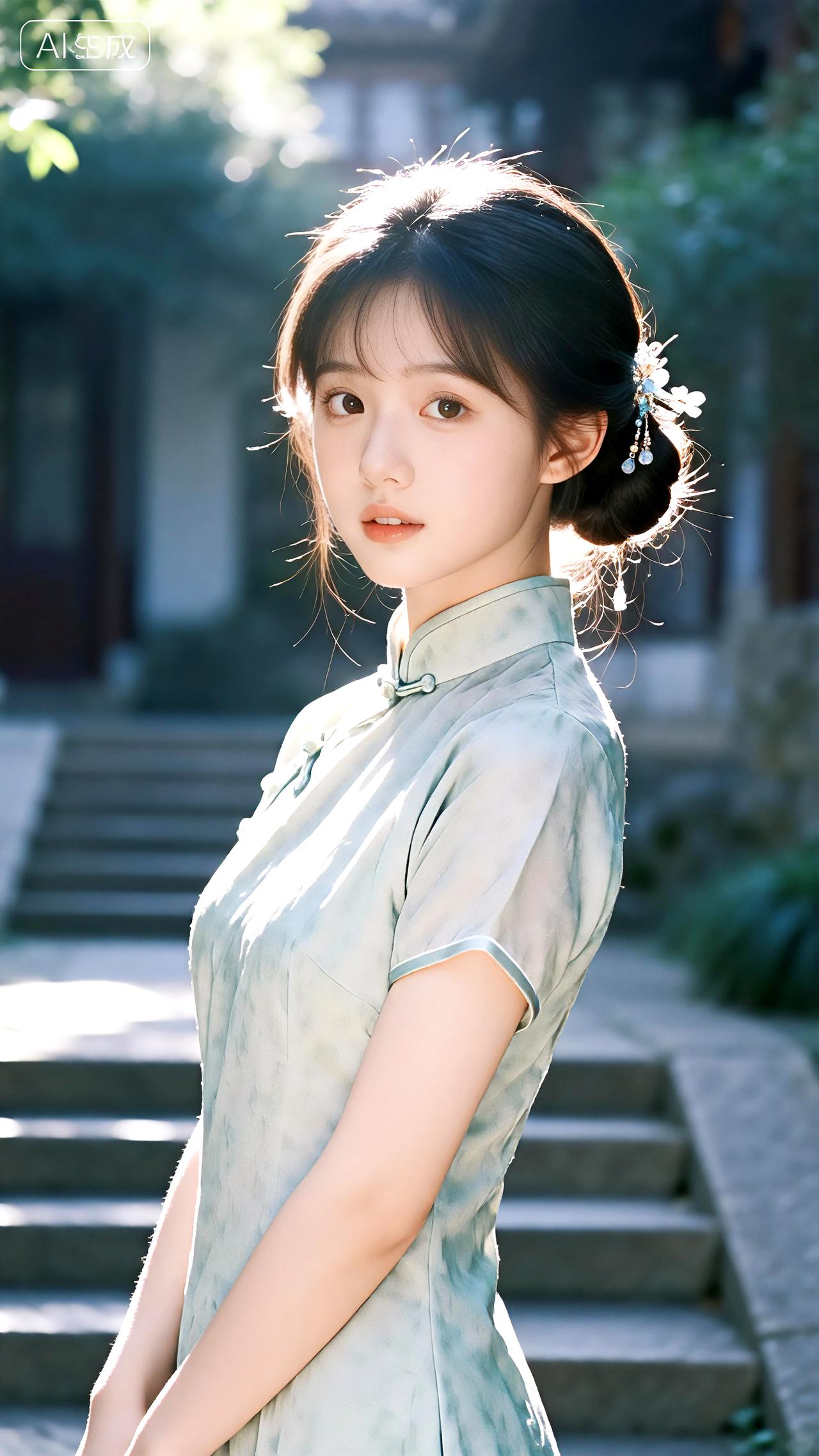 午后庭院石阶旁,她身着改良旗袍盘发温婉,一颦一笑皆是东方韵味。分享美女系列精美壁纸豆包 壁纸 写真