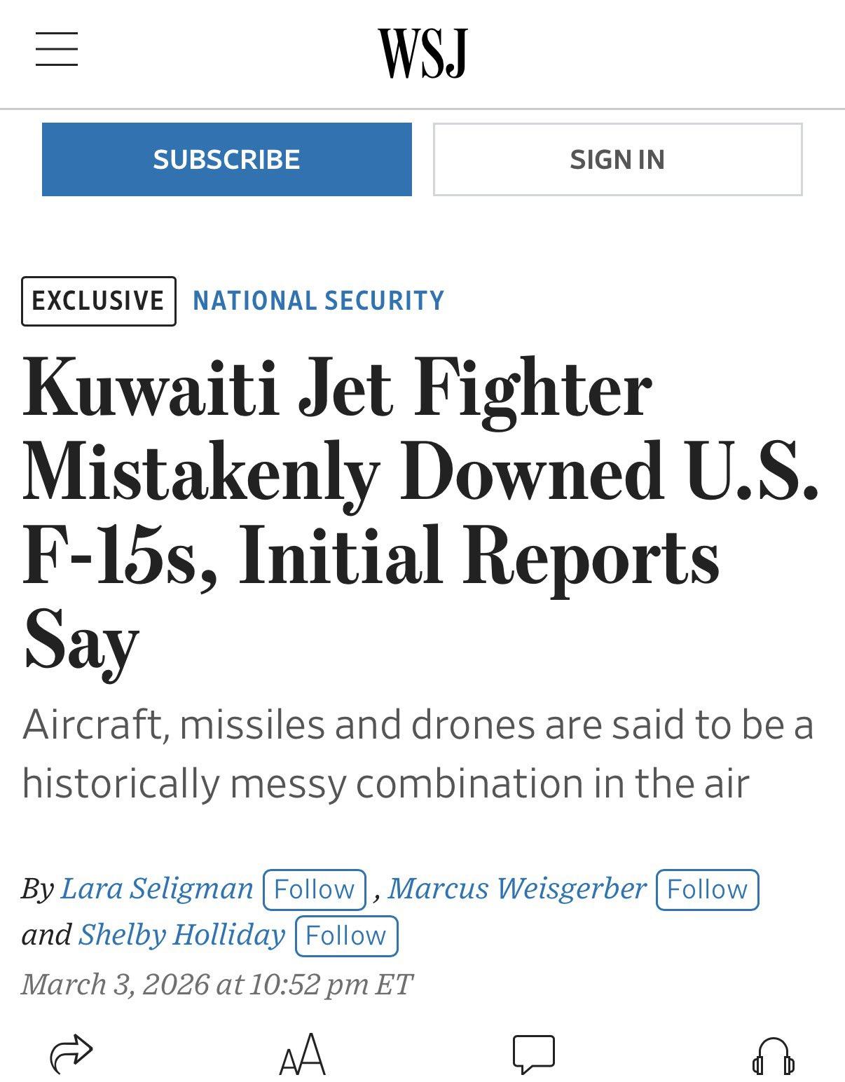 F-18 VS F-15[捂脸] 据《华尔街日报》:三位熟悉该事件的人透露,周日三架美国F-15E“攻击鹰”战斗机坠毁,是因为一架科威特F/A-18“大黄蜂”战斗机在科威特上空对伊朗无人机进行防空行动时,意外将其击落。当时“大黄蜂”战机发射了三枚空对空导弹。