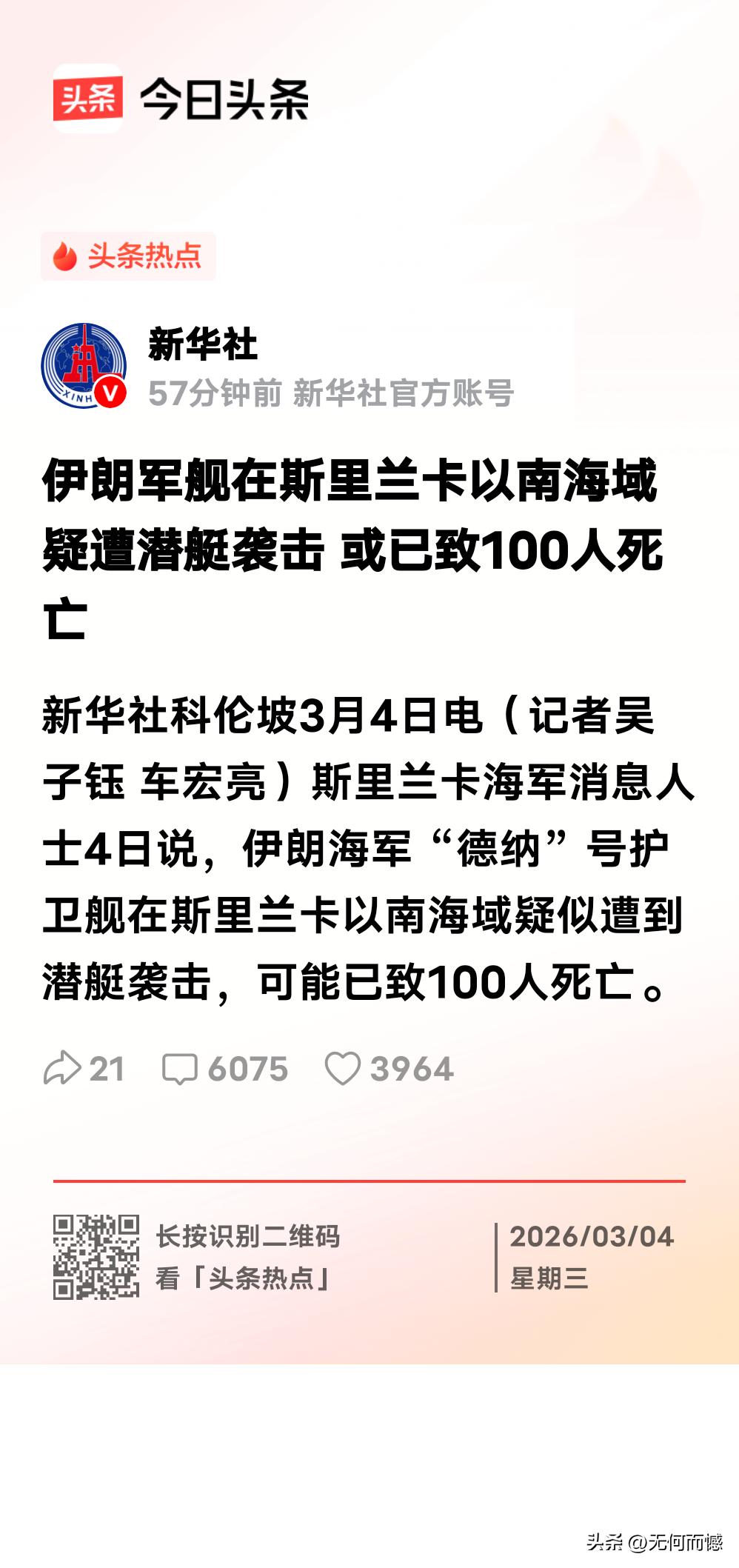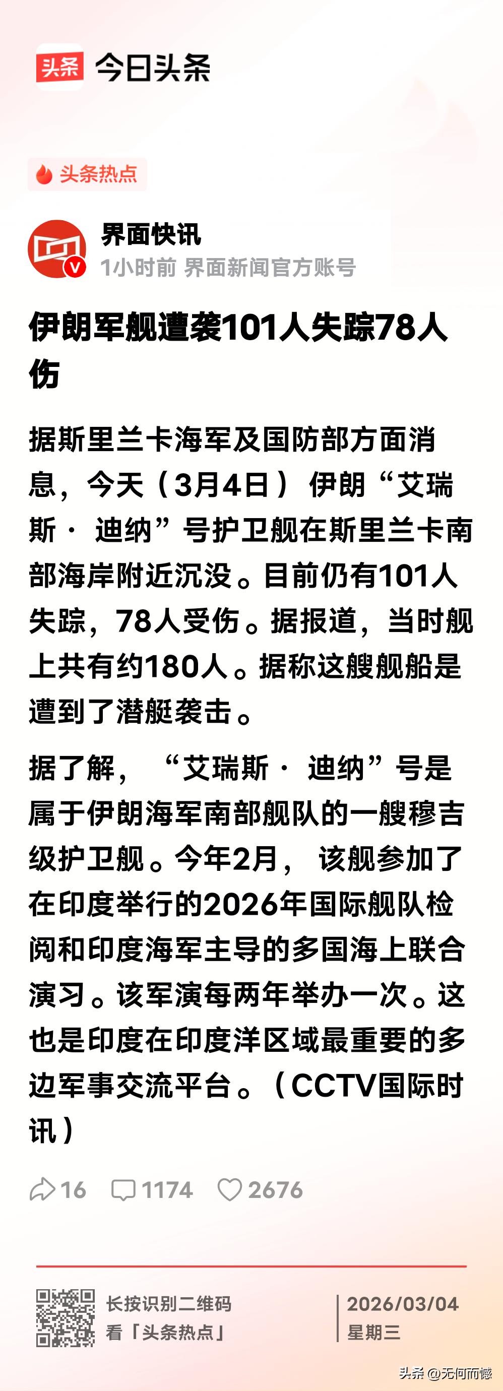 伊朗的一艘护卫舰被潜艇击沉,人员伤亡很惨重,据说,在这艘护卫舰上有180人左右,现在已经有101人失踪,78人受伤,实实在在说,对于失踪的这101人来说,生还的可能性是极低的,有的可能已经与护卫舰一起沉入了海底,这真是一件令人非常痛心的事情,但是没办法,打仗就是要死人的!