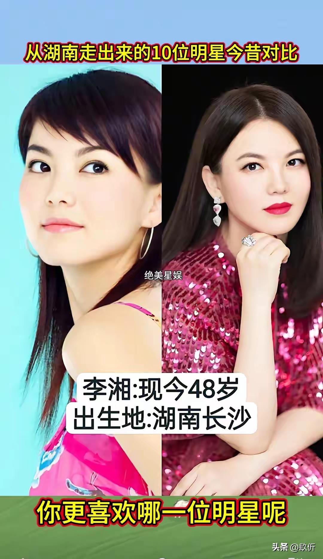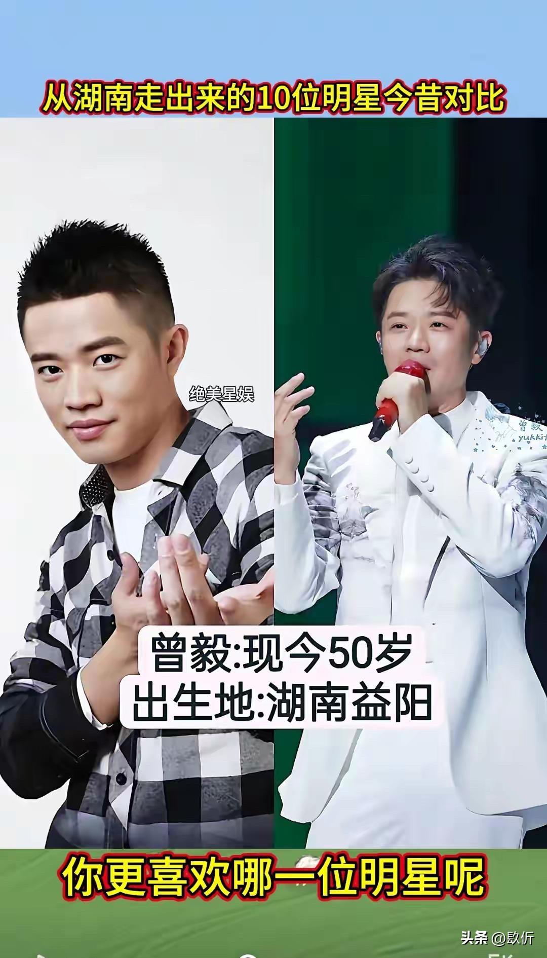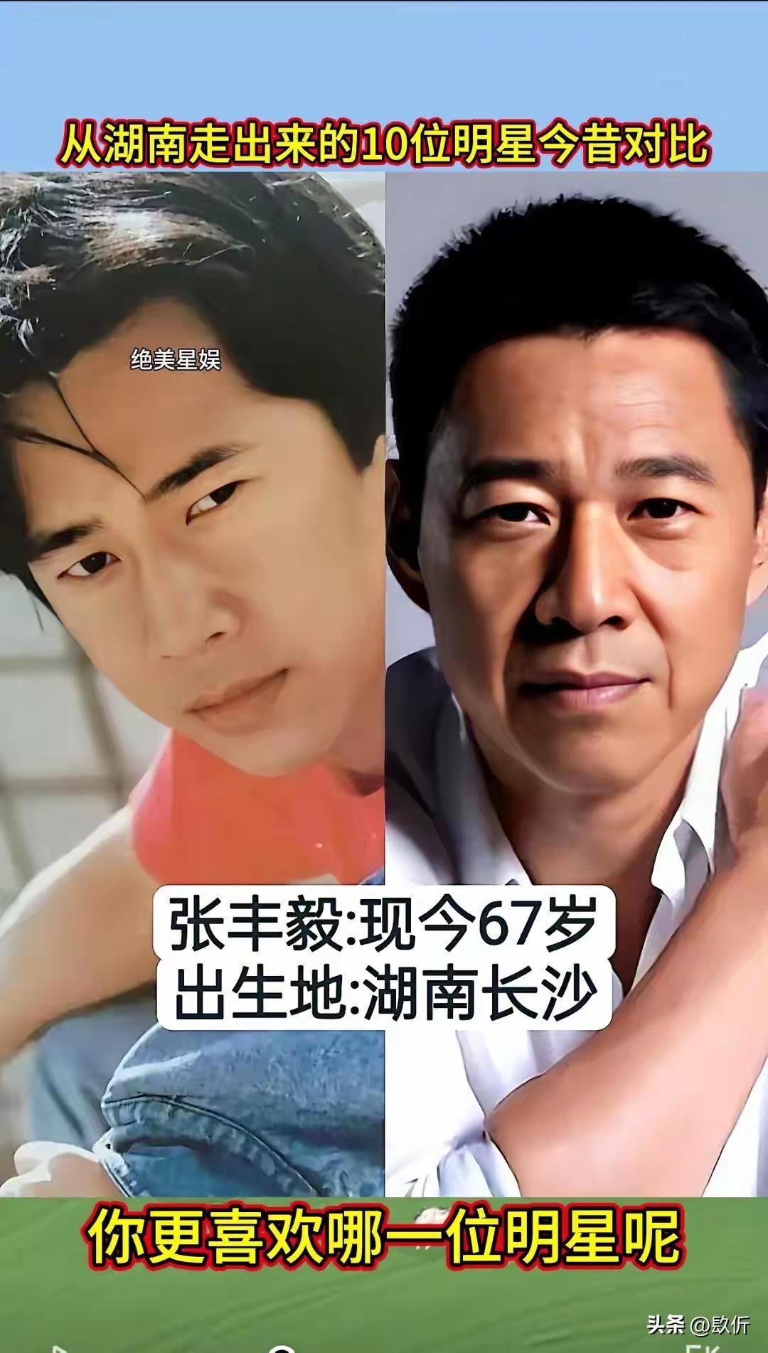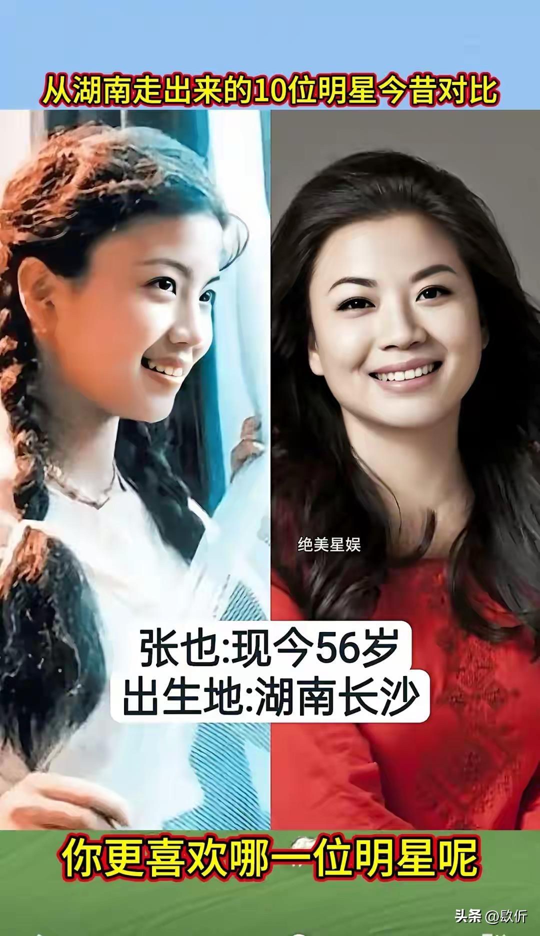 从湖南走出来的10位明星今昔对比 先说张也,1968年出生,今年56岁。湖南长沙人,著名的女高音歌唱家。 张也这个名字,恁肯定熟。她是春晚的常客,唱过太多好歌了,《走进新时代》《万事如意》《高天上流云》《祖国你好》。她的声音特别亮,特别甜,听着就让人心里头舒坦。 张也出身艺术家庭,爸爸是戏剧作家,妈妈是花鼓戏演员。她从小就有艺术细胞,考进了中国音乐学院,师从金铁霖教授。毕业后就进了总政歌舞团,成了专业的歌唱家。 张也唱了几十年歌,一直没变的是那个声音,还是那么亮,那么甜。 凤凰传奇,恁肯定听过。《月亮之上》《自由飞翔》《最炫民族风》《荷塘月色》,一首比一首火。曾毅在里头唱的说唱部分,虽然词不多,但特别有辨识度。他那句“留下来”,成了经典。 曾毅是益阳人,从小就喜欢音乐。后来去了深圳,在歌舞厅唱歌,认识了玲花,俩人组成了凤凰传奇。一开始不火,后来慢慢火起来了,火遍大江南北。他们的歌,广场舞必备,谁都会哼两句。 曾毅这些年变化不大,还是那个酷样,戴个墨镜,穿个皮衣,唱着他的说唱。他结婚了,老婆是个圈外人,生了个儿子,日子过得挺美满。