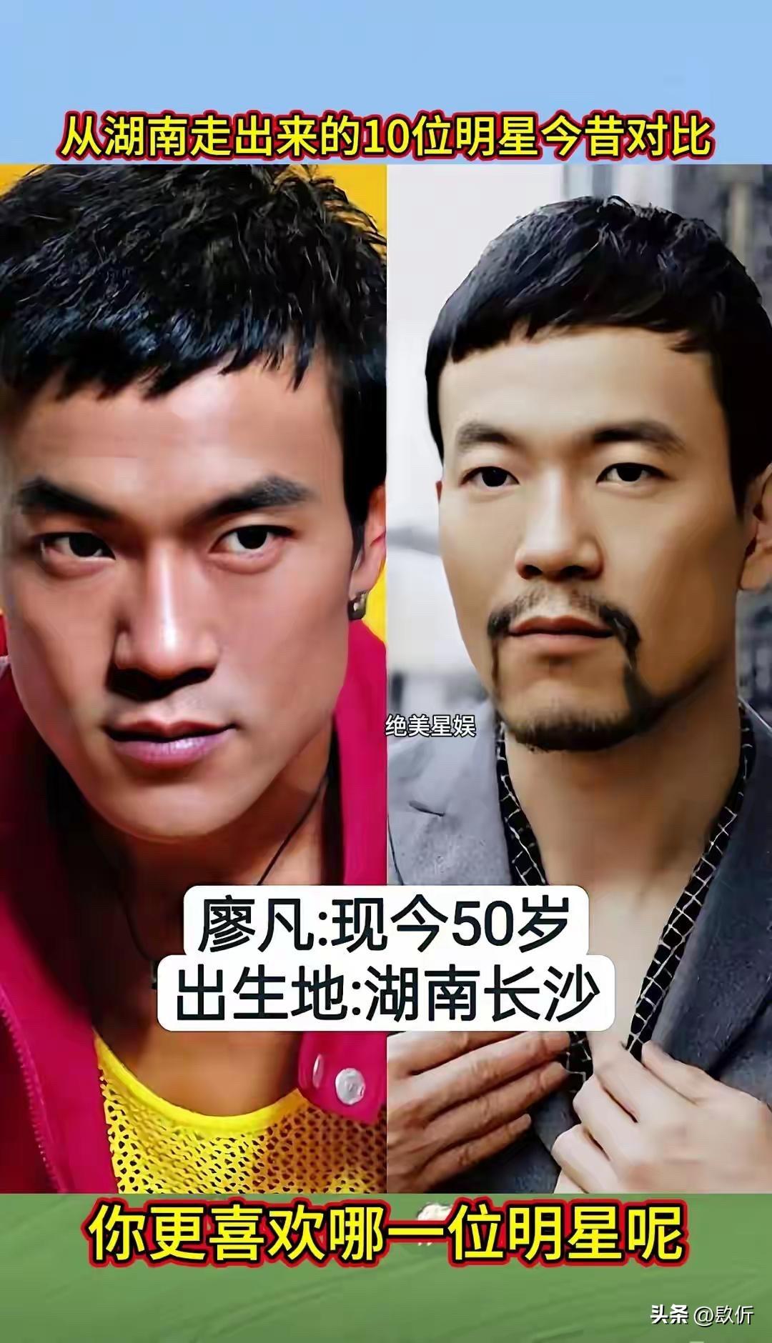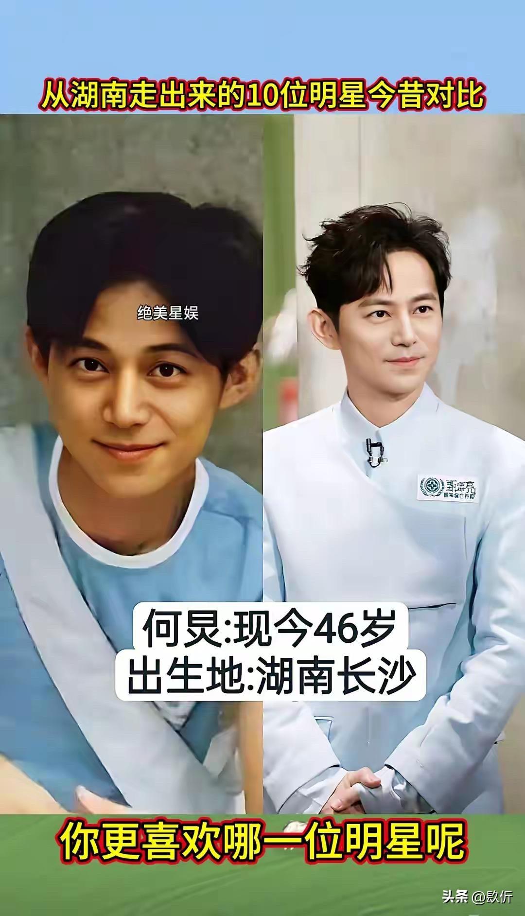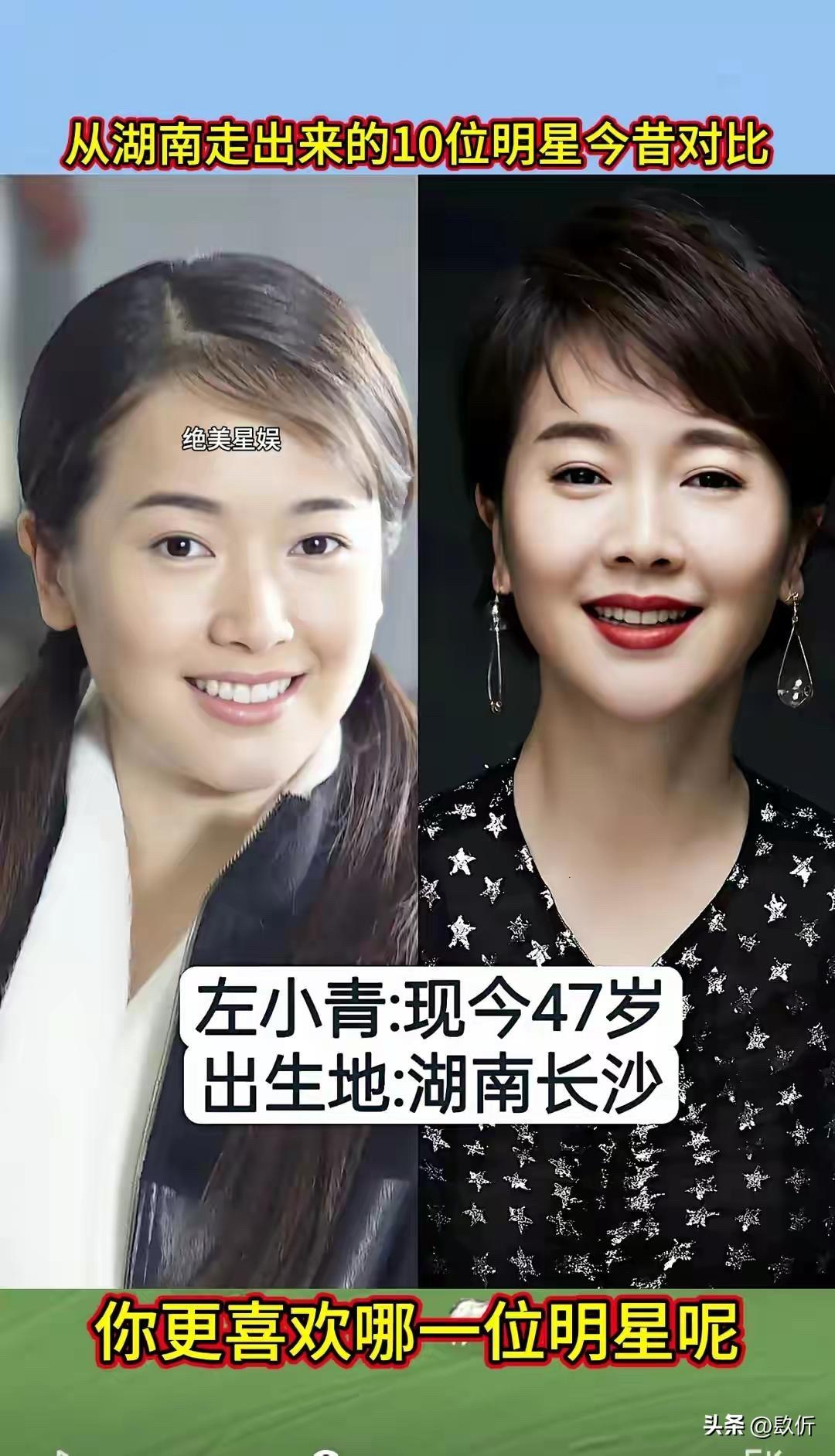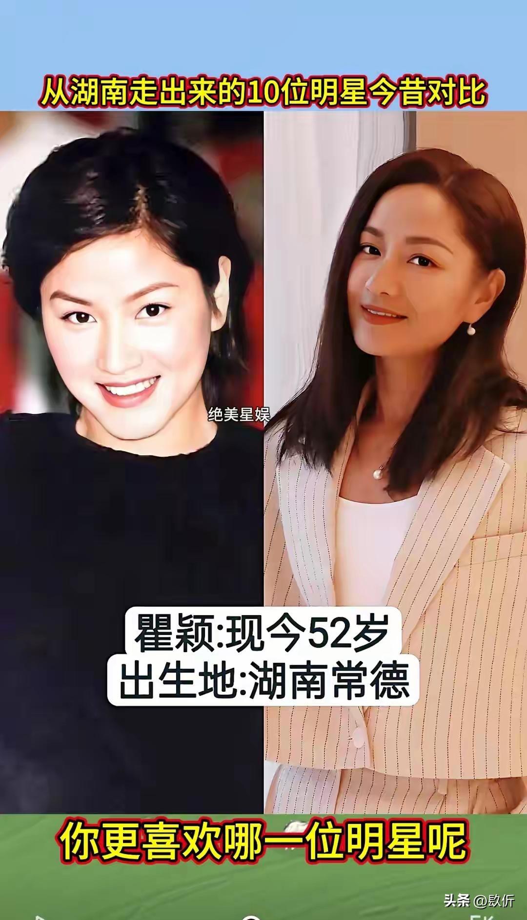从湖南走出来的10位明星今昔对比 先说张也,1968年出生,今年56岁。湖南长沙人,著名的女高音歌唱家。 张也这个名字,恁肯定熟。她是春晚的常客,唱过太多好歌了,《走进新时代》《万事如意》《高天上流云》《祖国你好》。她的声音特别亮,特别甜,听着就让人心里头舒坦。 张也出身艺术家庭,爸爸是戏剧作家,妈妈是花鼓戏演员。她从小就有艺术细胞,考进了中国音乐学院,师从金铁霖教授。毕业后就进了总政歌舞团,成了专业的歌唱家。 张也唱了几十年歌,一直没变的是那个声音,还是那么亮,那么甜。 凤凰传奇,恁肯定听过。《月亮之上》《自由飞翔》《最炫民族风》《荷塘月色》,一首比一首火。曾毅在里头唱的说唱部分,虽然词不多,但特别有辨识度。他那句“留下来”,成了经典。 曾毅是益阳人,从小就喜欢音乐。后来去了深圳,在歌舞厅唱歌,认识了玲花,俩人组成了凤凰传奇。一开始不火,后来慢慢火起来了,火遍大江南北。他们的歌,广场舞必备,谁都会哼两句。 曾毅这些年变化不大,还是那个酷样,戴个墨镜,穿个皮衣,唱着他的说唱。他结婚了,老婆是个圈外人,生了个儿子,日子过得挺美满。