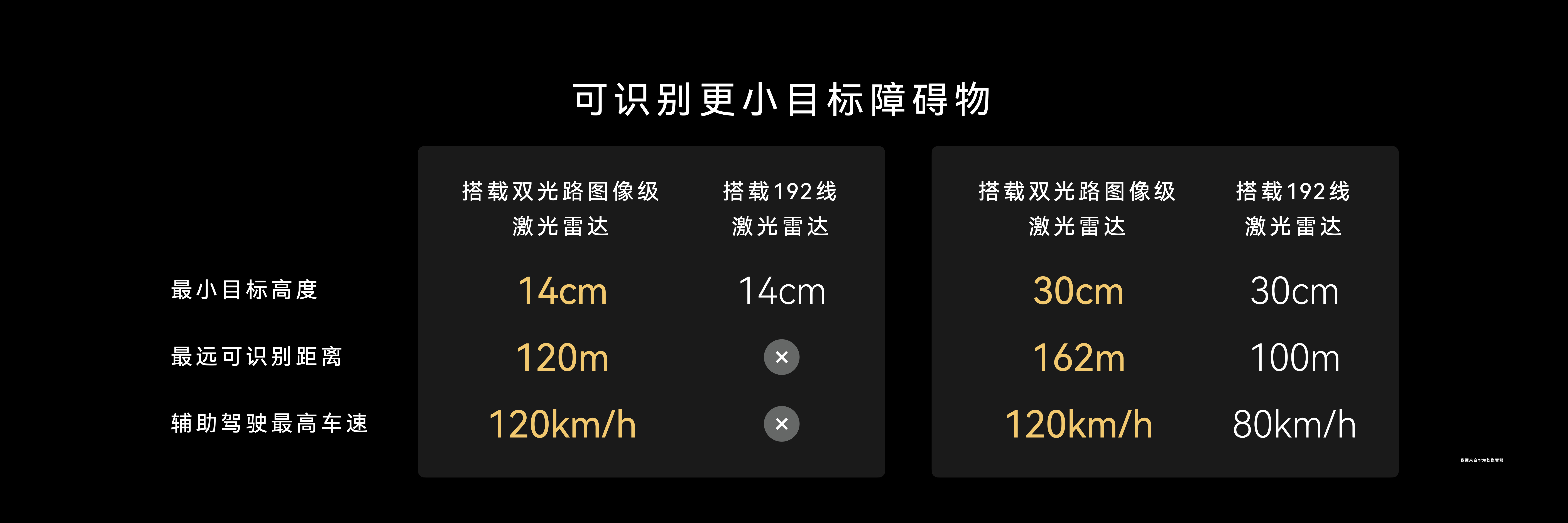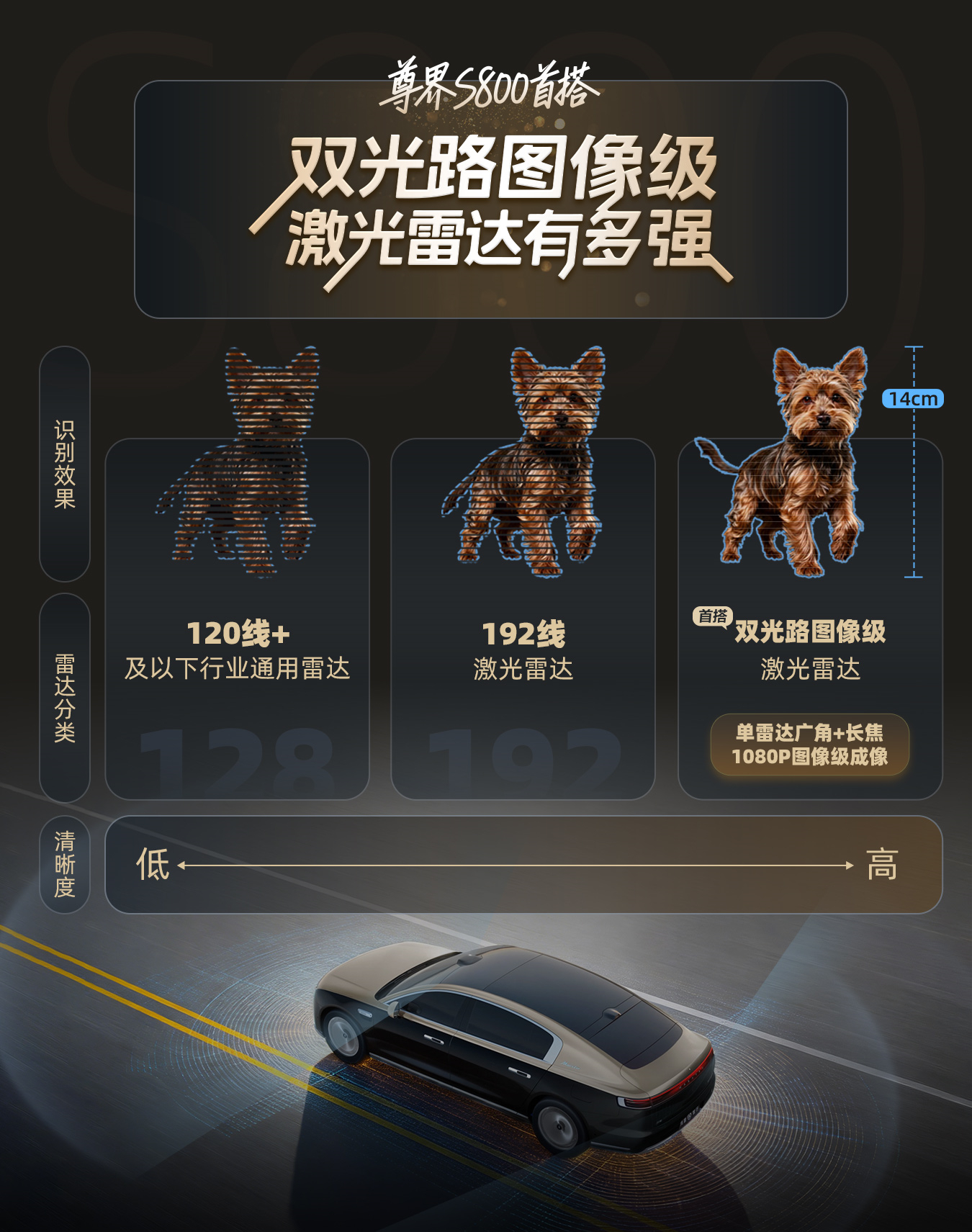 看了下鸿蒙智行这次技术焕新发布会,尊界S800又上新技术了。核心是新一代双光路图像级激光雷达,量产里线数最高,成像分辨率提升4倍,最小14cm的小物体都能识别到,感知能力明显更细了。