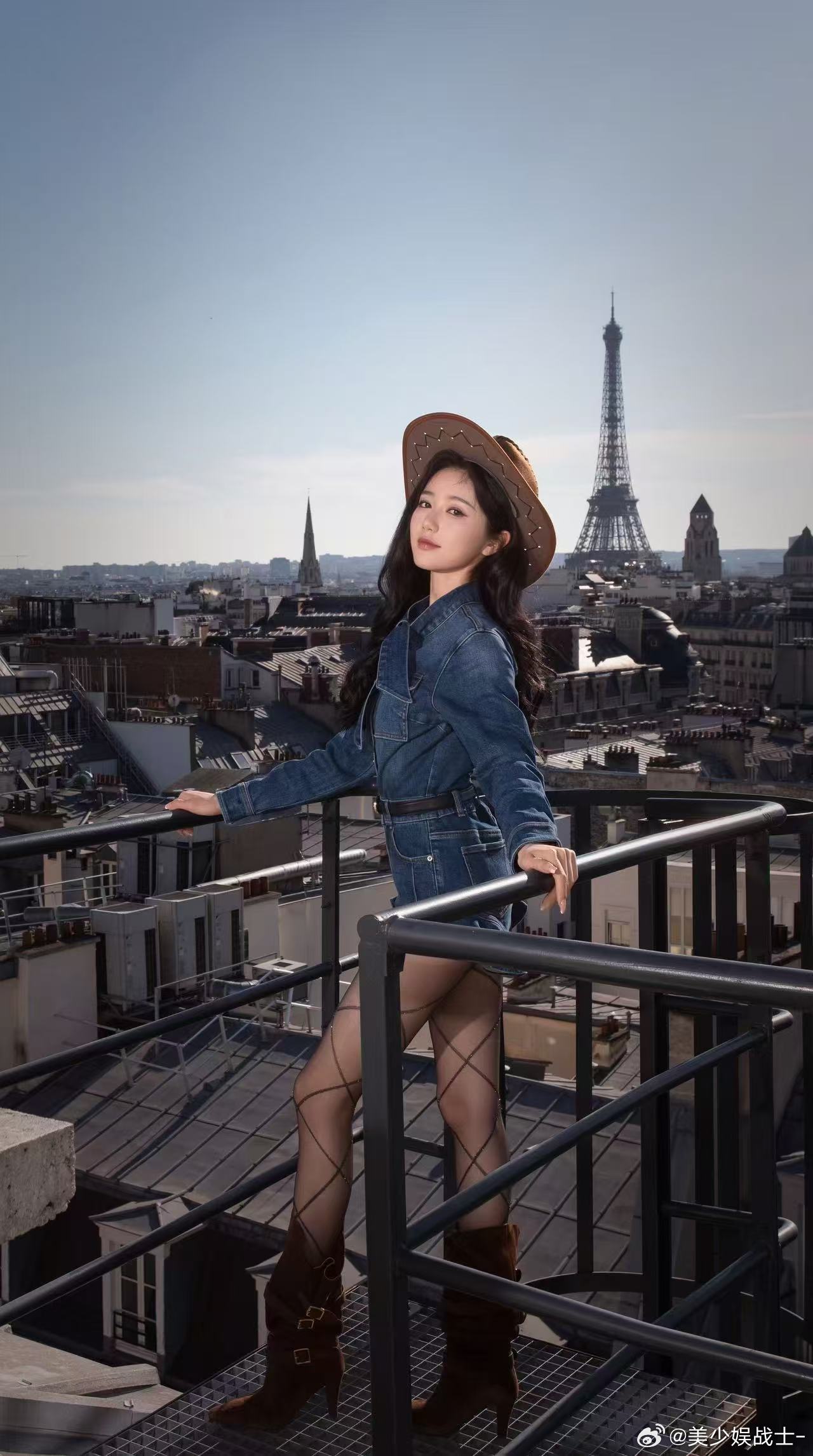 岳雨婷时装周街拍大事很妙 今天巴黎街拍造型大事很妙!一身牛仔衣配牛仔帽,酷帅又率性。站在斑驳的屋檐上,远处是城市天际线,她自己也成了这幅风景的一部分。