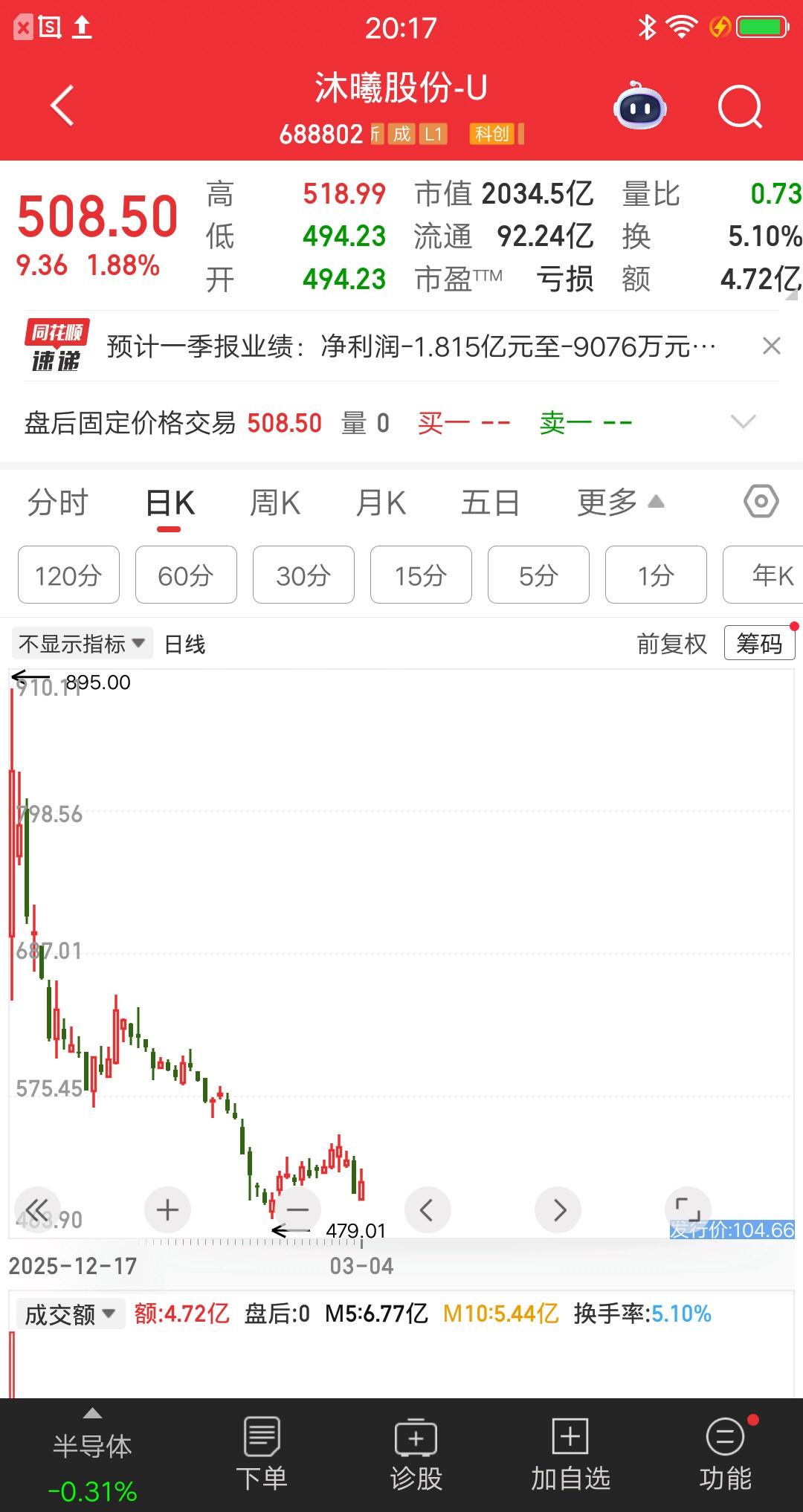 沐曦股份发布了一季报,一句话总结,营收高增利润减亏。营业收入4亿元至6亿元,同比增长24.84%至87.26%;亏损9075.72万元至1.82亿元,与上年同期相比,将减亏5099.79万元到1.42亿元。 公司上市募集净额为38.99亿元人民币,拿出不超过29亿进行现金管理,所以即便亏损,公司也没啥大的风险。 股价从最高点895元跌到508元,跌幅为43%。上市即巅峰呀,高位站岗的资金瑟瑟发抖。股价能否重回巅峰呢,参考寒武纪,业绩扭亏为盈的时候,转折点就来了。 人工智能是十年级别的技术性革命,沐曦股份是国产GPU第二股,好好经营公司,才有机会重回巅峰。