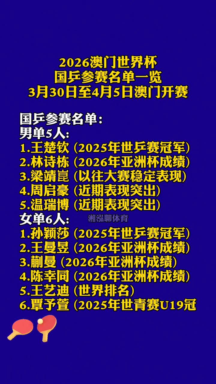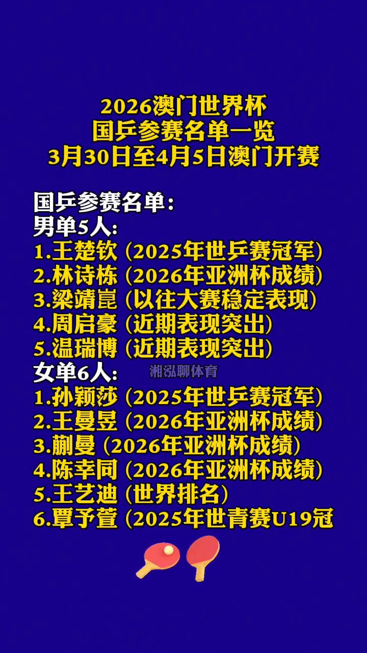 2026澳门世界杯国乒参赛名单一览。 湘泓聊体育。 3月30日至4月5日澳门开赛。国乒参赛名单: ·男单5人: →1.王楚钦(2025年世乒赛冠军)。 →2.林诗栋(2026年亚洲杯成绩)。 →3.梁靖昆(以往大赛稳定表现)。 →4.周启豪(近期表现突出)。 →5.温瑞博(近期表现突出)。 ·女单6人: →1.孙颖莎(2025年世乒赛冠军)。 →2.王曼昱(2026年亚洲杯成绩)。 →3.蒯曼(2026年亚洲杯成绩)。 →4.陈幸同(2026年亚洲杯成绩)。 →5.王艺迪(世界排名)。 →6.覃予萱(2025年世青赛U19冠军)。