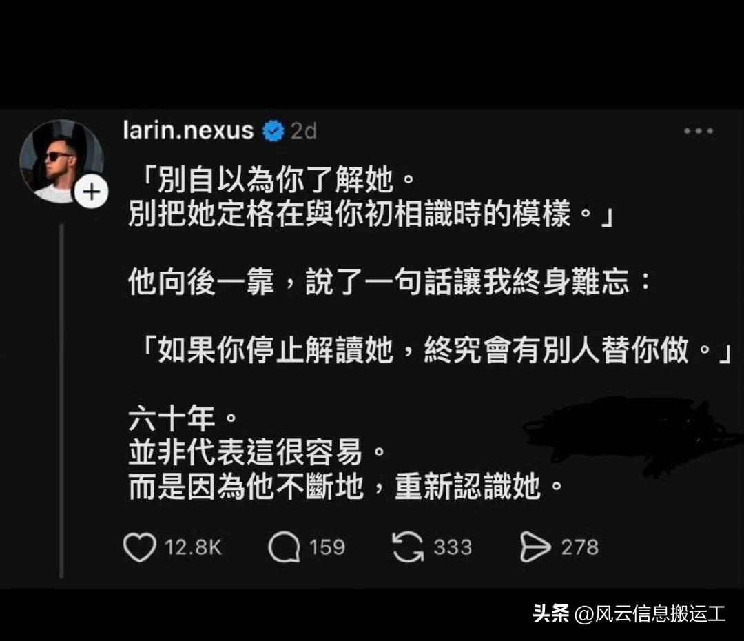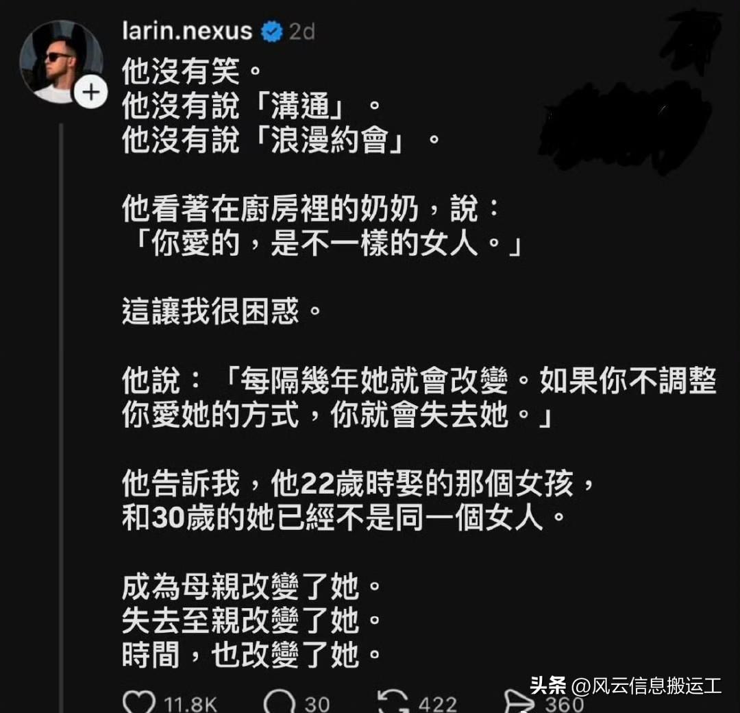 网友发帖,我爷爷奶奶结婚六十年。有一天,我问爷爷:「爱一个女人一辈子的秘诀是什么?」 大概总结一下就是女性在人生不同阶段的需求和状态是不断变化的,比如四十岁重尊重,五十岁重陪伴,六十岁重相守。