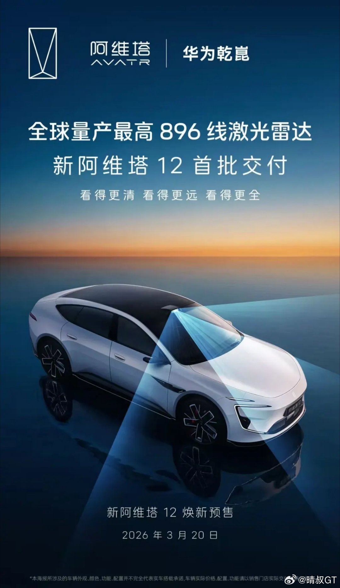 新款阿维塔12将于3月20日开启预售,新车将搭载华为新一代896线激光雷达。华为全新一代896线四激光雷达属于L3级智能辅助驾驶硬件,其探测能力将在超高清成像、超远距离探测、超精准识别上迎来质的提升。阿维塔12阿维塔阿维塔12阿维塔12上市