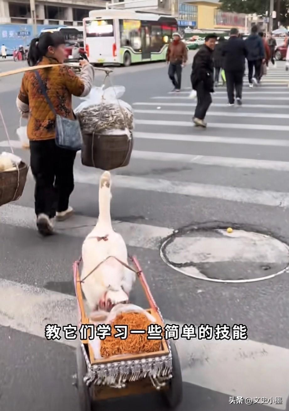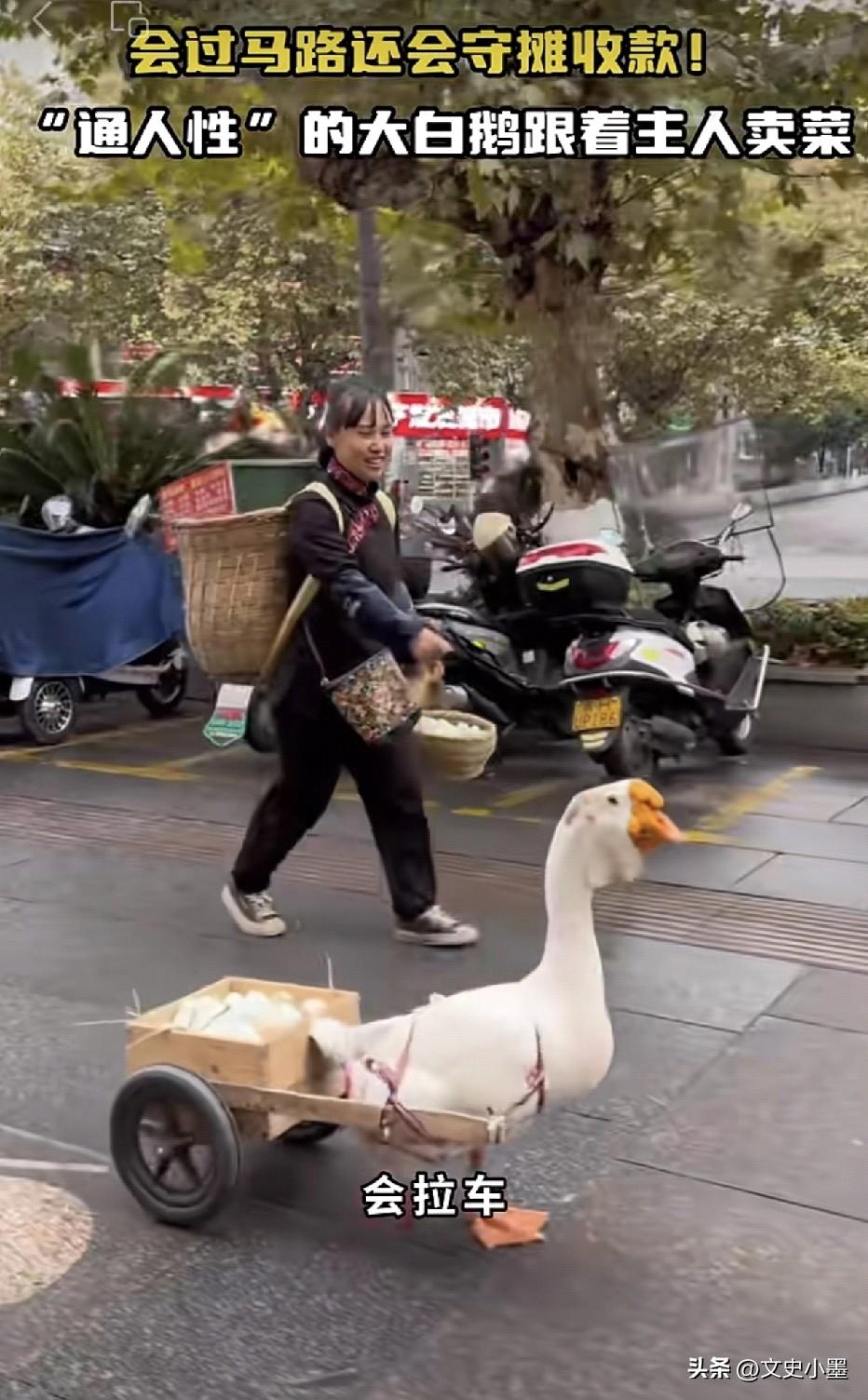 大姐养的这只大白鹅🪿太可爱了,非常通人性,主人走到哪里,它就跟到哪里,主人不见了,它还会叫,会帮忙拉小车,会跟着大姐赶集卖菜,把二维码挂在脖子上,还能帮忙收款! 大姐已经养了半年多了,教会了它一些简单的技能,对大姐来说这只大鹅已经不能算是单纯的宠物了,已经成了大姐家庭中的一员,家里人都十分喜爱它! 大白鹅的寿命一般是20-25年之间!比狗狗的寿命还长,算是宠物中比较长的了,如果幸运的话,它可以一直陪伴着主人,直到老去!
