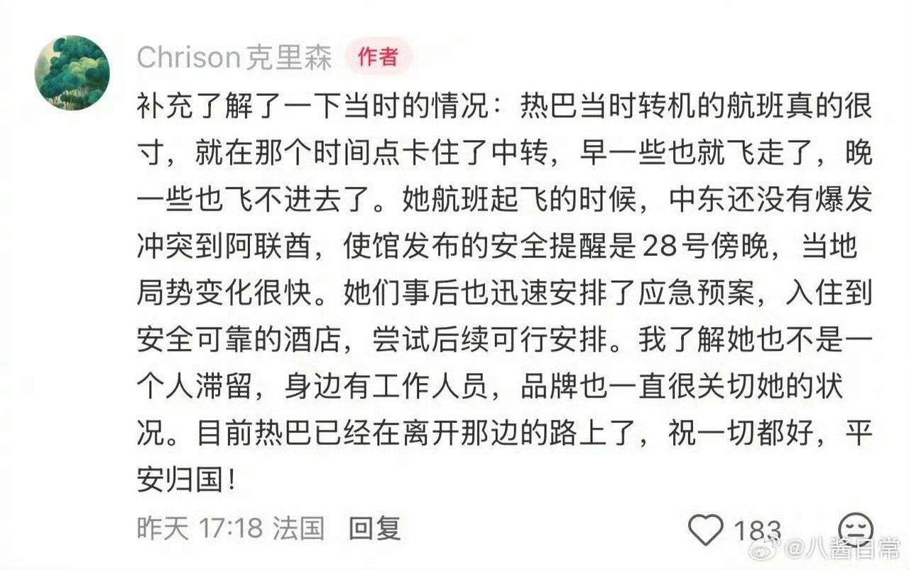 曝迪丽热巴或已落地马来西亚 全网揪心好几天,终于等来暖心消息!有靠谱时尚博主明确回应:据他所知,热巴已经安全落地马来西亚。之前因为突发状况被困迪拜,多少人日夜守着消息替她捏把汗。不管是中转休整还是准备回国,只要人平安就比什么都强。真心祝愿热巴一路顺顺利利,早日安稳回家,所有等待都值得,所有牵挂都落下。