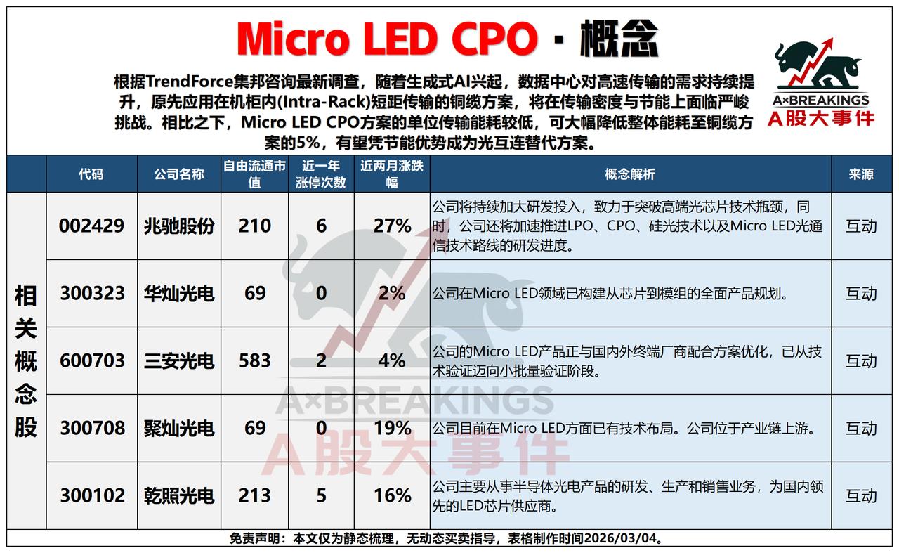 3月5日,星期四A股这些板块值得重点关注:智能经济与Micro LED CPO概念板块分析!!! 一、智能经济概念 智能经济作为继农业、工业、数字经济后的新型经济形态,以数据为核心生产要素,AI为驱动力,推动产业融合与模式创新。相关概念股中,延华智能近一年涨停次数达6次,活跃度领先;迦南智能近两个月涨幅10%,表现突出;而宏英智能则出现19%的回调,板块内部分化明显。 二、Micro LED CPO概念 受生成式AI驱动,数据中心对高速传输需求提升,Micro LED CPO因低能耗优势成为光互连替代方案。相关概念股中,兆驰股份近两个月涨幅达27%,领涨板块;聚灿光电和乾照光电分别上涨19%和16%,资金关注度较高;华灿光电涨幅相对温和,处于蓄势阶段。 三、综合点评 两大概念均受益于AI技术发展与产业升级,智能经济侧重AI与实体经济融合,Micro LED CPO则聚焦算力基础设施升级。短期看,资金更青睐业绩弹性大、技术壁垒高的龙头标的,但需警惕板块轮动与估值波动风险!!!