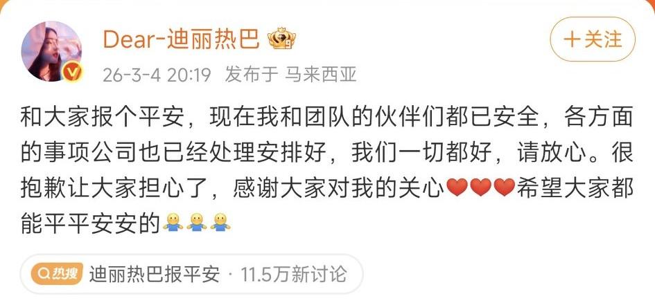 3月4日晚,迪丽热巴的个人账号更新了一条动态:“我和团队一切都安全,公司已经安排妥当,大家放心。” 短短三十余字,发出去五分钟,点赞就突破九万,评论区瞬间涌入近三万条留言。 这一次,没人催更,没人在意文案长短。所有人悬了一天多的心,就等她亲口说一句“我没事”。 这场突如其来的意外,要从两天前说起。作为迪奥全球品牌大使,迪丽热巴原定经迪拜转机前往巴黎出席大秀。这本该是她今年首场国际时装周的华丽亮相,却因中东局势突变、阿联酋突然关闭领空,直接卡在了半路。她和团队硬生生滞留在迪拜,超过24个小时,最终确定错过整场大秀。 过去这一天多里,工作室虽然接连发声报平安,说“一切安好”,但大家的心始终悬着。那种特殊的局势下,“安全”两个字,只有从当事人嘴里说出来,才算真的能让人踏实。 直到这条动态出现。 最戳人的不只是她终于发声,更是她发声的方式。一个刚经历了突发状况、被滞留在异国超24小时的人,本该有一肚子委屈要讲,有一堆理由可以解释缺席大秀的遗憾,但她没有。 她先安安稳稳安抚了所有担心自己的人,末了,还反过来叮嘱所有人“都要平平安安”。 这不是营业,这是本能。 评论区里,全是大家憋了一天多的心里话: “姐姐,没有什么比你平安更重要,一定一定要好好休息照顾好自己,我们一直在。” 其实粉丝和偶像之间最动人的联结,从来不是数据,不是热度,是这种隔着屏幕的双向惦记。 局势动荡、行程延误、缺席大秀——这些在这一刻都不重要了。重要的是,她安全,她第一时间让所有人知道她安全,她自己刚经历完波折,还在惦记着别人安不安全。 现在,只希望她接下来的每一步都顺遂。不急,慢慢回来,我们等你。