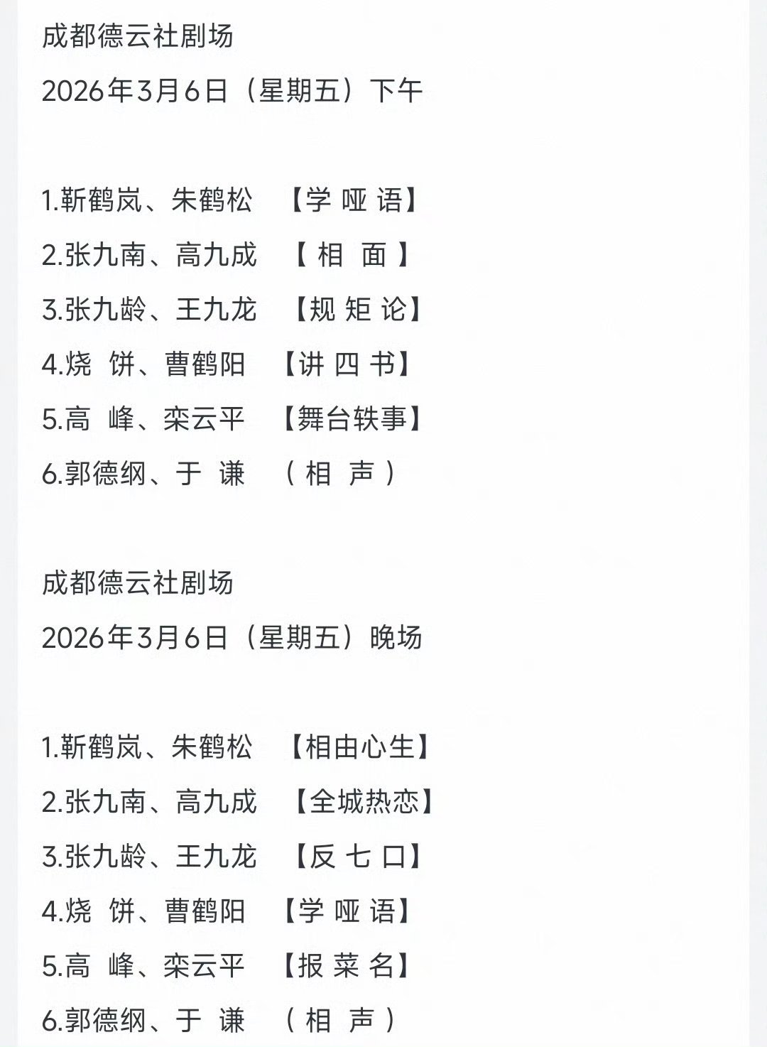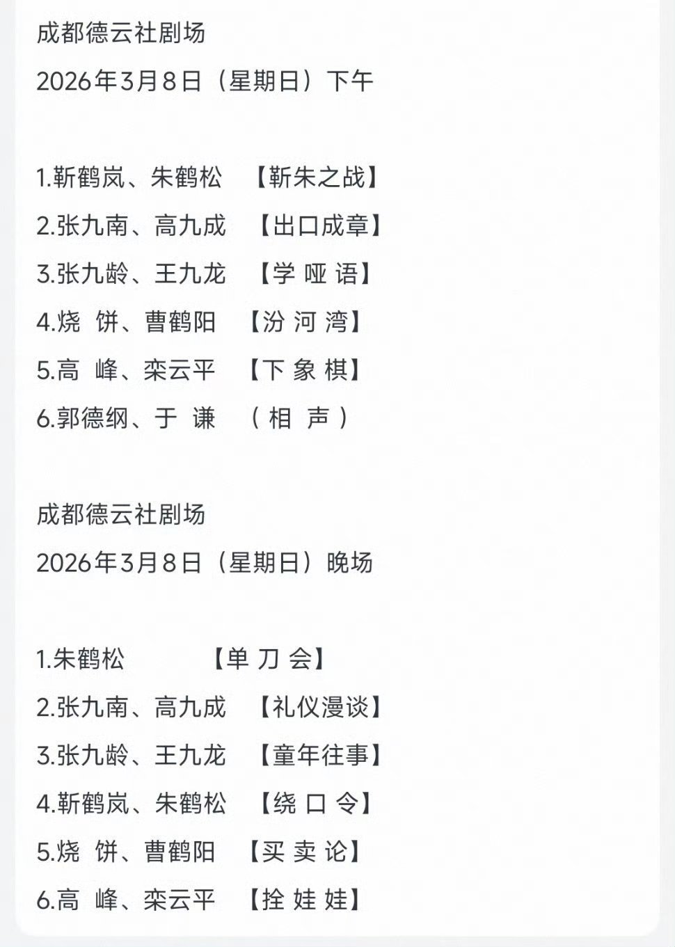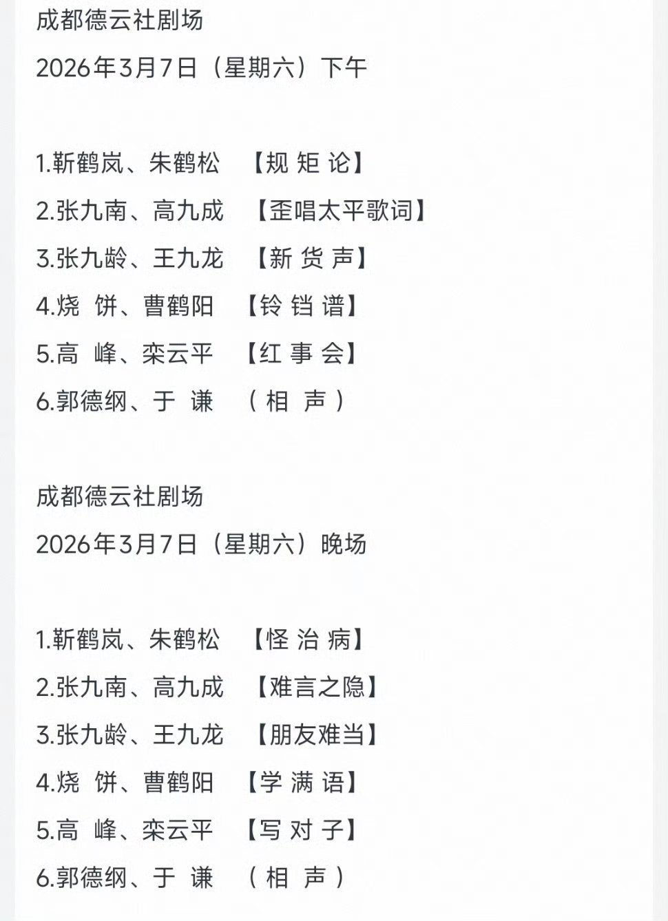 成都德云社开业节目单3月5日~8日开业演出阵容:郭德纲于谦,高峰栾云平,烧饼曹鹤阳,张九龄王九龙,靳鹤岚朱鹤松,张九南高九成3月10日、11日、12日岳云鹏孙越领衔演出3月13-15日孔云龙章九徕领衔德云三队演出