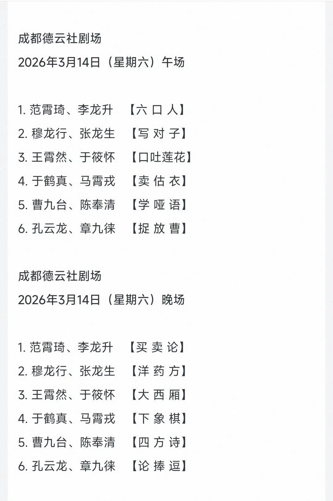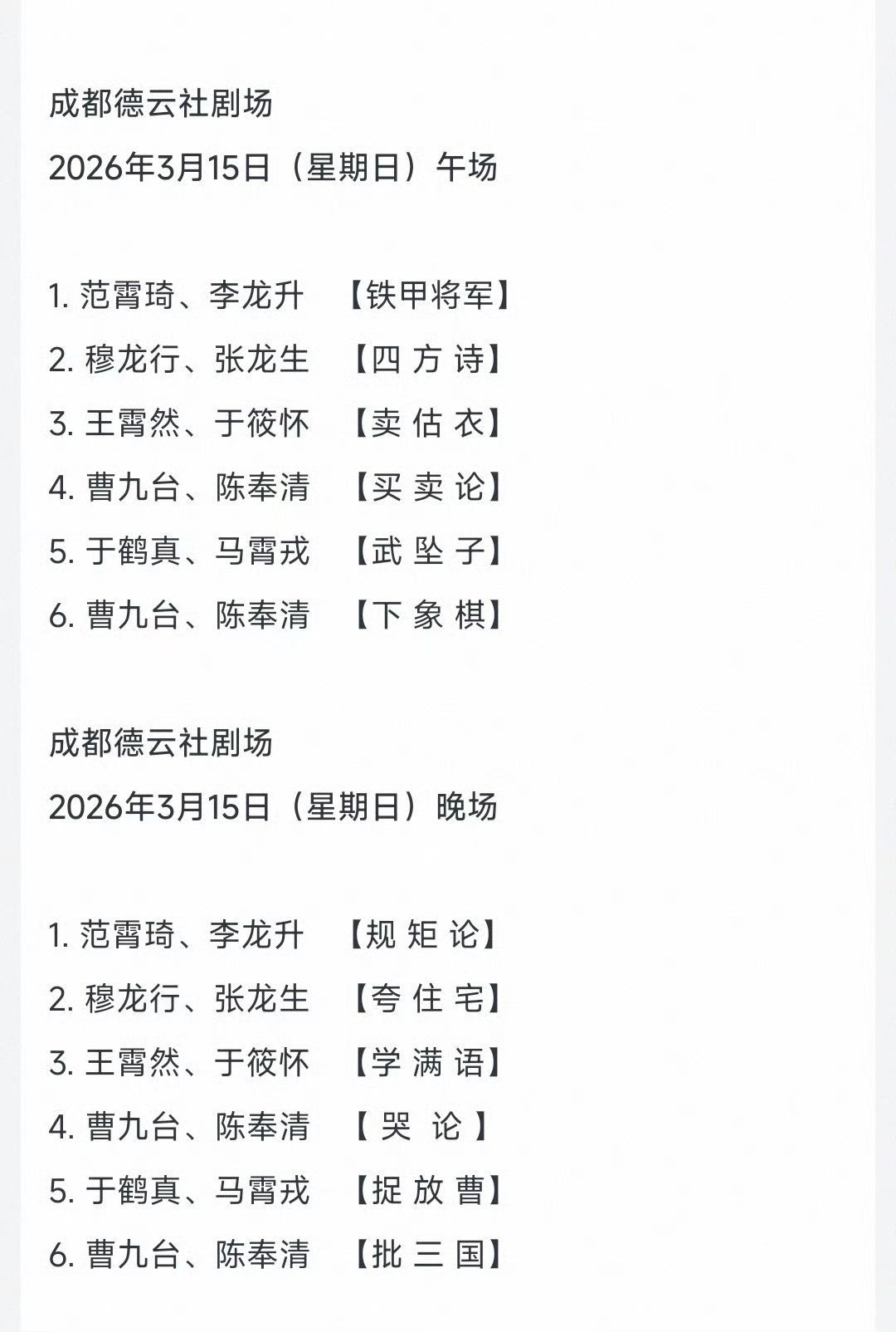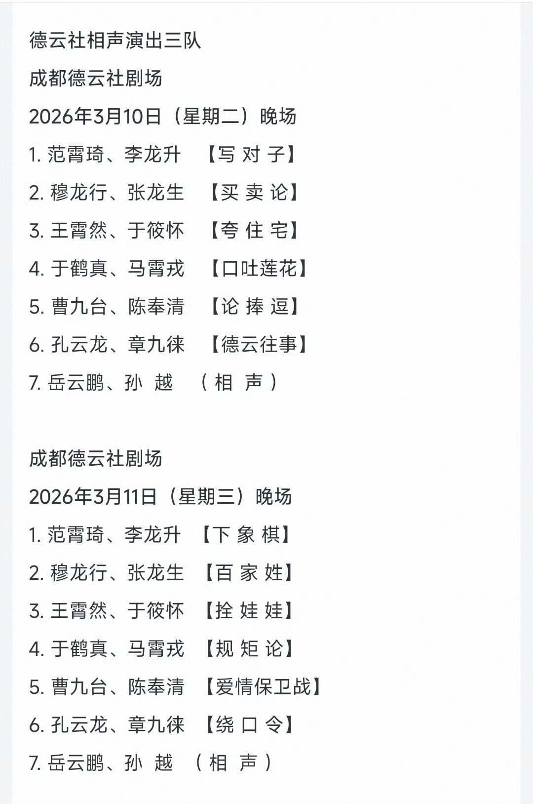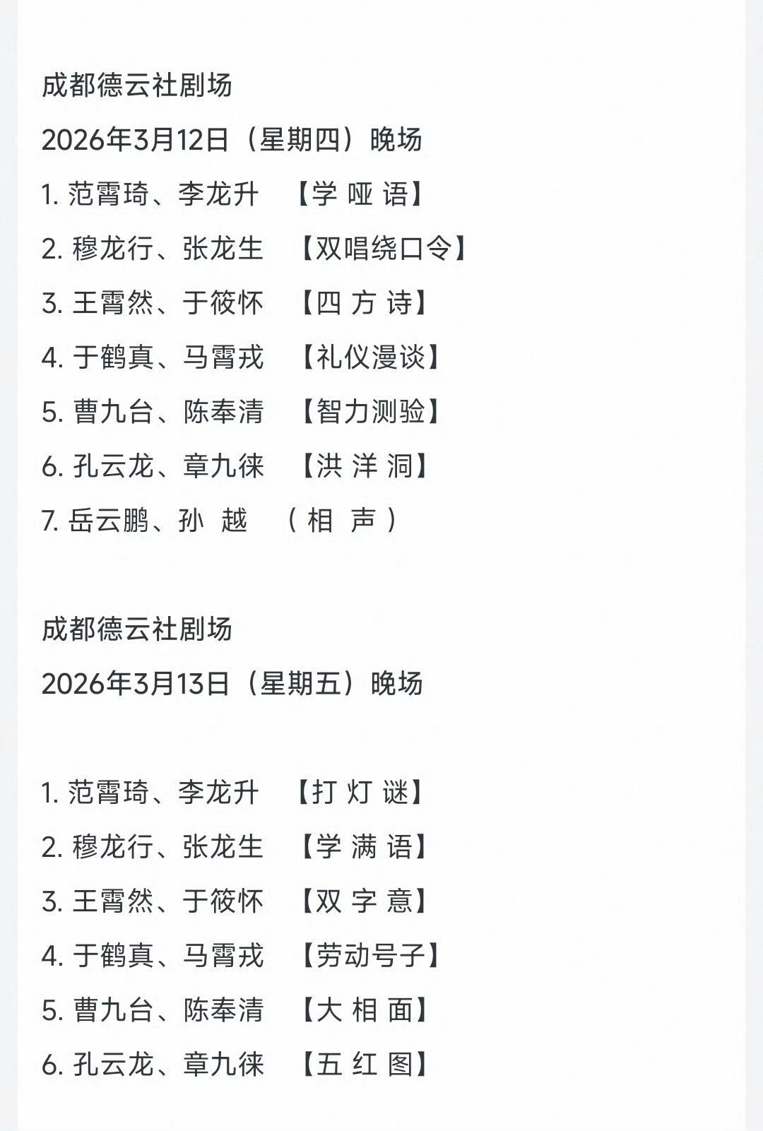 成都德云社开业节目单3月5日~8日开业演出阵容:郭德纲于谦,高峰栾云平,烧饼曹鹤阳,张九龄王九龙,靳鹤岚朱鹤松,张九南高九成3月10日、11日、12日岳云鹏孙越领衔演出3月13-15日孔云龙章九徕领衔德云三队演出