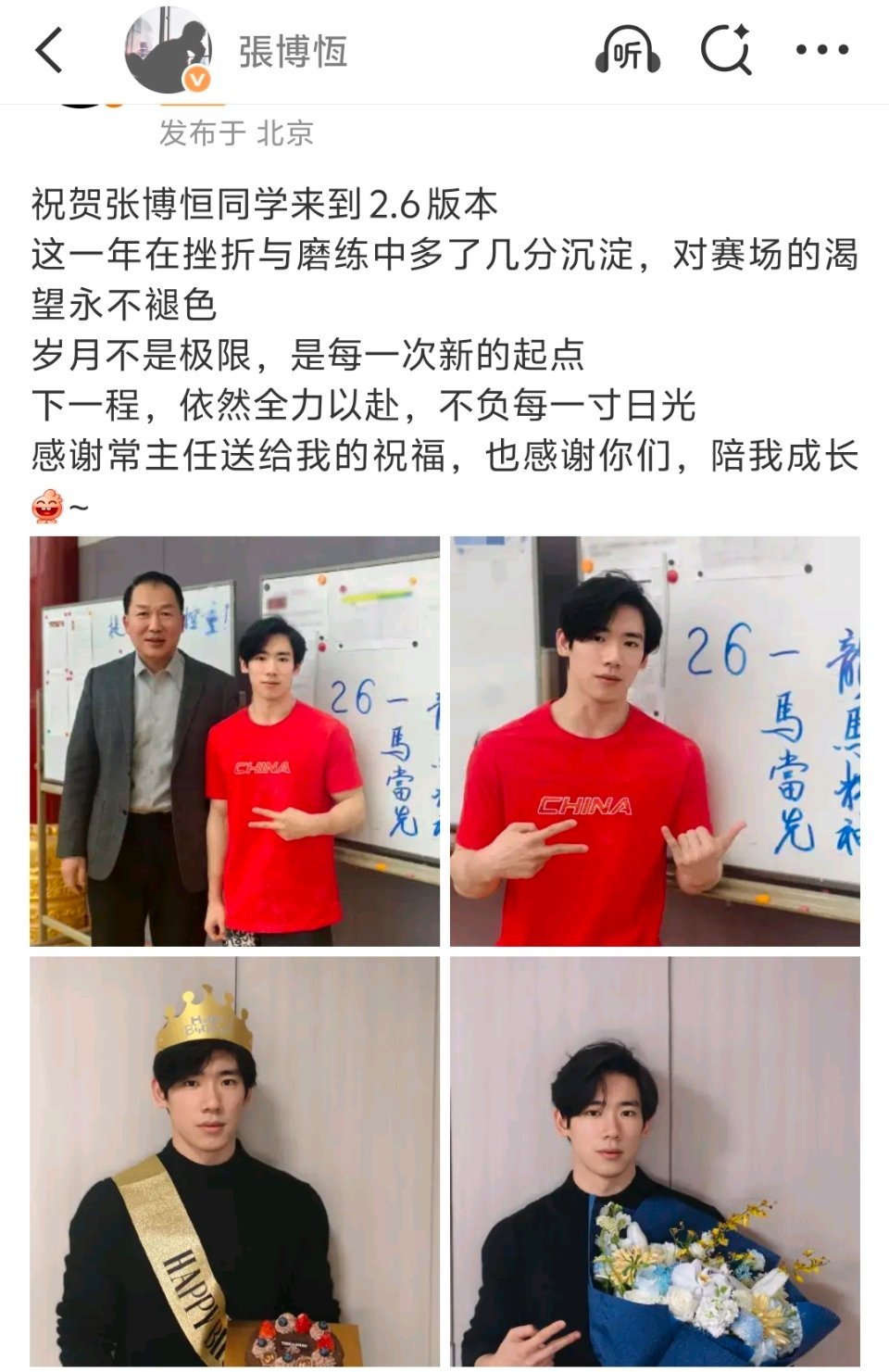 张博恒祝贺自己来到2.6版跟张博恒学到了,生日不说岁数,要说升级到了哪一个版本,祝2.6版本的茶茶越来越好 张博恒晒26岁生日照