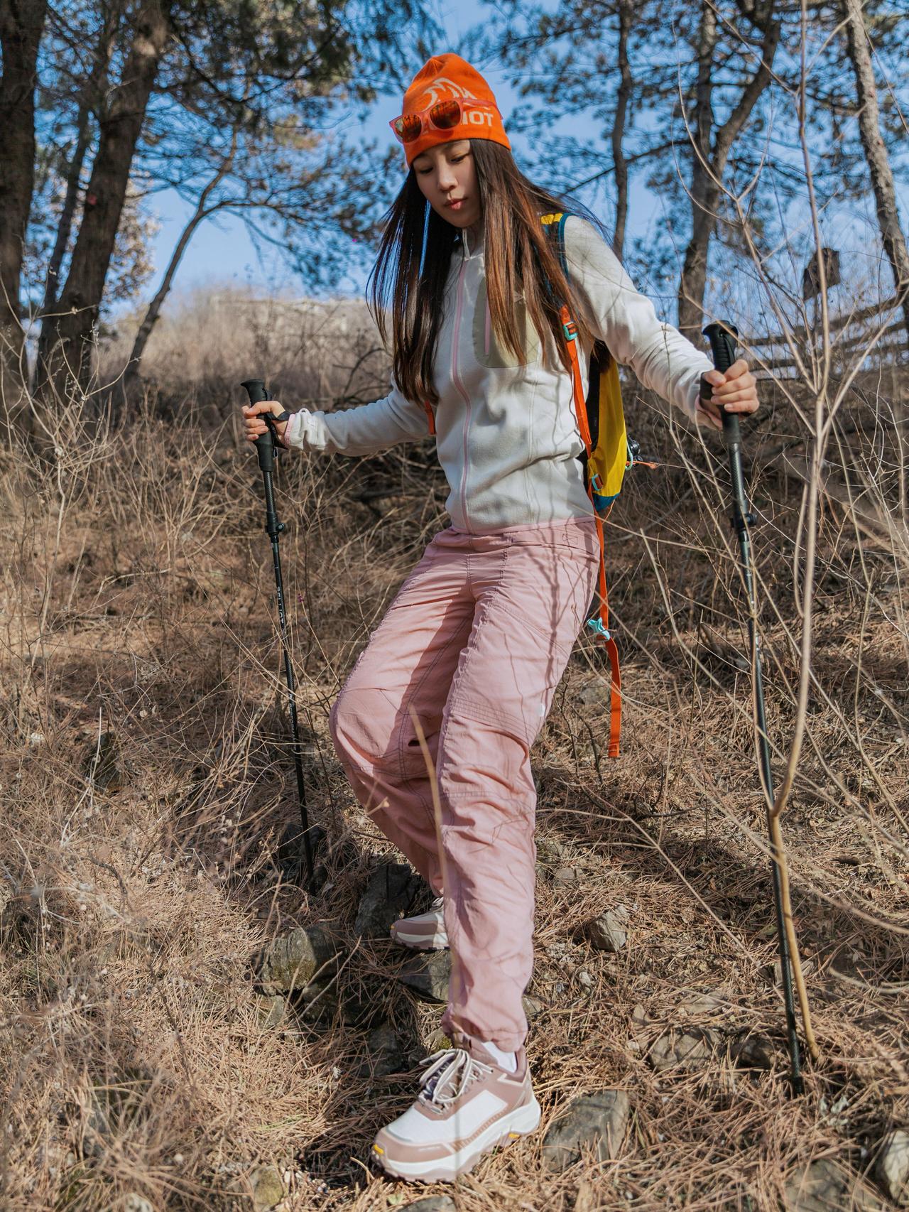 户外运动女孩享受山林徒步林间漫步爬山徒步旅行 运动休闲风穿搭
