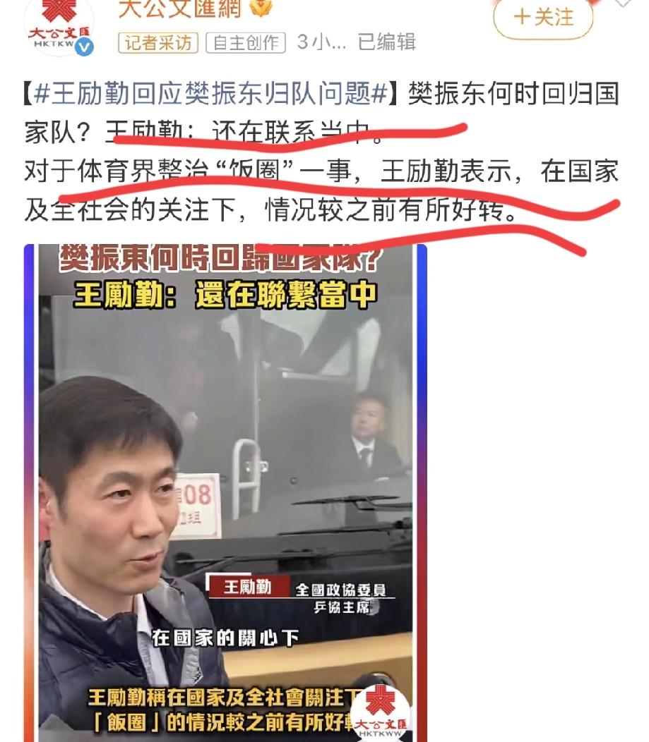 3月4日,王~励勤主席采访,回应东东是否会回归国家队,他说目前还在联系的过程当中! 然后,有记者问,饭~圈治理情况怎么样了?他回答说在国家的关心下面,在全社会的这个关注下,比之前还是有所好转! 问后面梯队建设是不是出现问题了?王主席回答,应该说目前大家都非常关注吧,一方面做好奥运会的备战宫泽,一方面加强后备梯队的建设,两方面要同时抓好! 不敢怎样,希望国乒越来越好[加油] 记录我的2026 乒乓球