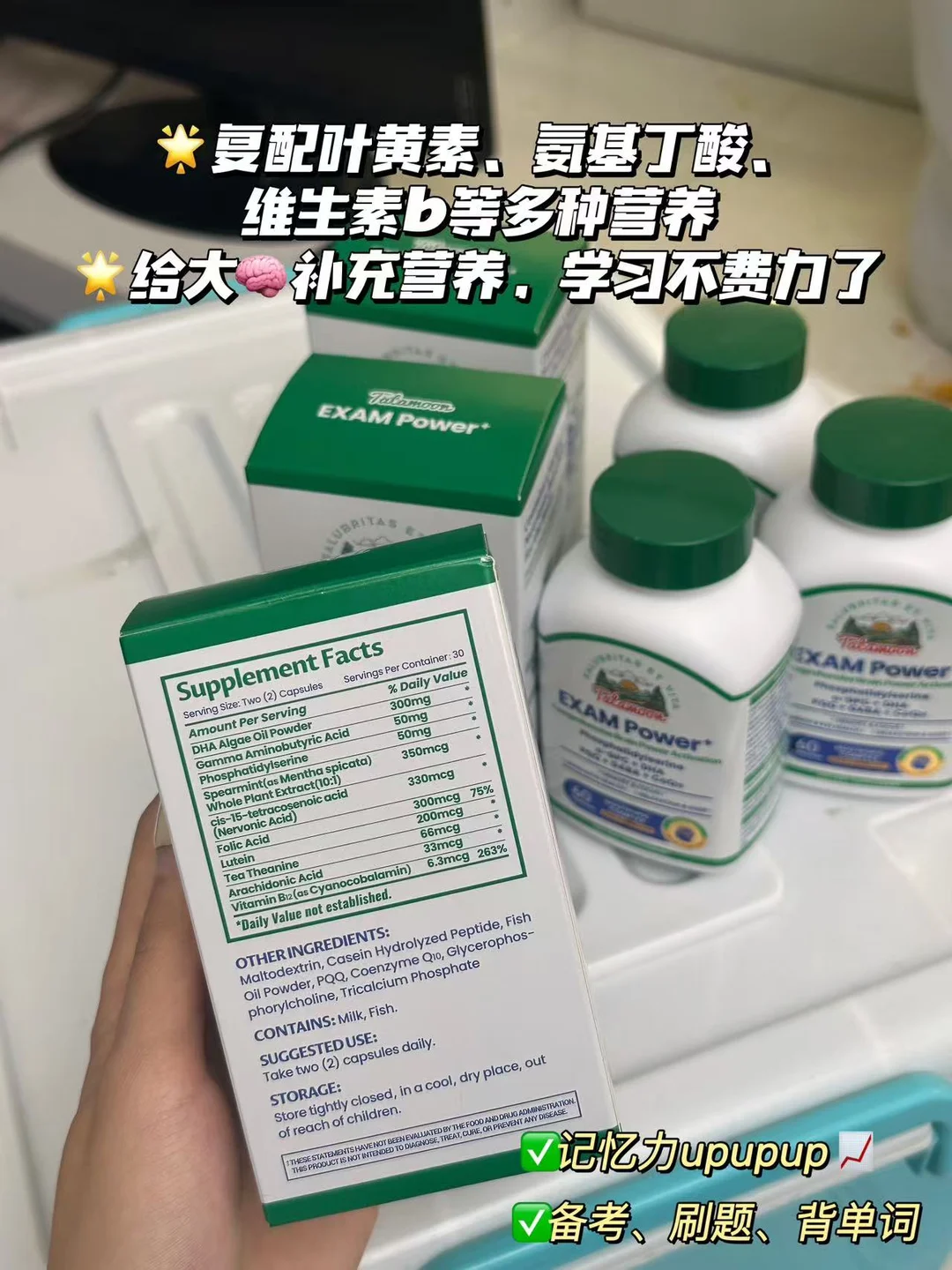 成分很实在:300mg藻油DHA+PS+神经酸,还搭配了叶黄素、氨基丁酸、维生素B族,一瓶顶好几样,不用我再费心搭配。