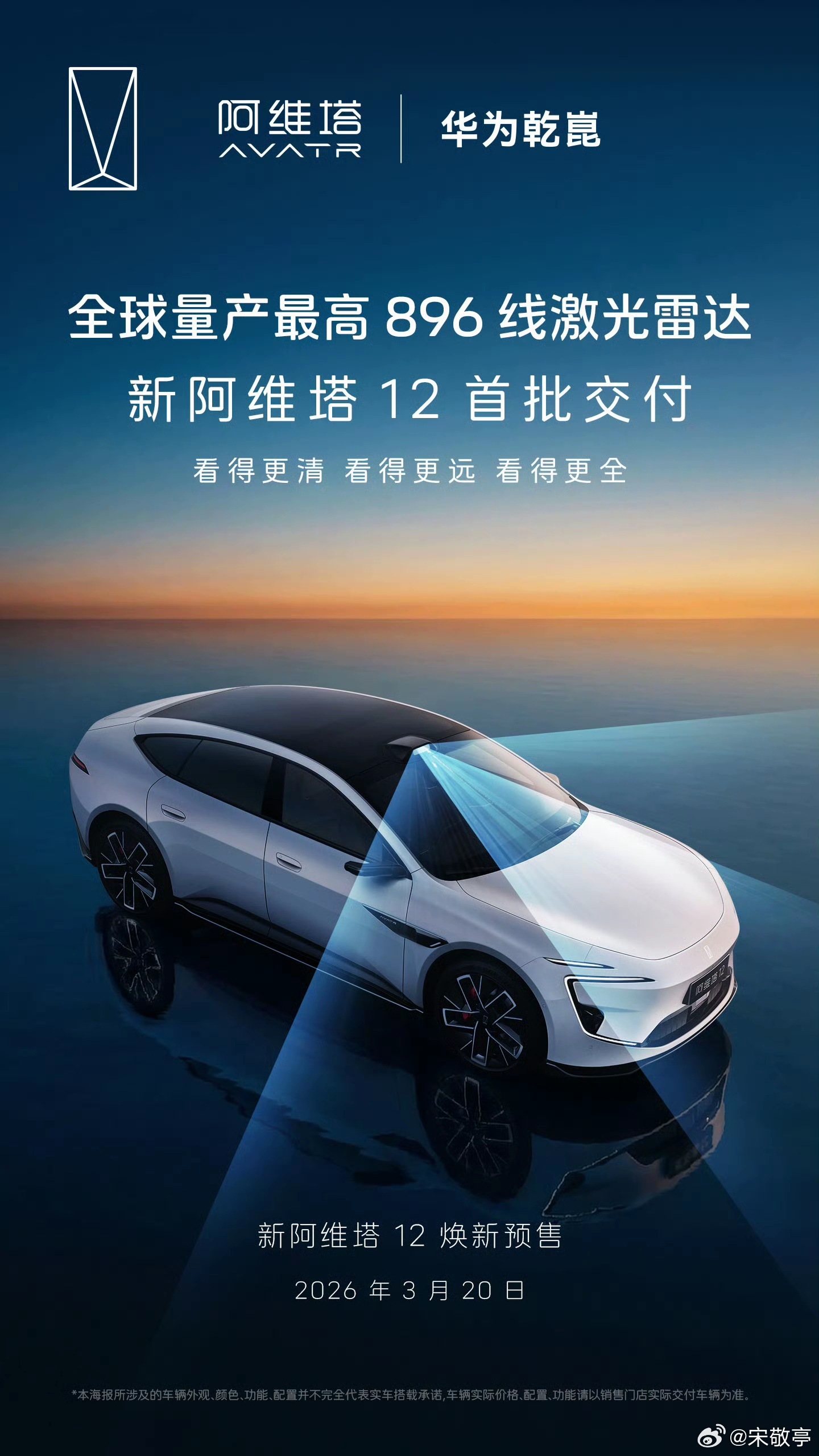 这颗激光雷达首创一体双焦架构,广角+长焦协同成像,分辨率提升4倍,120米外可精准识别14cm低矮障碍物,对低反射、异型障碍感知大幅增强,配合分布式4D毫米波雷达,全天候全场景安全拉满。同时新车搭载太行智控2.0,设计、内饰、豪华感全面升级,B柱新增华为乾崑标识,质感与科技感双在线。华系智驾顶流再进化,这波诚意直接拉满!新阿维塔12将3月20日预售新阿维塔12将首批交付华为最新896线激光雷达
