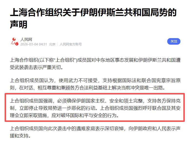 上合组织终于发声了! 估计是内部协调了半天才达成一致,表达对伊朗成员国的支持。只要上合组织达成一致,那么通过陆路通道伊朗就可以获得源源不断的物资,起码短时间内不会引起国内民众的动乱,这样政府就可以专心致志的对付美国和以色列的侵略! 这一次上合组织的公开表态,不是简单的外交客套,而是经过多轮内部沟通、充分协调立场之后,拿出的一份分量十足的集体立场文件。熟悉国际组织运作的朋友都知道,像上合这样覆盖多国、兼顾不同利益诉求的区域性组织,想要在重大国际危机面前形成统一口径,从来都不是一件容易的事。 每一句措辞、每一个立场,都要经过反复磋商,既要守住组织的基本原则,也要照顾到成员国的现实关切,正是因为经过了这样充分的内部磨合,最终发出的声音才更有分量,也更能代表亚欧大陆广大国家的共同心声。 伊朗作为上合组织的正式成员国,在遭遇外部军事打击、国家安全受到严重威胁的时刻,组织内部及时站出来明确声援,本身就是对成员国主权与安全最直接的守护。上合组织的核心宗旨,从来都是尊重各国主权、不干涉内政、反对使用武力,这不是针对某一个国家,而是维护整个地区和平稳定的底线。 当伊朗面临外部军事压力、国内局势出现波动时,上合的这份支持,就像一颗定心丸,让伊朗政府和民众感受到,自己不是孤立无援的,背后有一个坚持公平正义、守护多边秩序的组织在撑腰。 从现实层面来看,上合组织达成一致立场之后,最直接的利好就是陆路通道的稳定畅通。伊朗地处亚欧大陆腹地,与多个上合成员国陆地相连,这是天然的地理优势。在外部海上通道可能受到干扰、国际物流面临不确定性的情况下,稳定的陆路运输线,就是保障民生、稳定社会的生命线。 粮食、药品、能源物资、工业原料等关键物品,都可以通过陆路通道平稳送达,只要基本物资供应不断档,国内民众的正常生活就能得到保障,社会秩序自然会保持稳定,不会因为物资短缺引发不必要的动荡。 伊朗政府就能把更多精力放在应对外部军事挑衅、维护国家核心利益上,不用在内外压力之间疲于奔命。这种来自多边机制的支撑,看似是间接支持,实则是最扎实、最有效的后盾,让伊朗在面对强权施压时,更有底气、更有定力。 从国际格局来看,上合组织此时发声,也传递出一个清晰信号:单边主义、武力施压的老路,在当今世界已经行不通了。越来越多的国家认同多边主义,支持通过对话协商解决国际争端,反对动辄使用武力破坏地区稳定。 上合组织的立场,代表的不是一两个国家的想法,而是亚欧大陆众多国家的共同诉求,那就是尊重国际法、尊重各国主权、用和平方式化解冲突。这股力量,正在成为维护国际公平正义、遏制霸权行径的重要支撑。 对于伊朗而言,当前最需要的就是稳定的外部环境和可靠的后方保障。上合组织的支持,既守住了成员国之间相互支持的底线,也为伊朗缓解外部压力、稳定国内局势提供了关键助力。有了源源不断的物资保障,有了稳定的社会秩序,伊朗就能更从容地应对外部挑战,更坚定地捍卫国家的主权与尊严。而这一切,都源于上合组织内部的团结协作,源于多边机制在关键时刻展现出的责任与担当。 国际局势风云变幻,单边势力总想用武力打破秩序、制造动荡,但越来越多的国家选择站在公平正义一边,站在多边主义一边。上合组织此次的一致发声,就是最好的证明。它告诉世界,区域性组织有能力守护成员国的安全,有能力维护地区的和平稳定,有能力抵制霸权行径、捍卫国际法底线。 未来,随着上合组织内部合作不断深化,这种守护力量会越来越强,会为更多国家提供安全保障,为地区和平发展注入更多确定性。在这个充满变数的世界里,团结协作、相互支持,才是应对挑战、化解危机的最有效方式,而上合组织,正在用实际行动践行这一理念,为亚欧大陆的和平与发展筑牢坚实屏障。