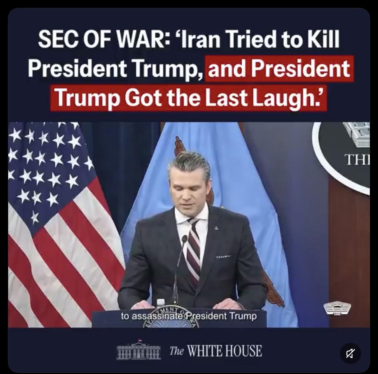 “昨天,企图刺杀特朗普总统的头目被追捕并击毙。伊朗试图刺杀特朗普总统,但特朗普总统笑到了最后。”——美国战争部部长赫格塞斯