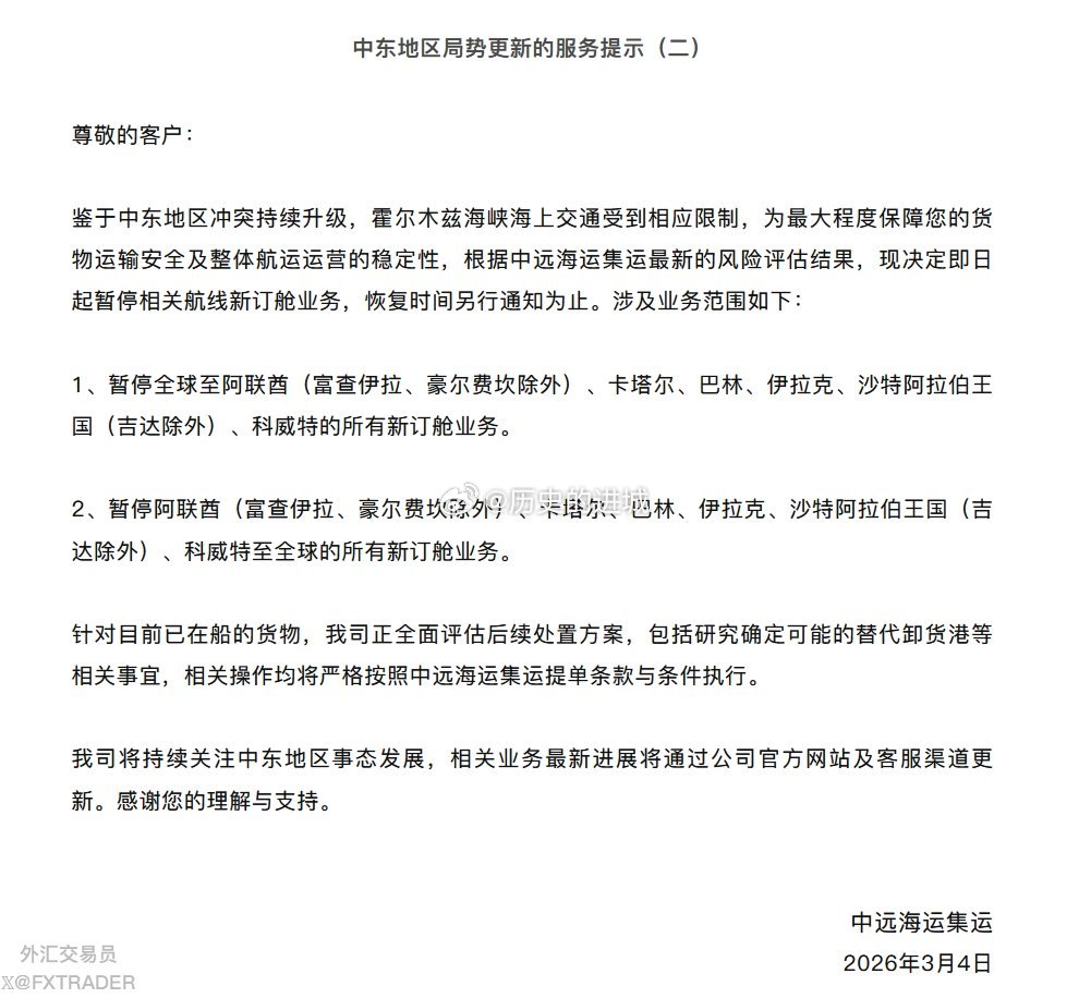 中东局势彻底失控 中国航运巨头中远海运运营着全球规模最大的油轮船队之一。该公司周三3月4日宣布,将从即日起暂停往返阿联酋、巴林、沙特阿拉伯、伊拉克和科威特等海湾国家的航运服务。中远海运补充称,目前正密切关注中东局势的发展。此前,其他国际航运巨头,包括马士基(Maersk)和地中海航运(MSC),也已宣布暂停在该地区的业务。